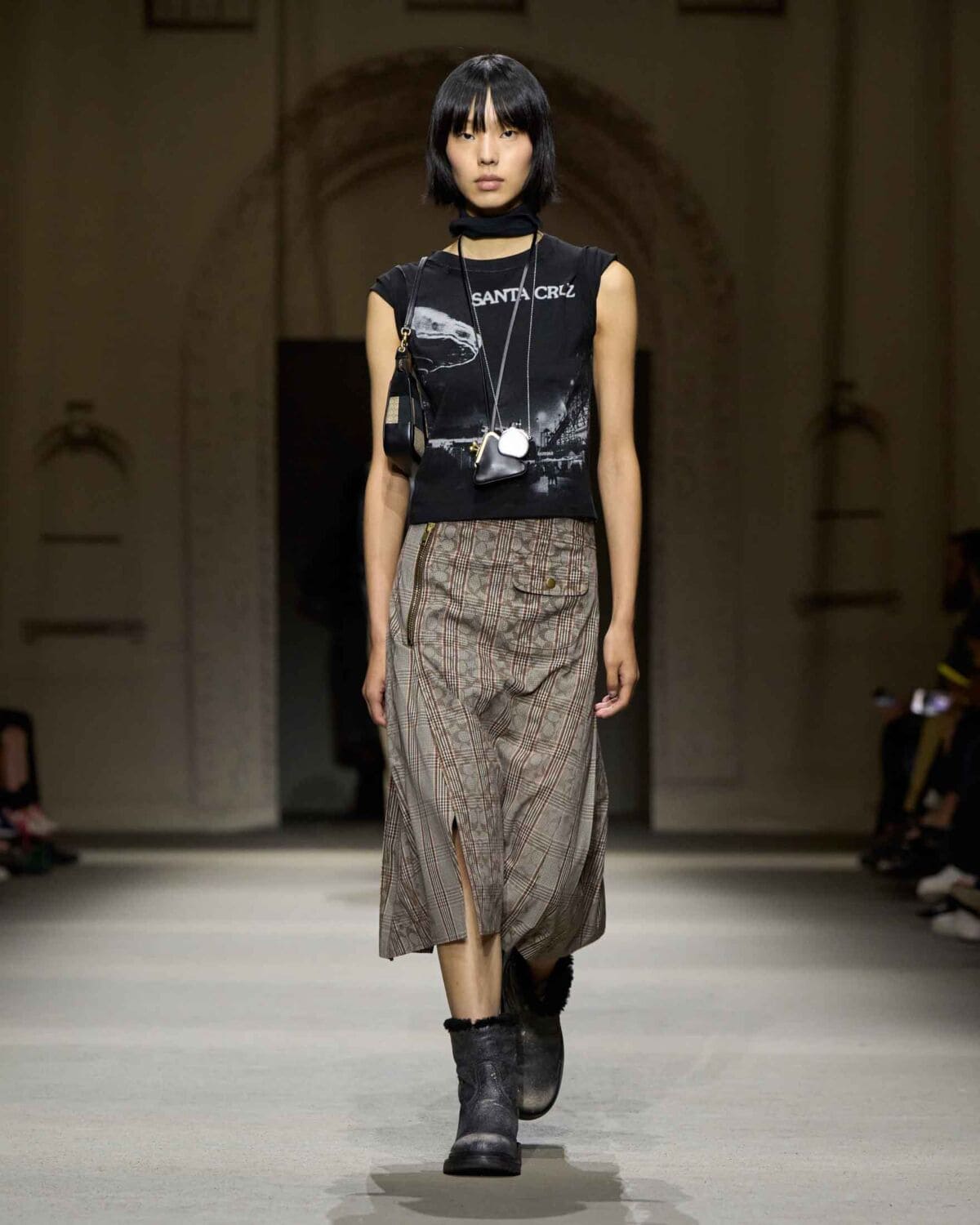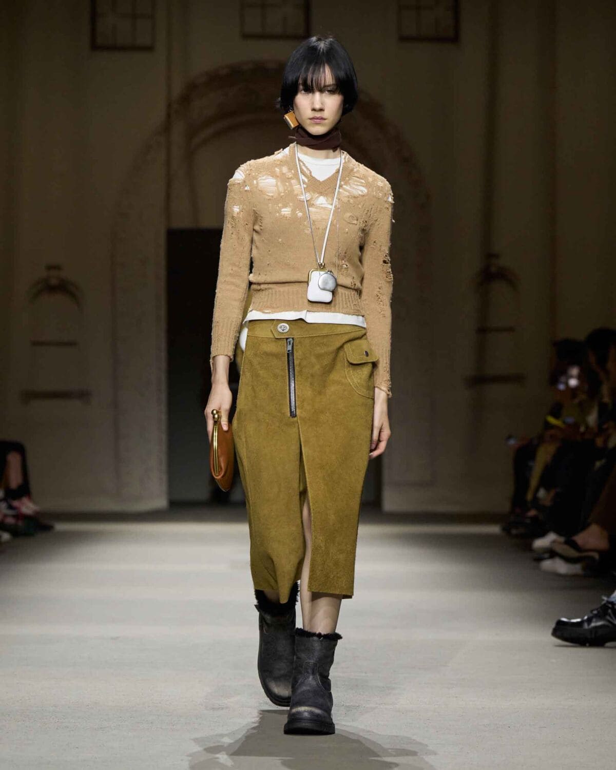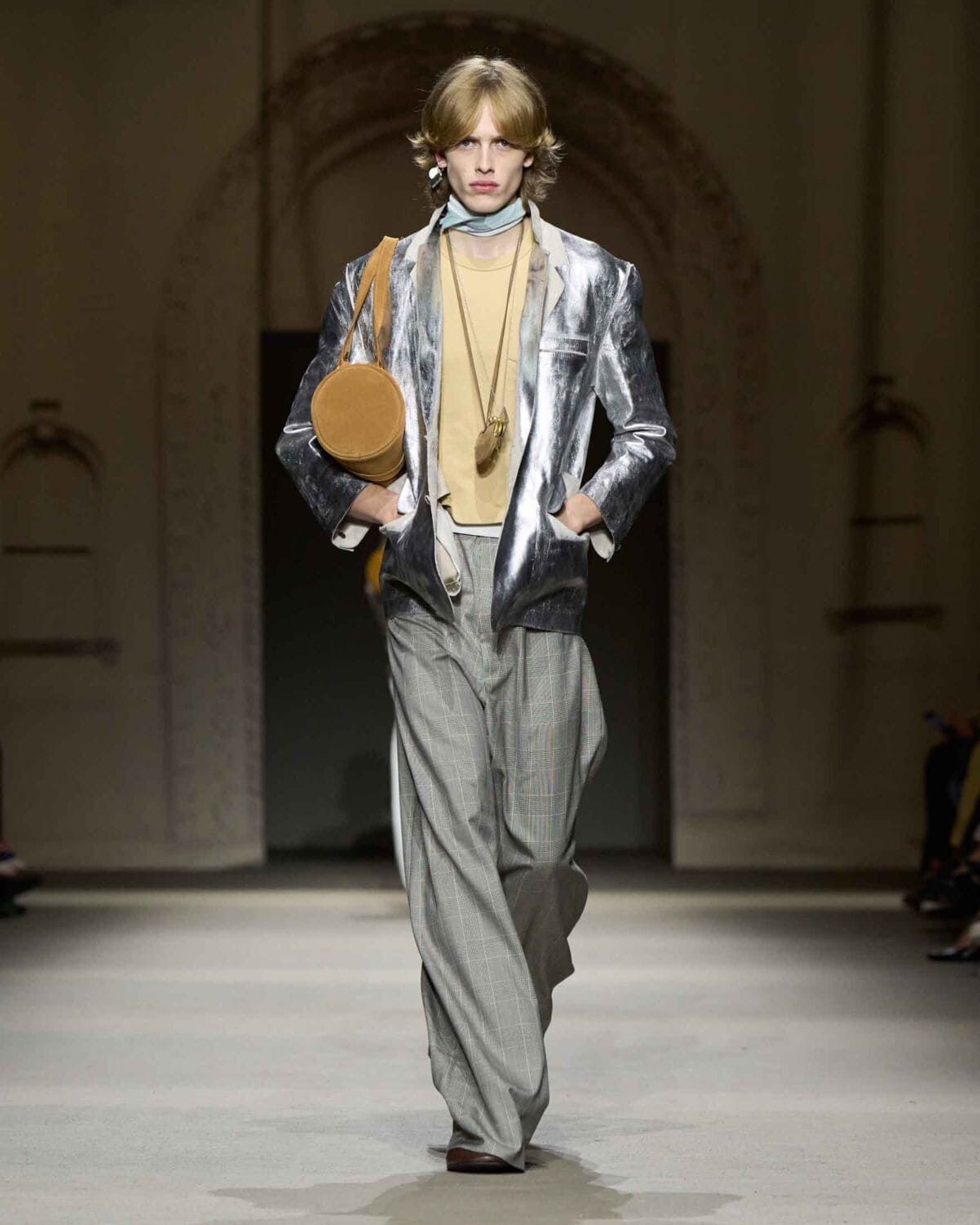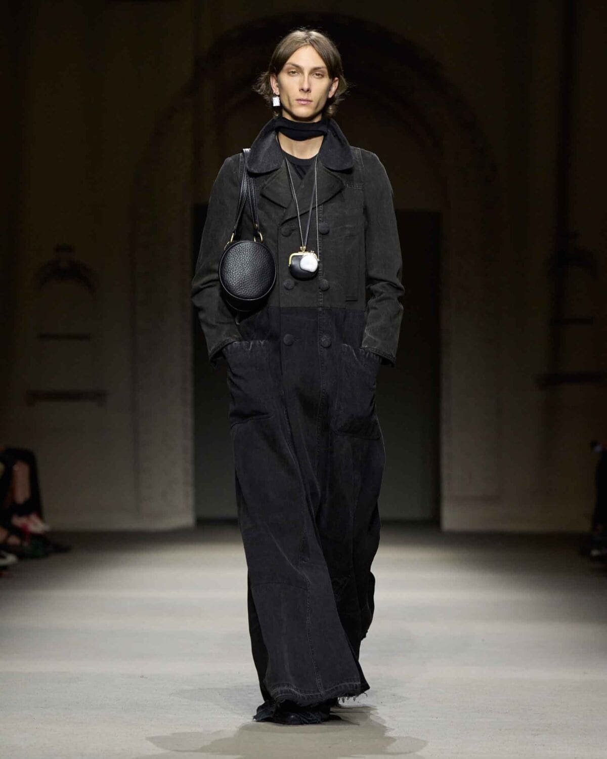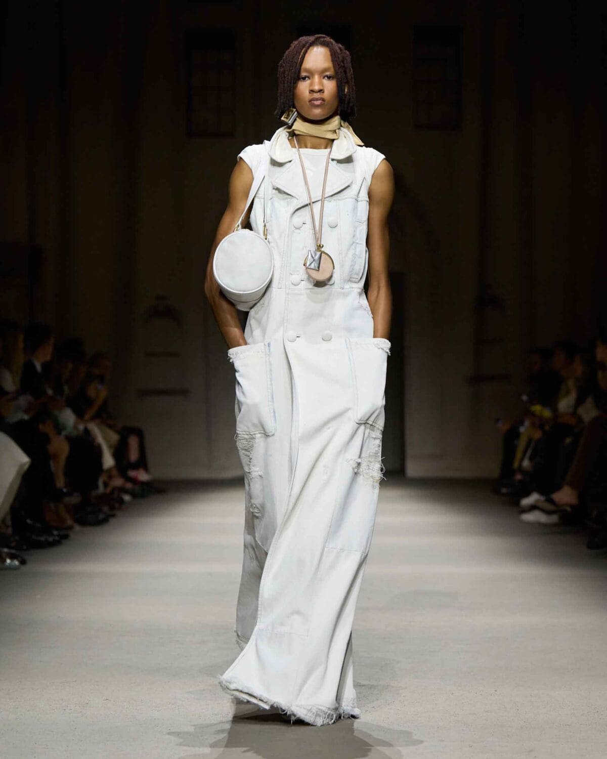 Every look came styled with a bag, the most prominent of them being the Kisslock Barrel Bag, which came in a variety of hues and is available, like, now. (Why wait?) There were also sizable satchels and coin purses worn as necklaces. Occasionally, a look featured a jaunty clip-on tie—the remnants of last night’s party, perhaps. The soundtrack, an extended remix of Elton John’s Yellow Brick Road, was orchestrated by the downtown darling of yore, Fabrizio Moretti of The Strokes (his bandmate Albert Hammond Jr was also seen sitting in the front row). Further down sat Soyeon, Koki, and Storm Reid. In a way, it was the ultimate passing of the torch.