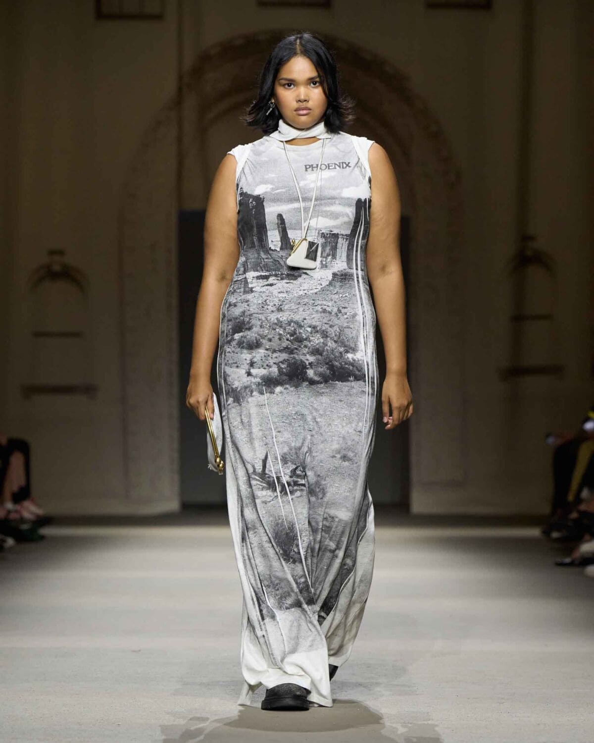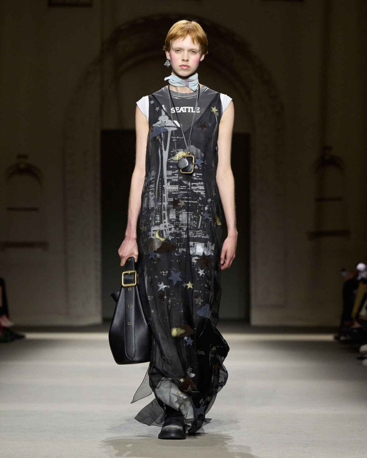 Those youthful flourishes were apparent in the clothing. The show opened with denim duster coats in black and white ( actress Elle Fanning wore a whitewashed version in the front row), followed by slinky sleeveless t-shirts, and dresses with black and white prints of postcard-esque cityscapes of NY, Santa Cruz, and Phoenix. For the finale, the dresses featured tulle overlay embroidered with hearts, stars, and balloons (oh my!). There were suede midiskirts worn with artfully tattered sweaters and slouchy skater punk jeans that scraped the floor.