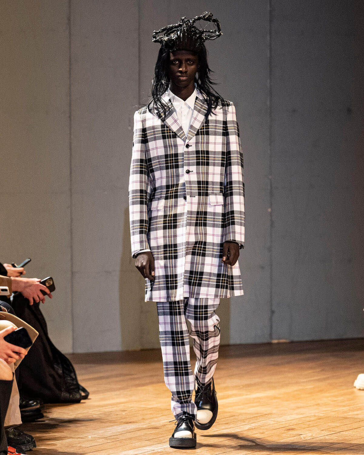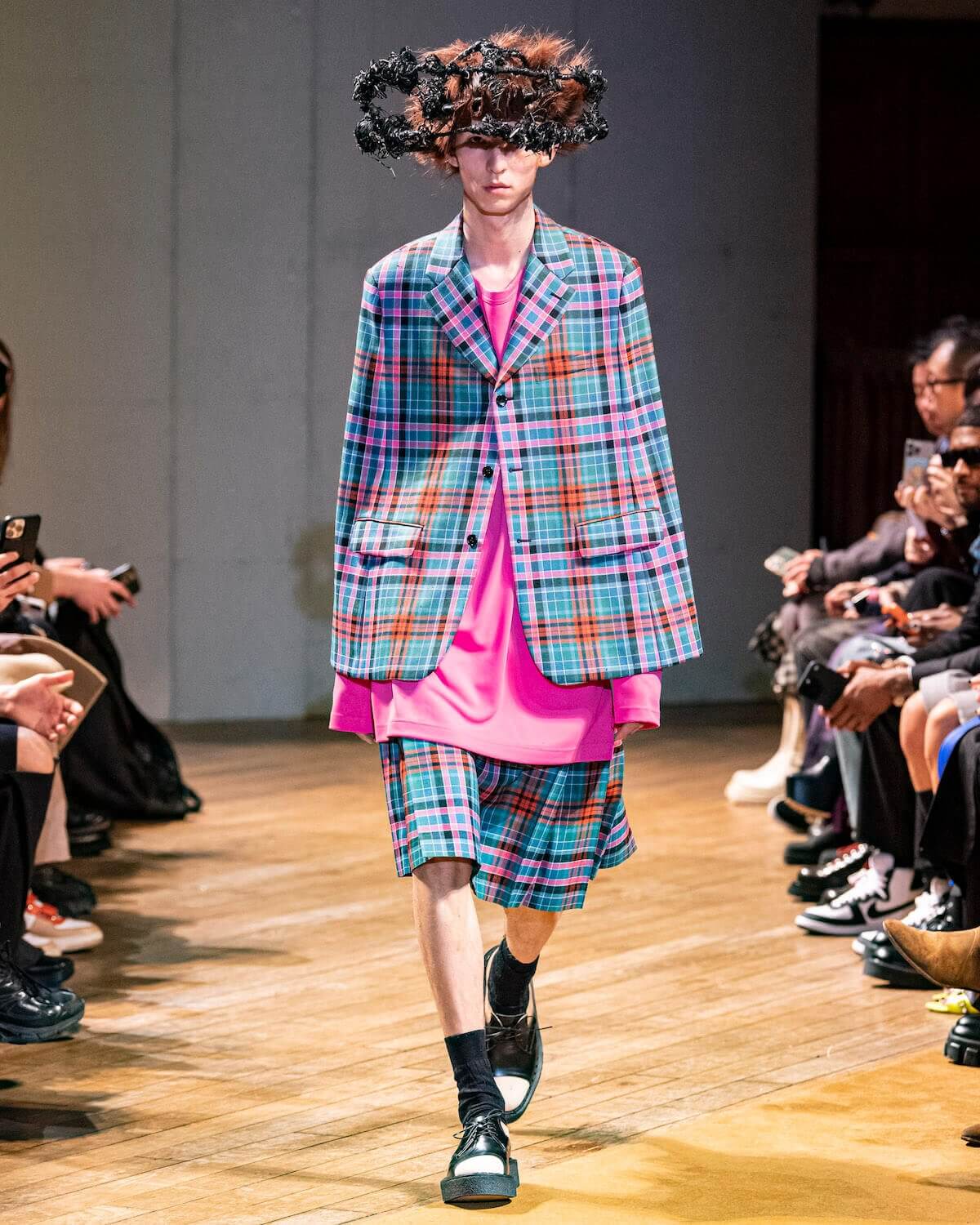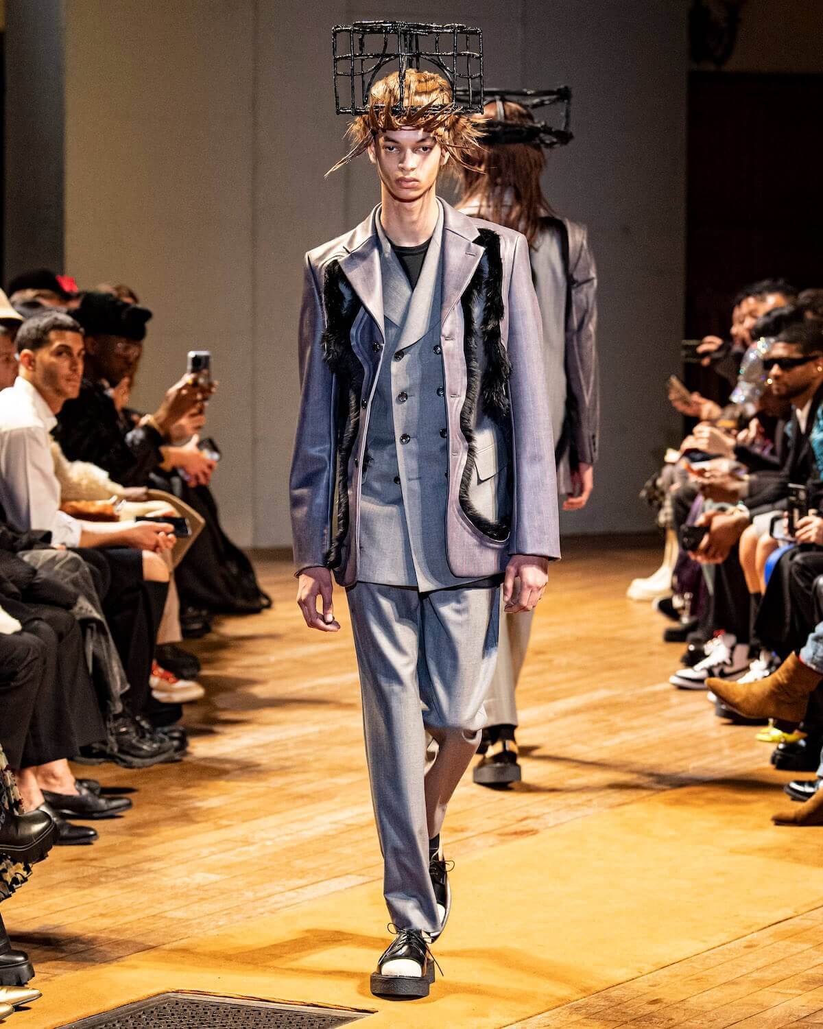 Rei Kawakubo obviously wasn’t going to follow the memo. As one of fashion’s true greats, she has used her Comme des Garçons Homme Plus collections to push the limitations of tailoring to new, enticing extremes. Her AW23 outing was no different, as suit jackets grew extra limbs and came with hairy cut-outs to expose a second blazer underneath. Kawakubo called it “Tailoring of the Avant-Garde”, fashioning her experimental suiting in pastel pinks and blues, punchy tartans and a metallic silver that made garments look like they’d been dunked in mercury. She worked with Toronto-born artist Edward Goss, who decorated slender overcoats and bulging blazers in what appeared to be notebook scrawlings. The look was completed with gelled-up bed heads and architectural crowns envisioned by Gary Card and Valériane Venance. If it’s a season of smartening up, Kawakubo does it with punk attitude.