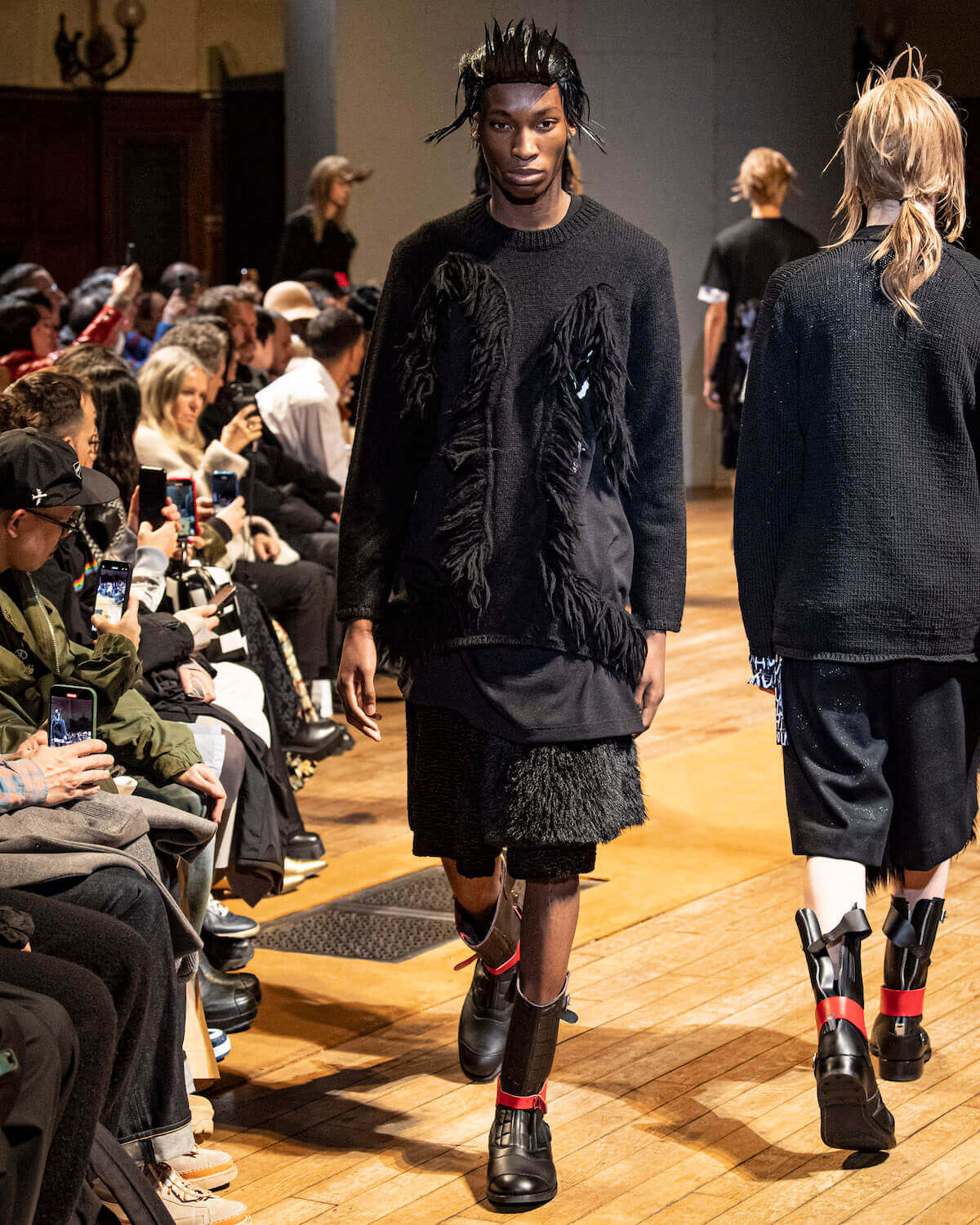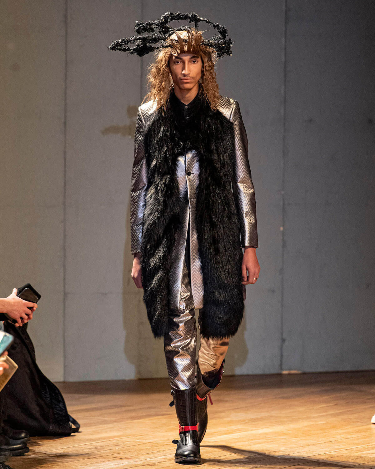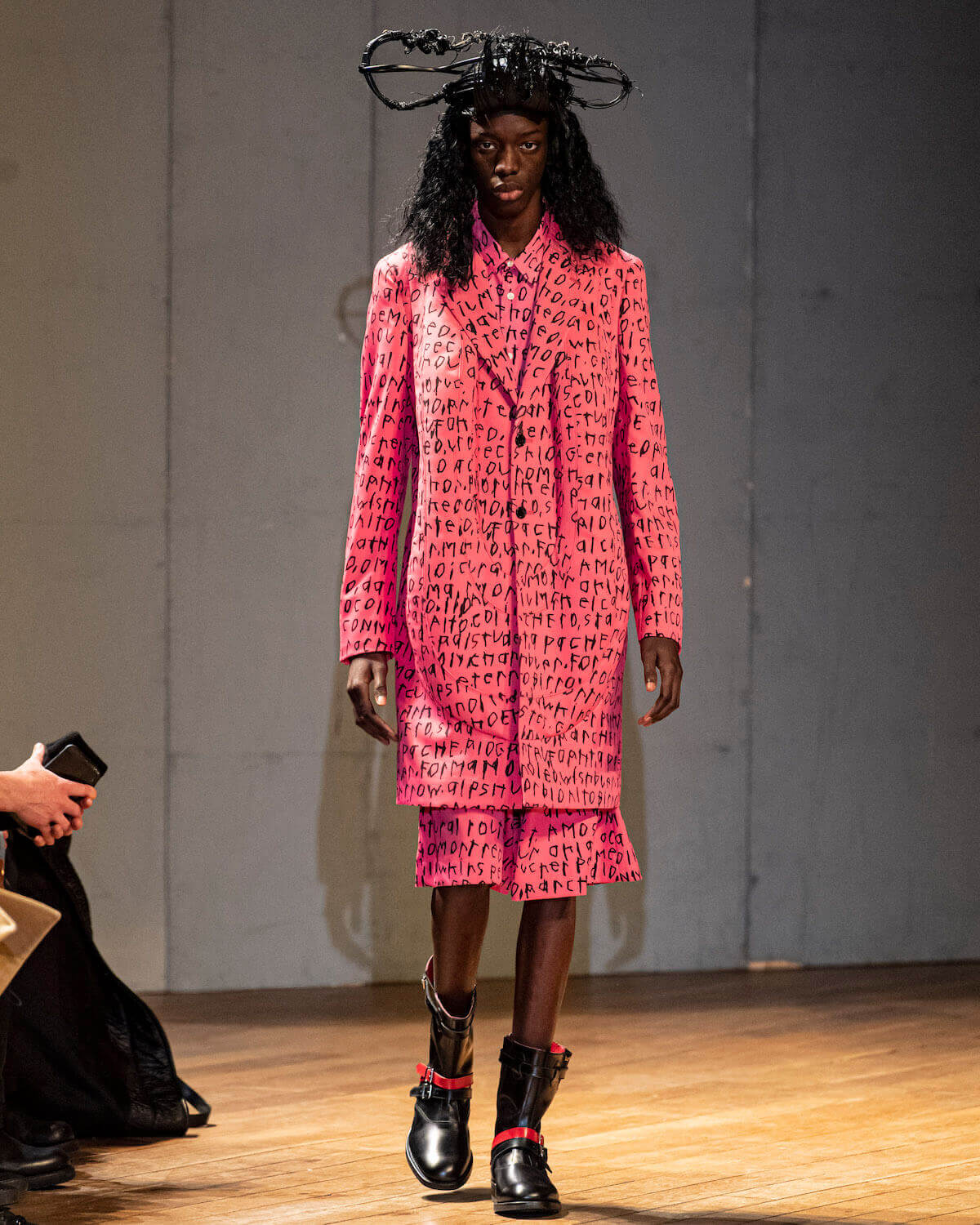 Rei Kawakubo obviously wasn’t going to follow the memo. As one of fashion’s true greats, she has used her Comme des Garçons Homme Plus collections to push the limitations of tailoring to new, enticing extremes. Her AW23 outing was no different, as suit jackets grew extra limbs and came with hairy cut-outs to expose a second blazer underneath. Kawakubo called it “Tailoring of the Avant-Garde”, fashioning her experimental suiting in pastel pinks and blues, punchy tartans and a metallic silver that made garments look like they’d been dunked in mercury. She worked with Toronto-born artist Edward Goss, who decorated slender overcoats and bulging blazers in what appeared to be notebook scrawlings. The look was completed with gelled-up bed heads and architectural crowns envisioned by Gary Card and Valériane Venance. If it’s a season of smartening up, Kawakubo does it with punk attitude.