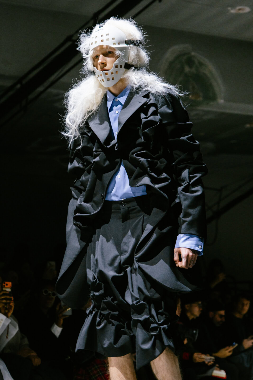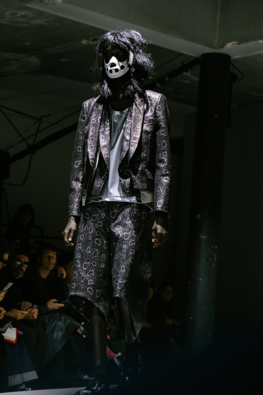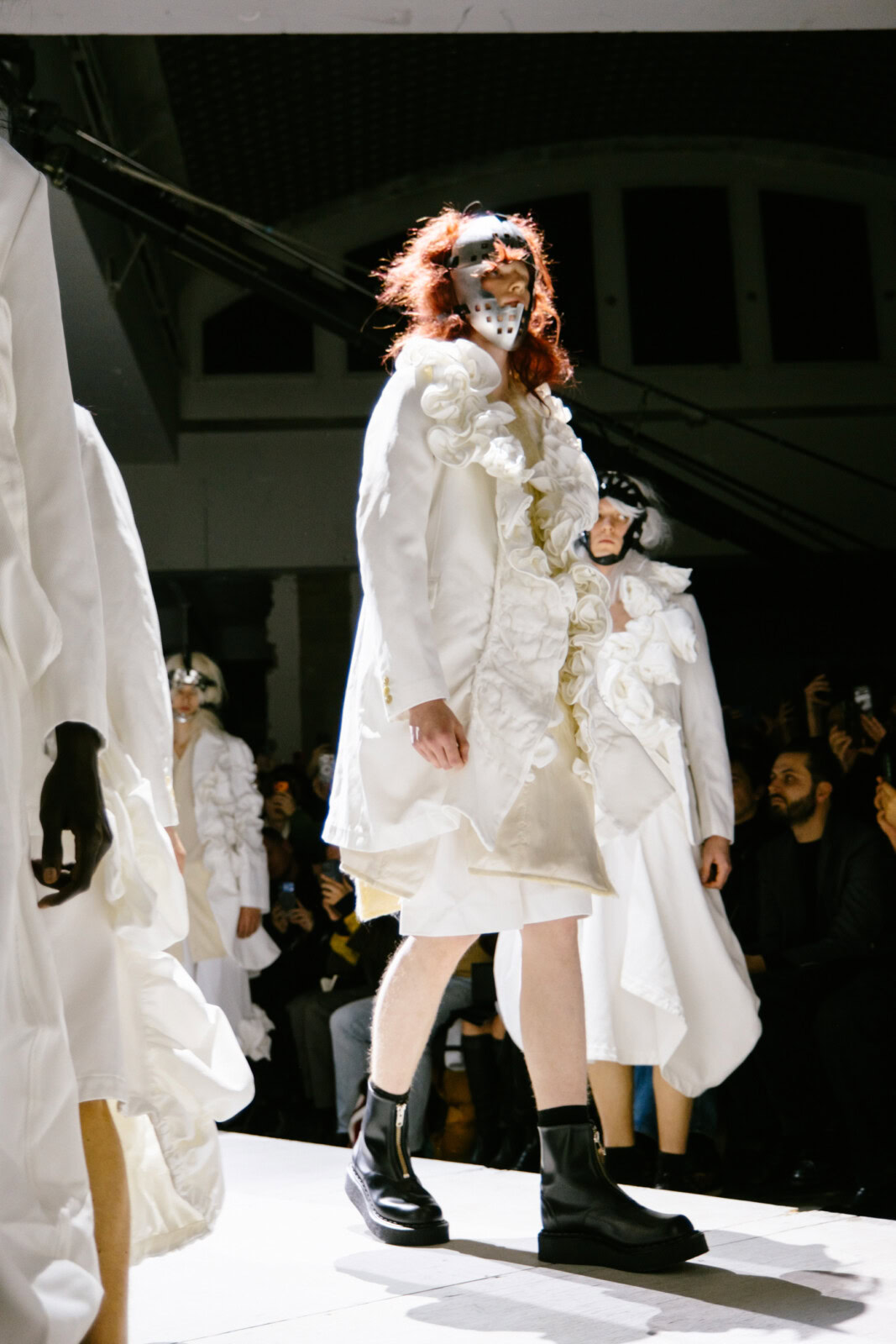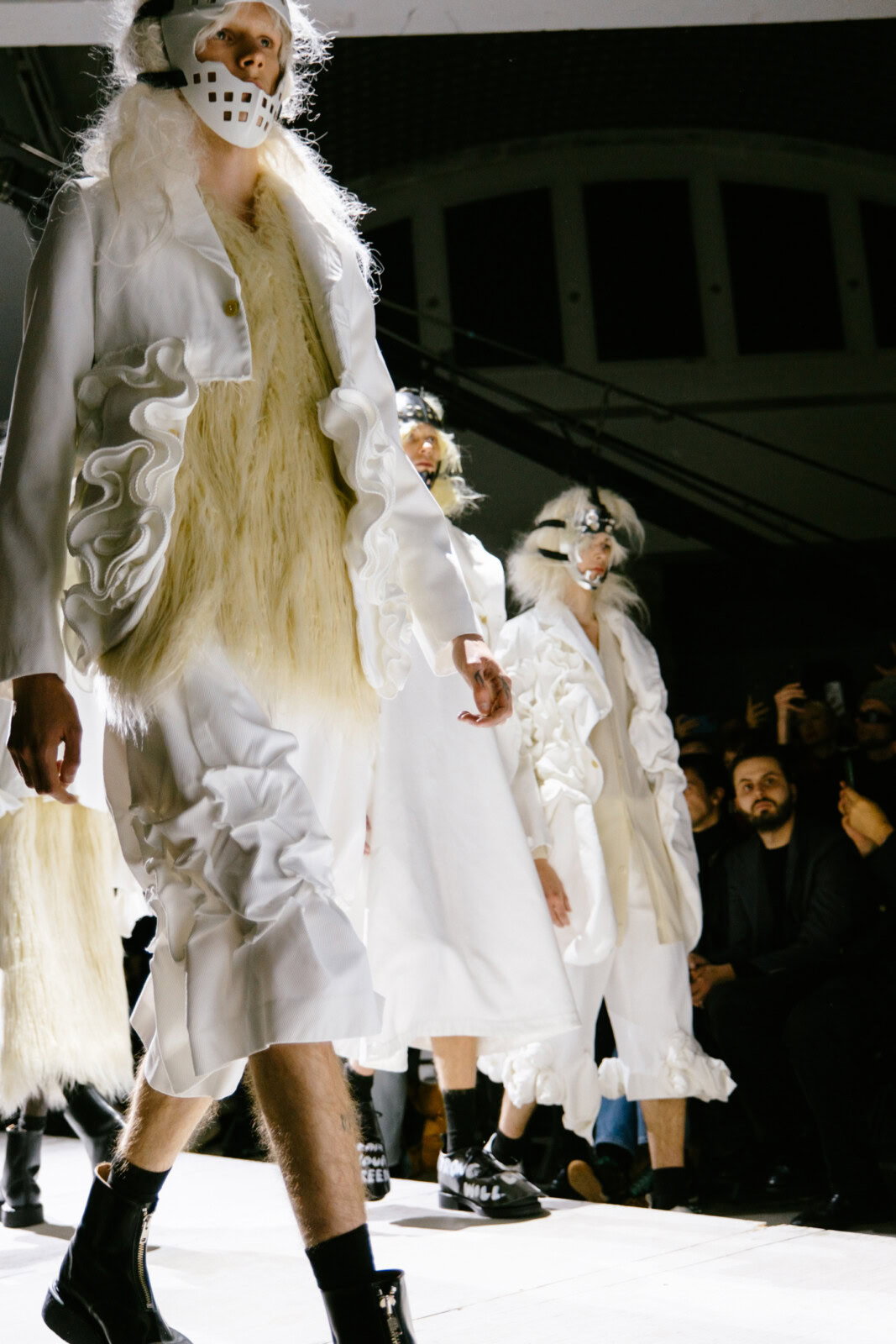 Models came with frazzled wigs and hockey masks that looked a little bit like Hannibal Lecter’s. Their clothes, however, weren’t menacing at all. Some suits came cut in shiny silver fabrics, others in gentle brocades. A focal point was the classic men’s tuxedo which was retooled in a variety of ways. Blazers were sliced in half to expose the midriff or came with cut outs at the back and were elongated to echo the silhouette of a tailcoat. Sometimes trousers were replaced with school boy shorts and shirts were swapped out for dresses that stretched beyond the knee. The most beautiful moment, however, were a series of all white looks that came out in unison to close the show. The suits were scrunched and warped into ruffles what looked like flower bulbs beginning to blossom. A sense of hopelessness, in bloom.