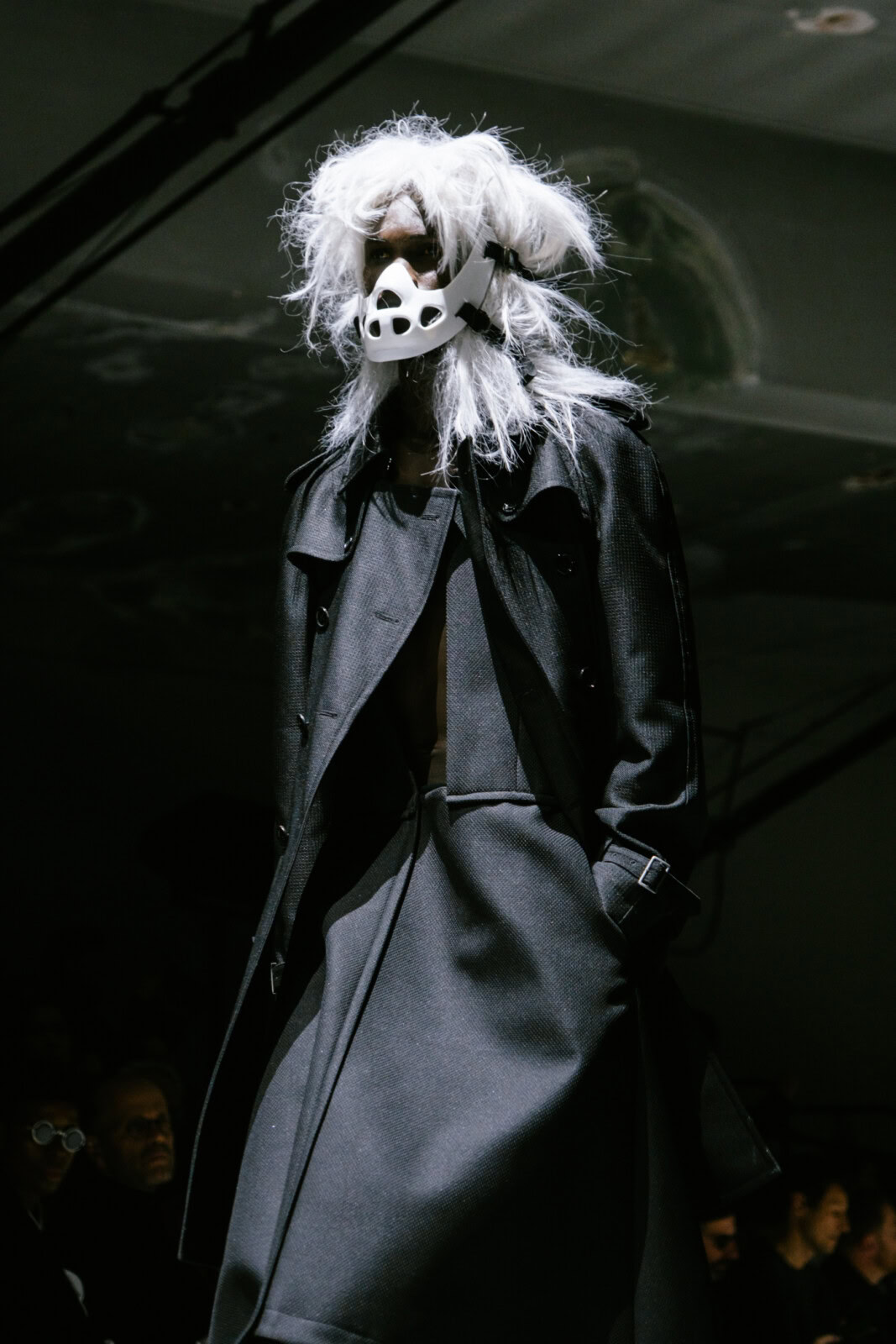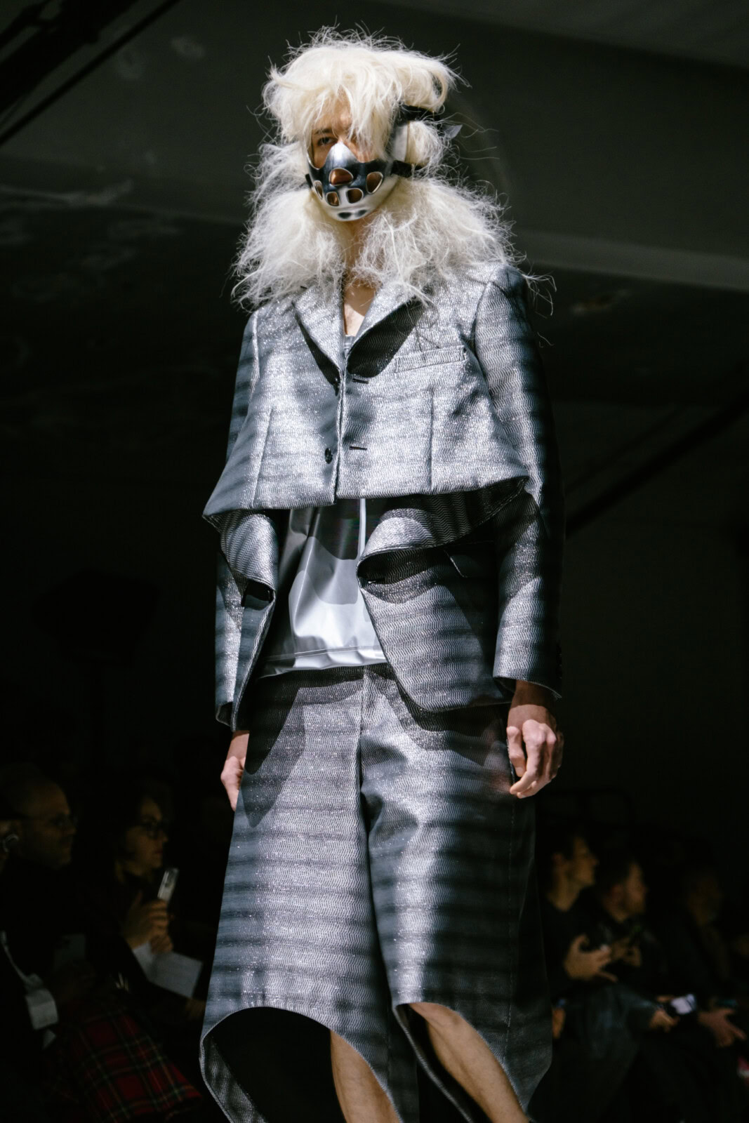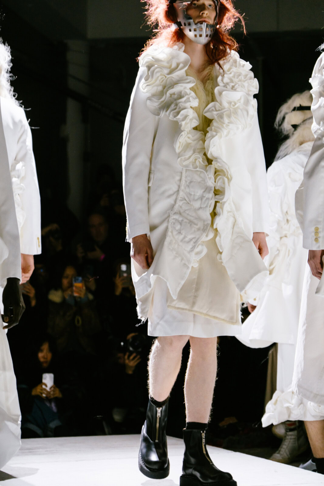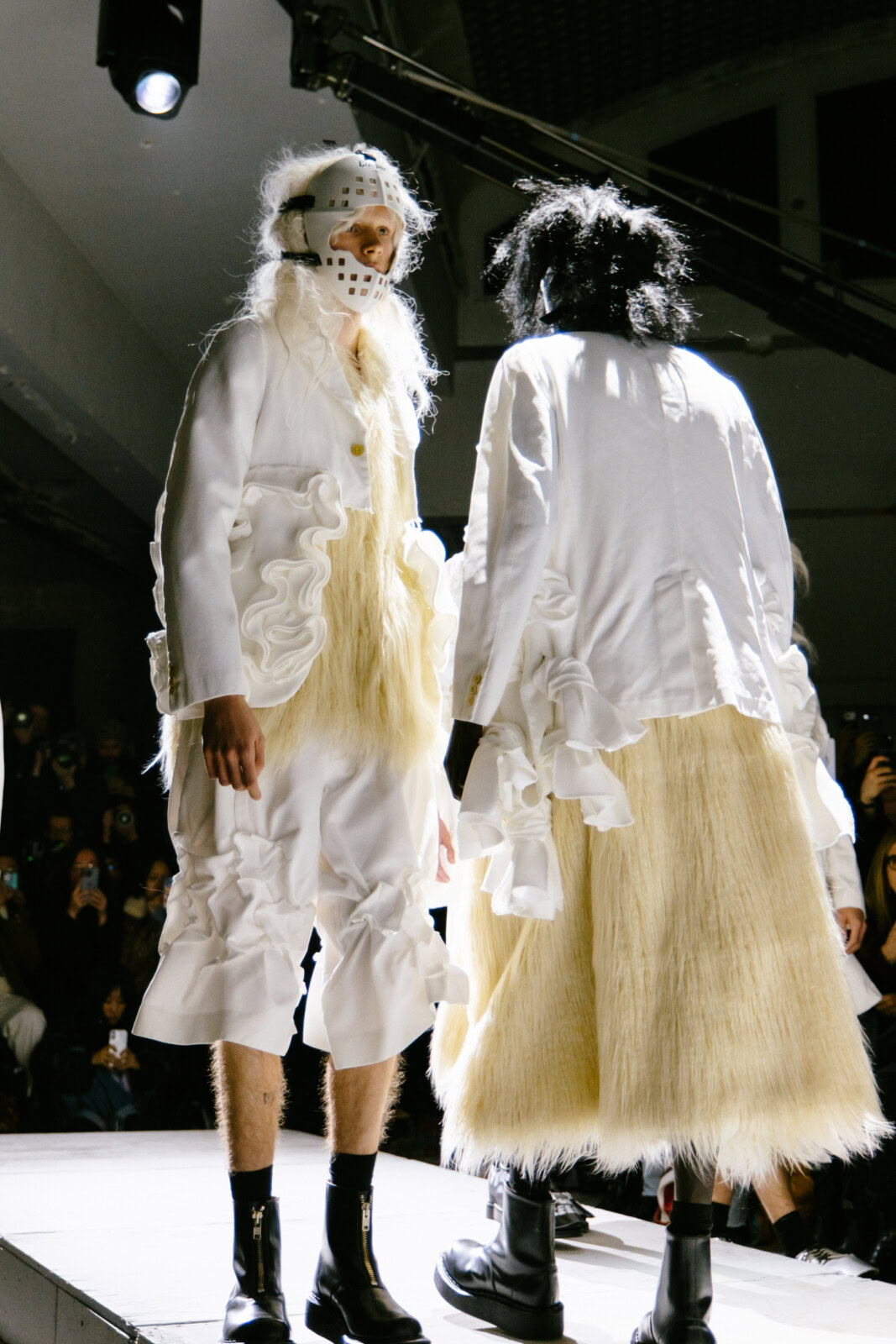 Models came with frazzled wigs and hockey masks that looked a little bit like Hannibal Lecter’s. Their clothes, however, weren’t menacing at all. Some suits came cut in shiny silver fabrics, others in gentle brocades. A focal point was the classic men’s tuxedo which was retooled in a variety of ways. Blazers were sliced in half to expose the midriff or came with cut outs at the back and were elongated to echo the silhouette of a tailcoat. Sometimes trousers were replaced with school boy shorts and shirts were swapped out for dresses that stretched beyond the knee. The most beautiful moment, however, were a series of all white looks that came out in unison to close the show. The suits were scrunched and warped into ruffles what looked like flower bulbs beginning to blossom. A sense of hopelessness, in bloom.