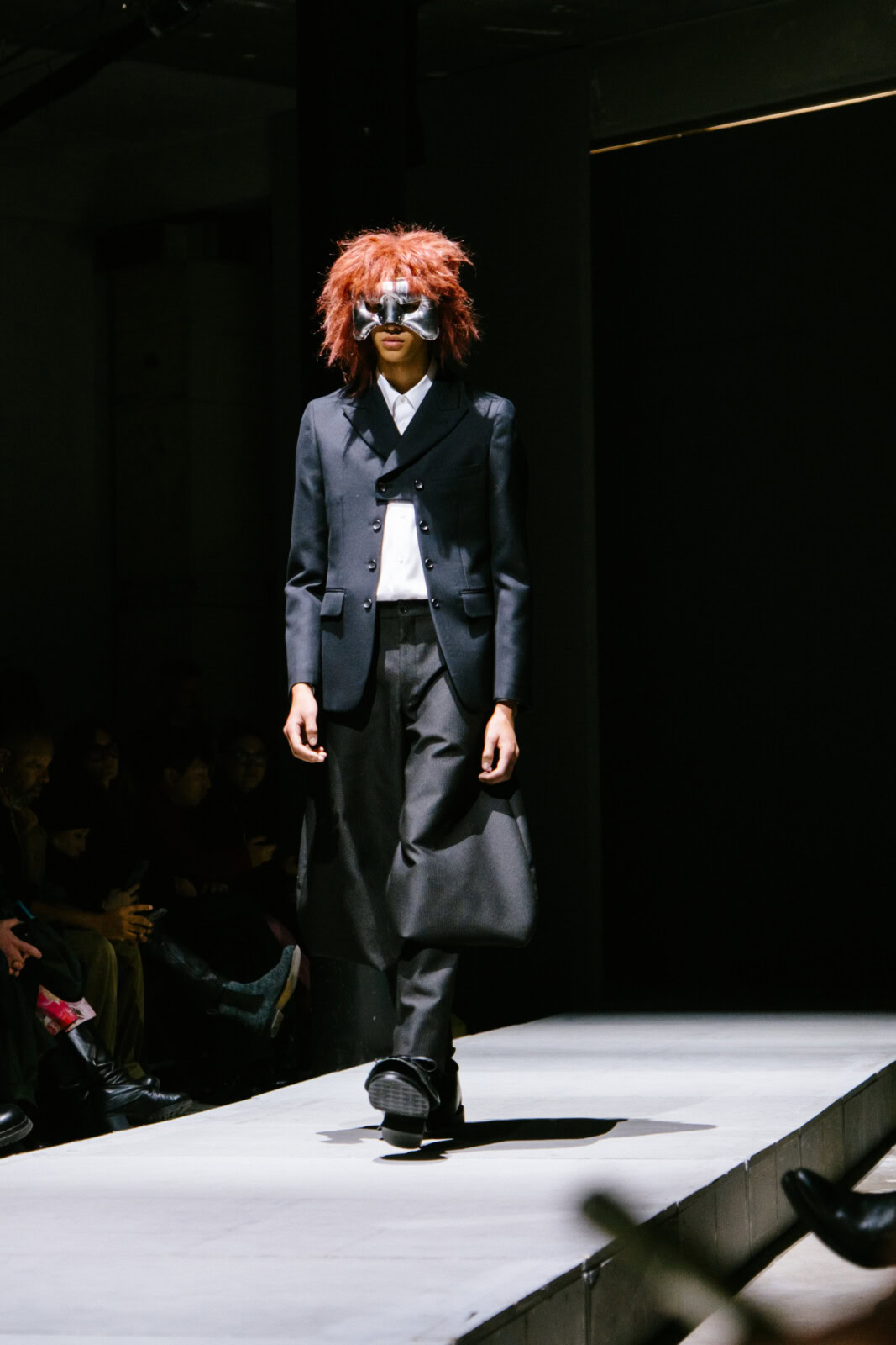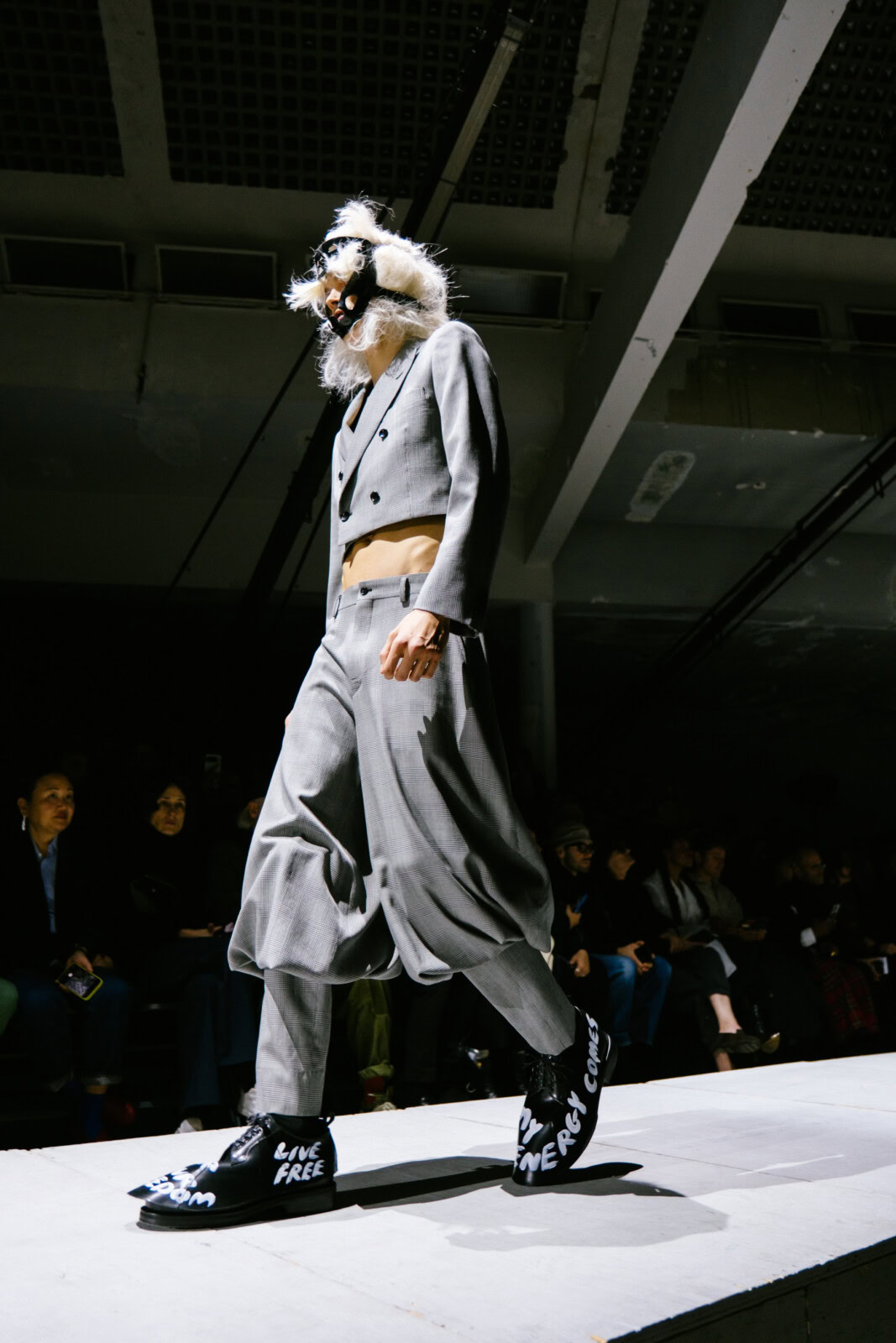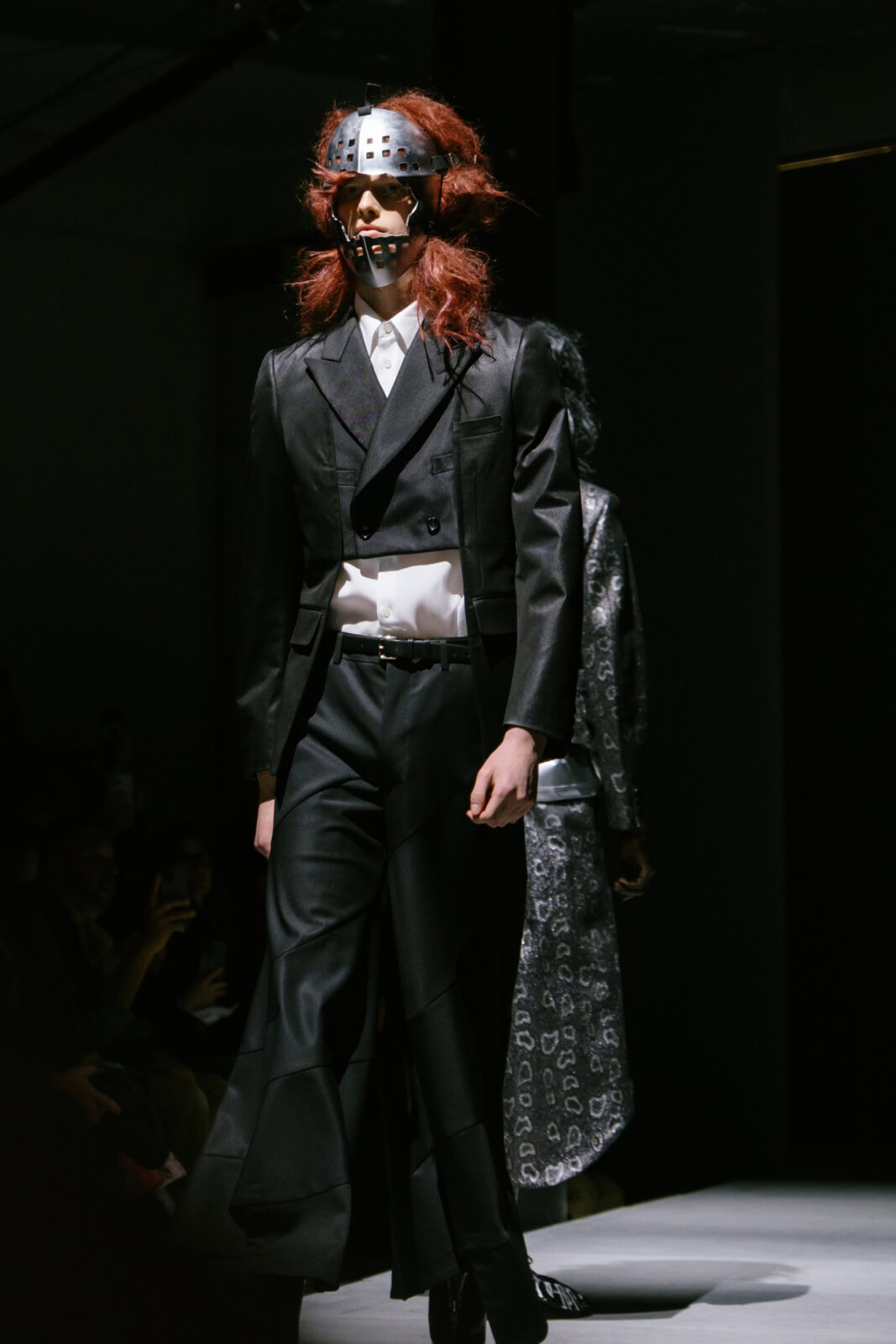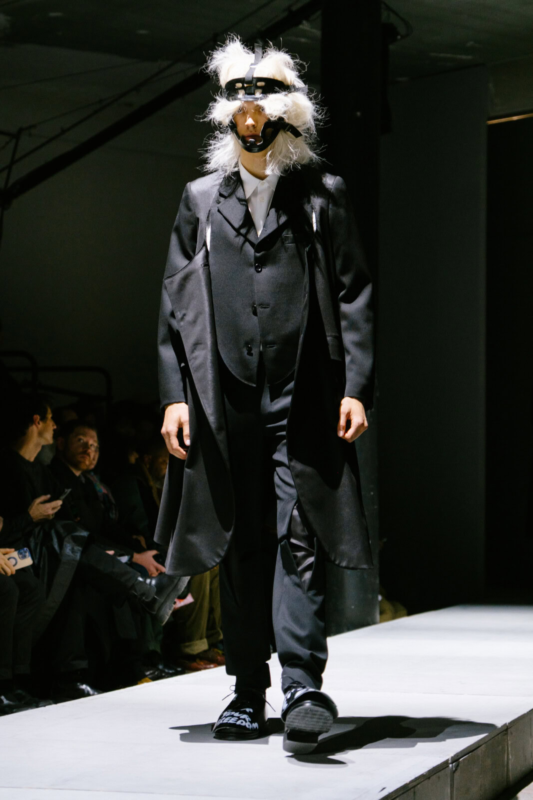 Models came with frazzled wigs and hockey masks that looked a little bit like Hannibal Lecter’s. Their clothes, however, weren’t menacing at all. Some suits came cut in shiny silver fabrics, others in gentle brocades. A focal point was the classic men’s tuxedo which was retooled in a variety of ways. Blazers were sliced in half to expose the midriff or came with cut outs at the back and were elongated to echo the silhouette of a tailcoat. Sometimes trousers were replaced with school boy shorts and shirts were swapped out for dresses that stretched beyond the knee. The most beautiful moment, however, were a series of all white looks that came out in unison to close the show. The suits were scrunched and warped into ruffles what looked like flower bulbs beginning to blossom. A sense of hopelessness, in bloom.