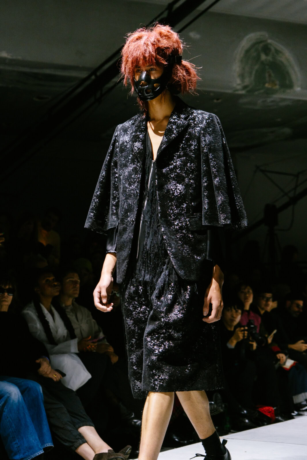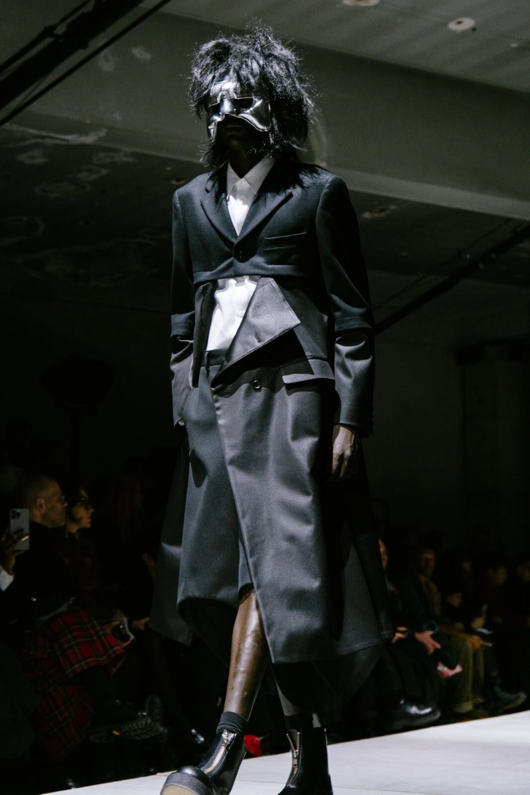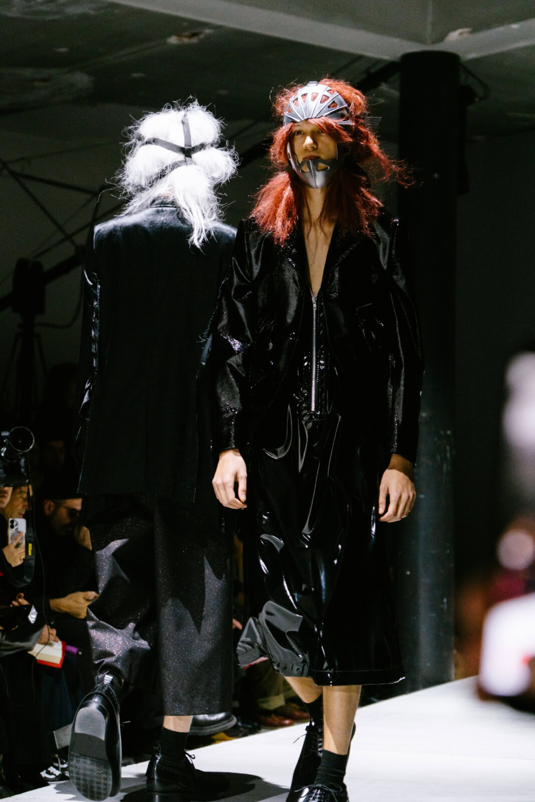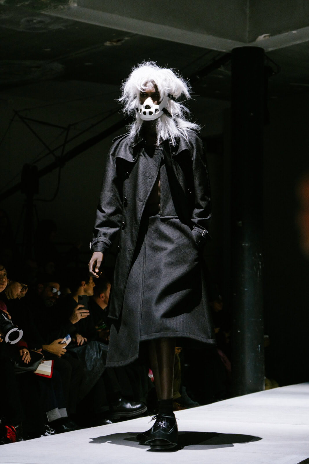 Models came with frazzled wigs and hockey masks that looked a little bit like Hannibal Lecter’s. Their clothes, however, weren’t menacing at all. Some suits came cut in shiny silver fabrics, others in gentle brocades. A focal point was the classic men’s tuxedo which was retooled in a variety of ways. Blazers were sliced in half to expose the midriff or came with cut outs at the back and were elongated to echo the silhouette of a tailcoat. Sometimes trousers were replaced with school boy shorts and shirts were swapped out for dresses that stretched beyond the knee. The most beautiful moment, however, were a series of all white looks that came out in unison to close the show. The suits were scrunched and warped into ruffles what looked like flower bulbs beginning to blossom. A sense of hopelessness, in bloom.