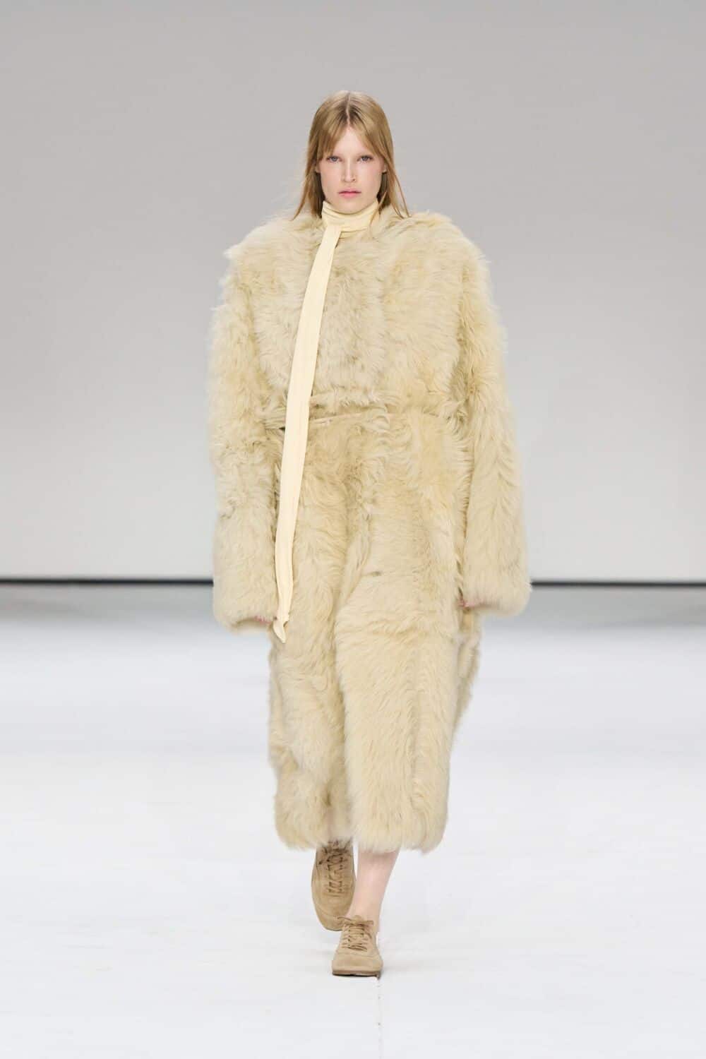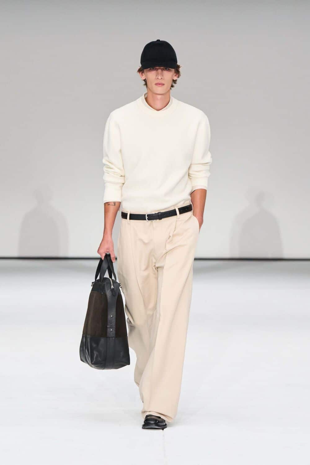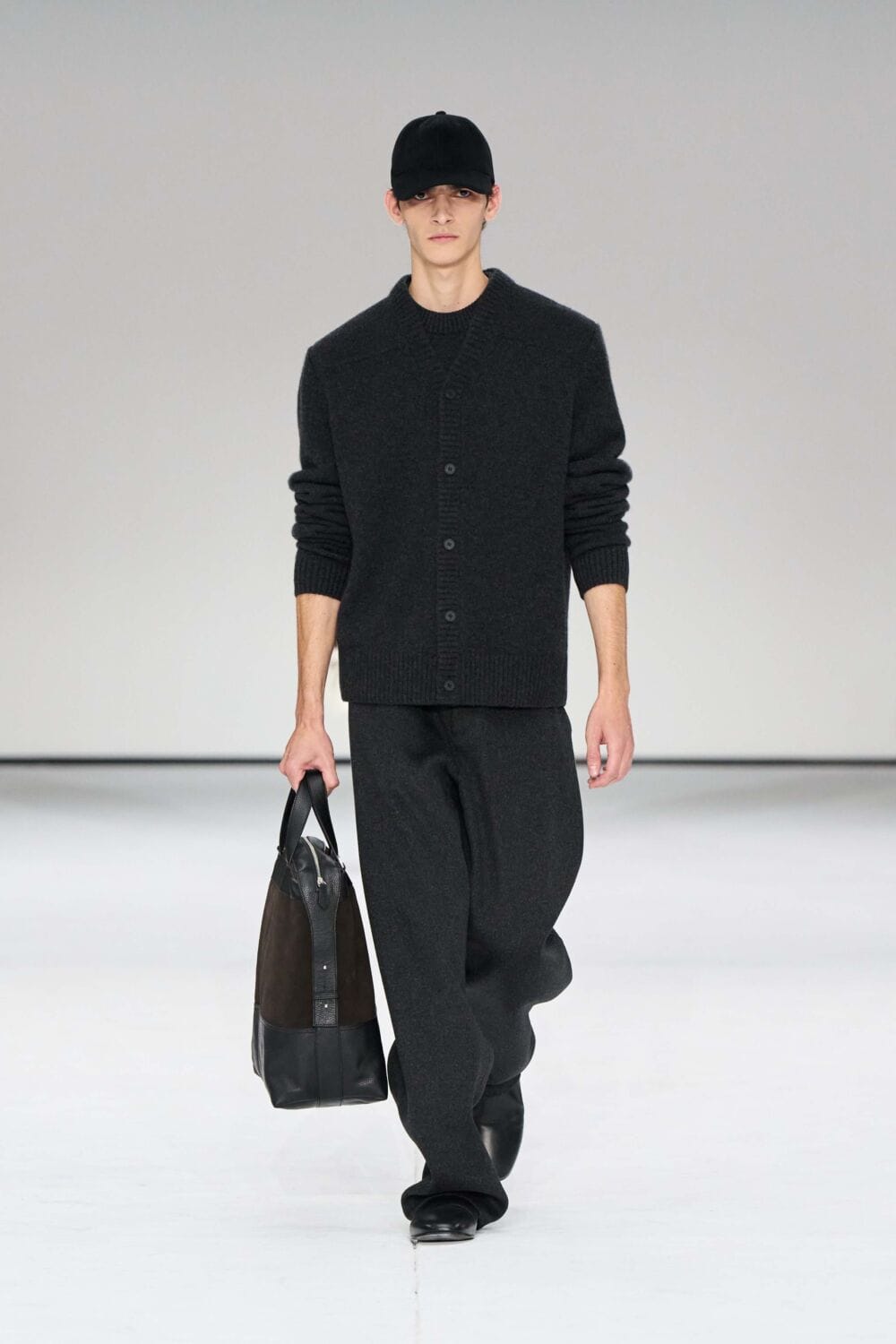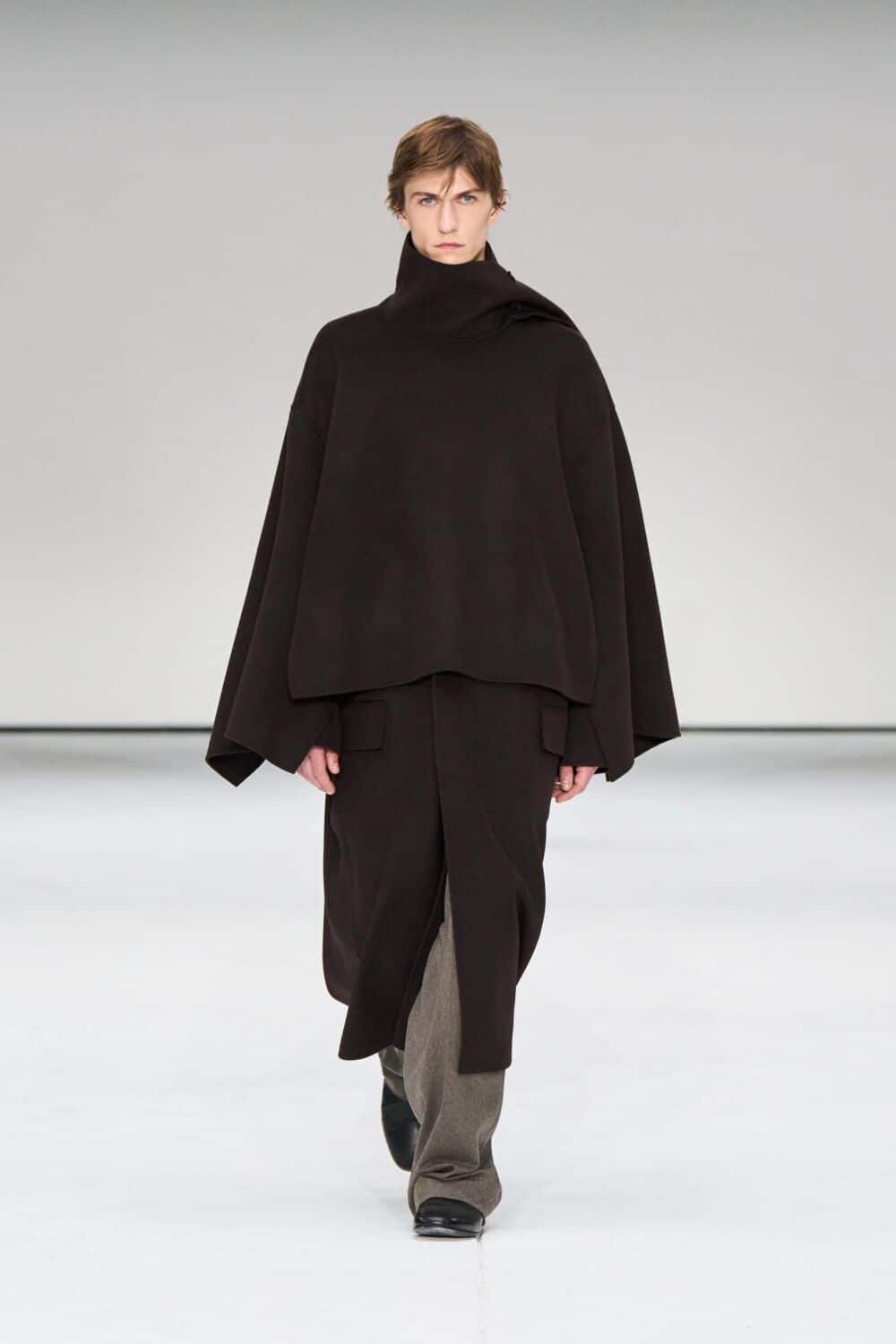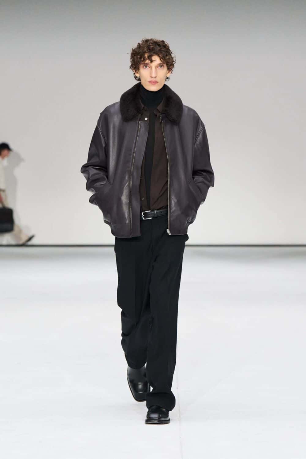 For mens, oversized tailoring paired with tonal knits and thoughtful layering reigned supreme, all grounded with practical accessories like baseball caps, fits-everything bags, and classic boots and sneakers. Of course, our eyes were on the outerwear, namely the floor-length double breasted wool coat, fur-collared leather bomber, and slouchy wool blazers.