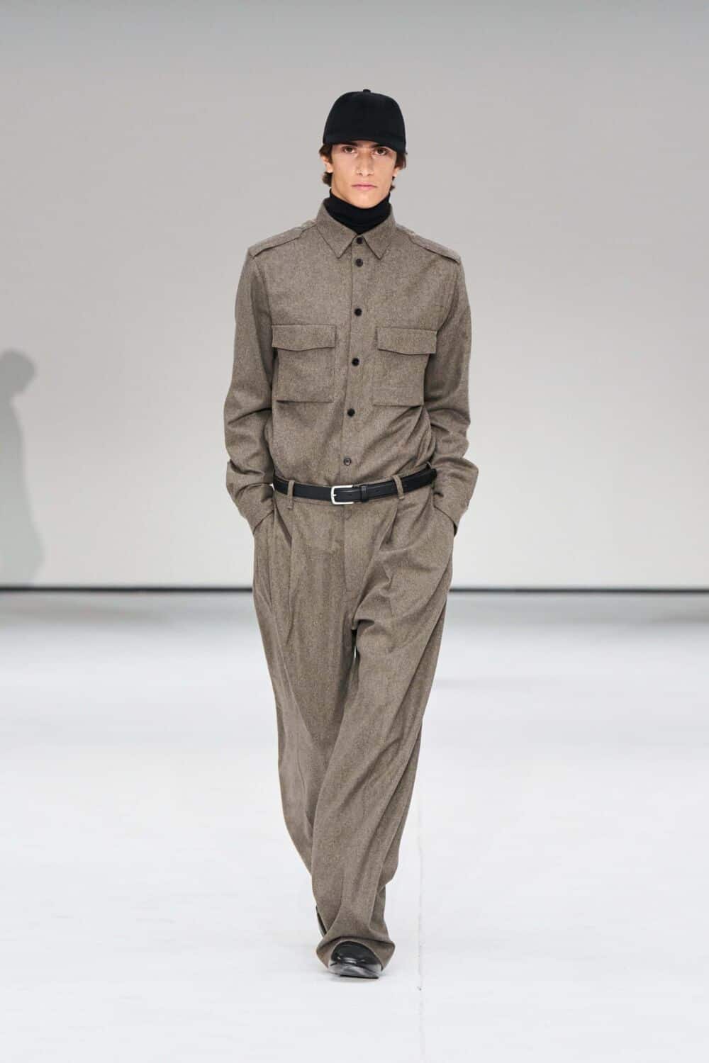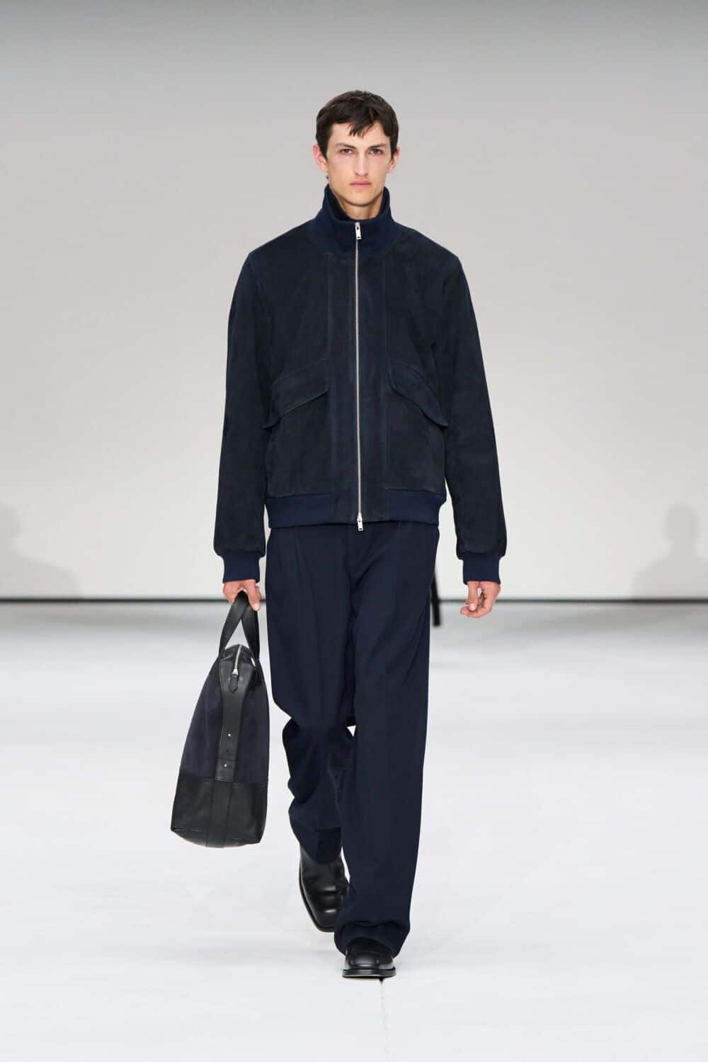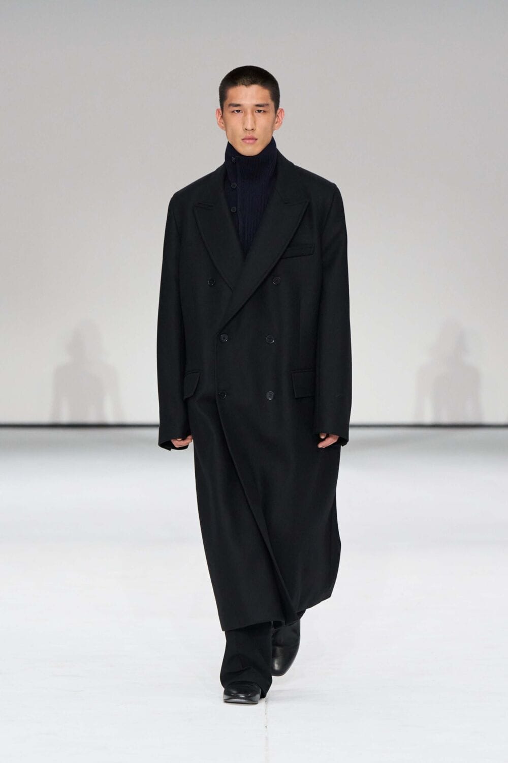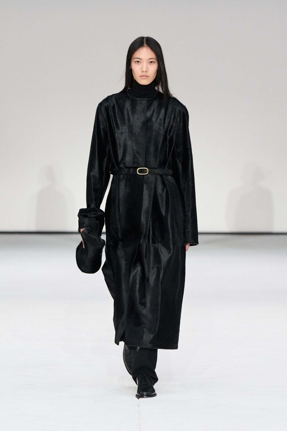 For mens, oversized tailoring paired with tonal knits and thoughtful layering reigned supreme, all grounded with practical accessories like baseball caps, fits-everything bags, and classic boots and sneakers. Of course, our eyes were on the outerwear, namely the floor-length double breasted wool coat, fur-collared leather bomber, and slouchy wool blazers.