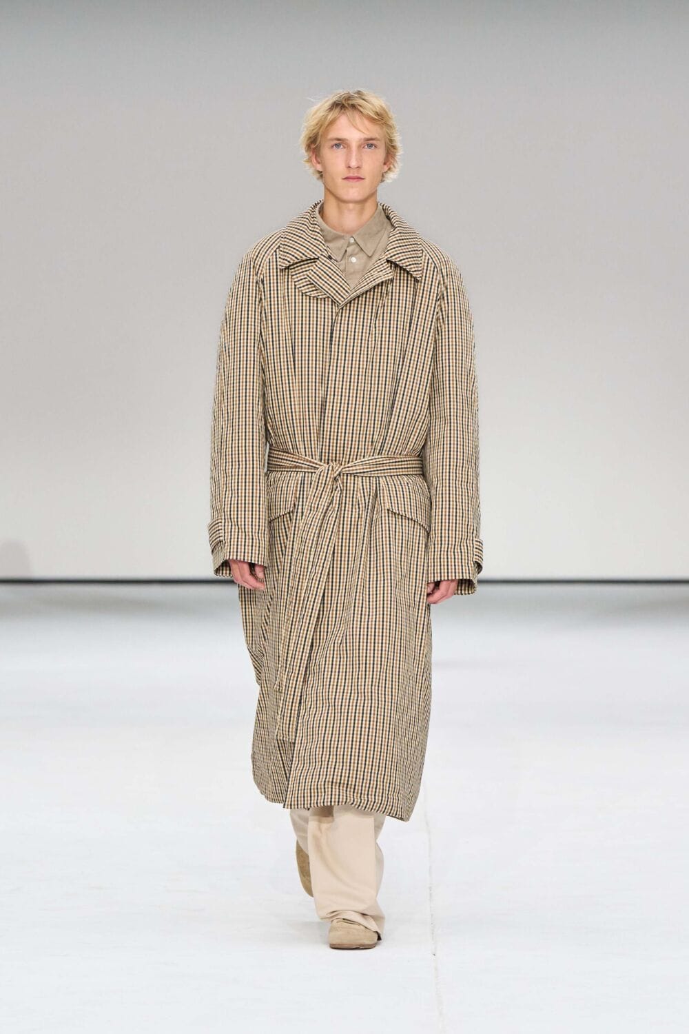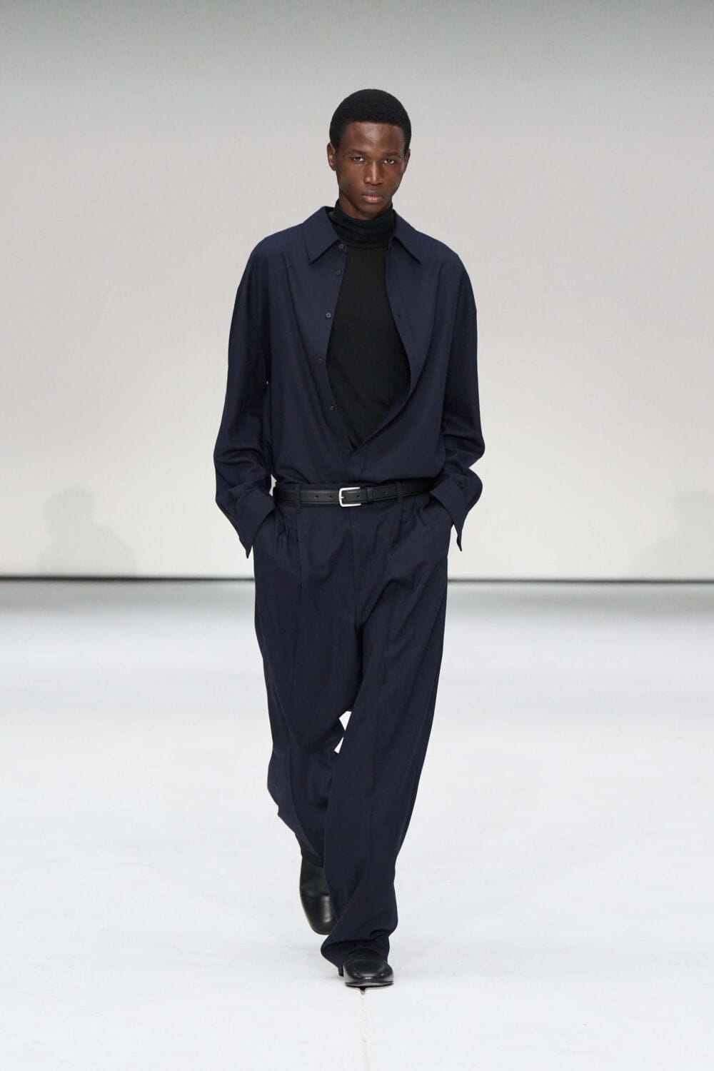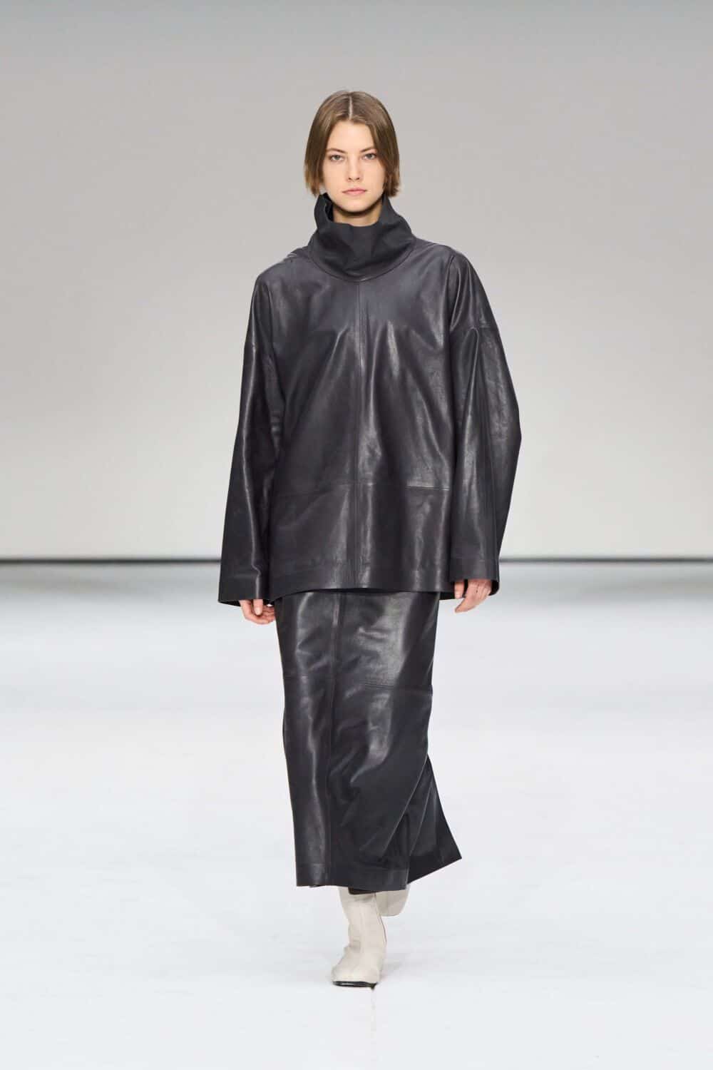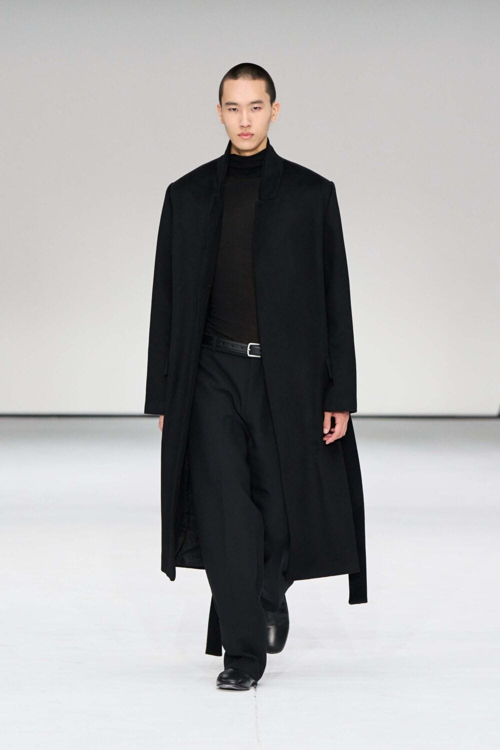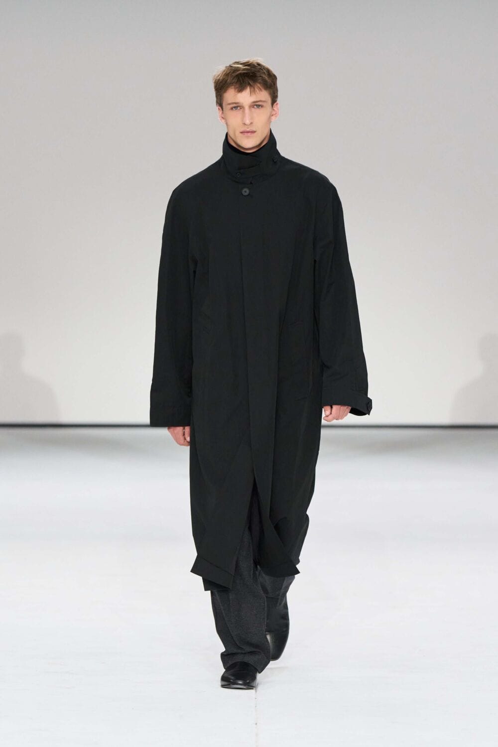 For mens, oversized tailoring paired with tonal knits and thoughtful layering reigned supreme, all grounded with practical accessories like baseball caps, fits-everything bags, and classic boots and sneakers. Of course, our eyes were on the outerwear, namely the floor-length double breasted wool coat, fur-collared leather bomber, and slouchy wool blazers.