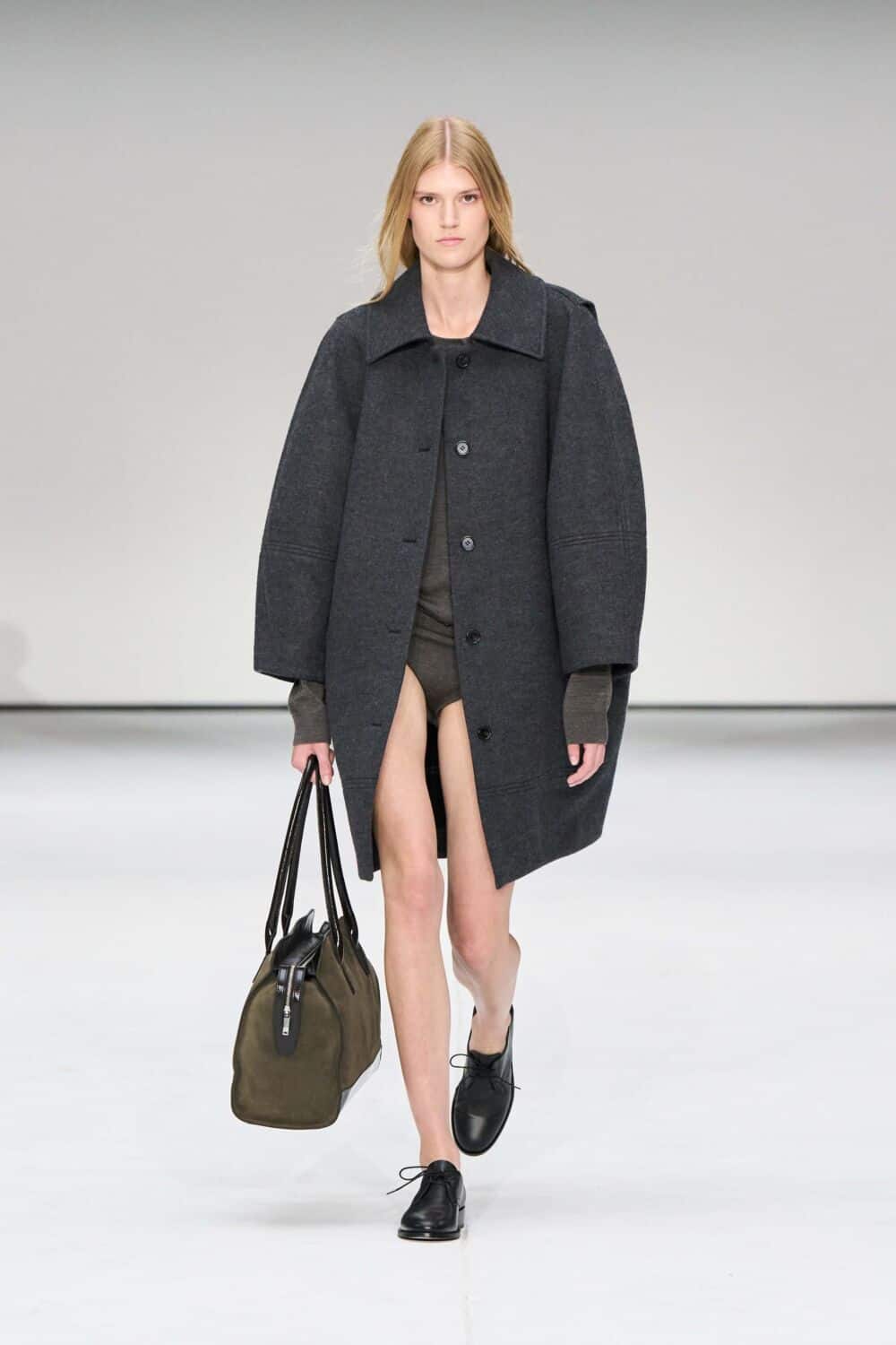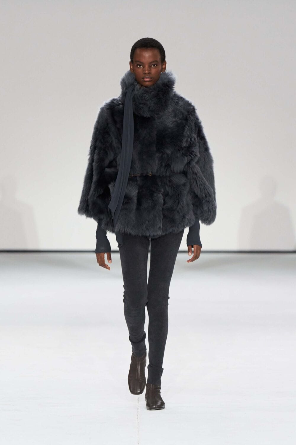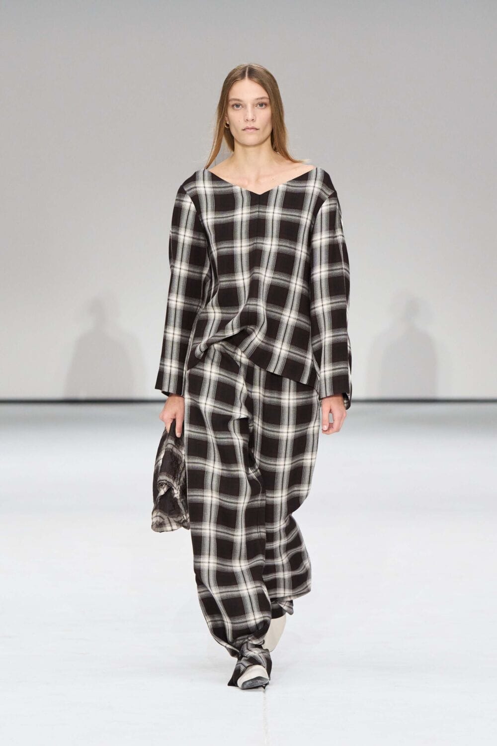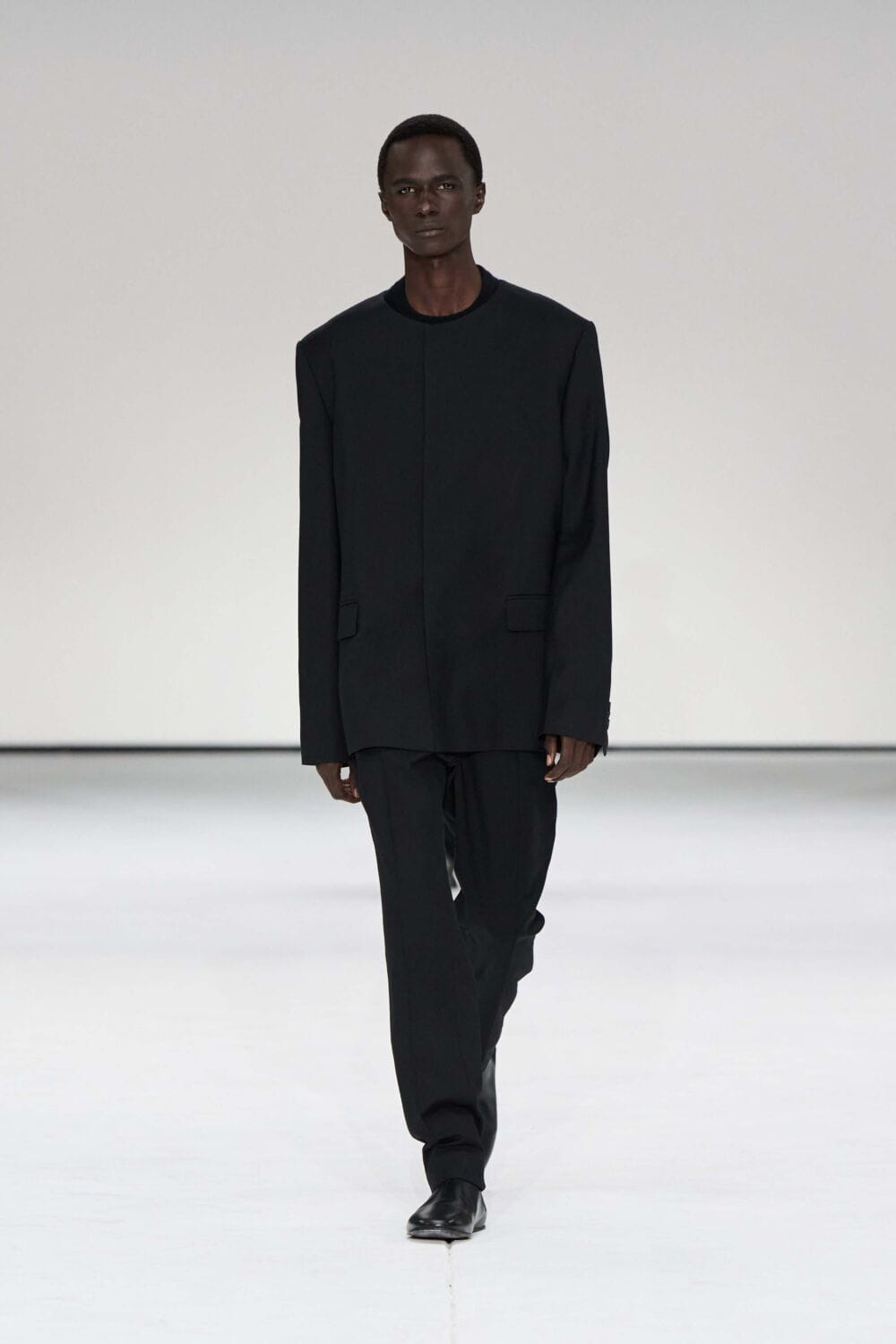 For mens, oversized tailoring paired with tonal knits and thoughtful layering reigned supreme, all grounded with practical accessories like baseball caps, fits-everything bags, and classic boots and sneakers. Of course, our eyes were on the outerwear, namely the floor-length double breasted wool coat, fur-collared leather bomber, and slouchy wool blazers.
