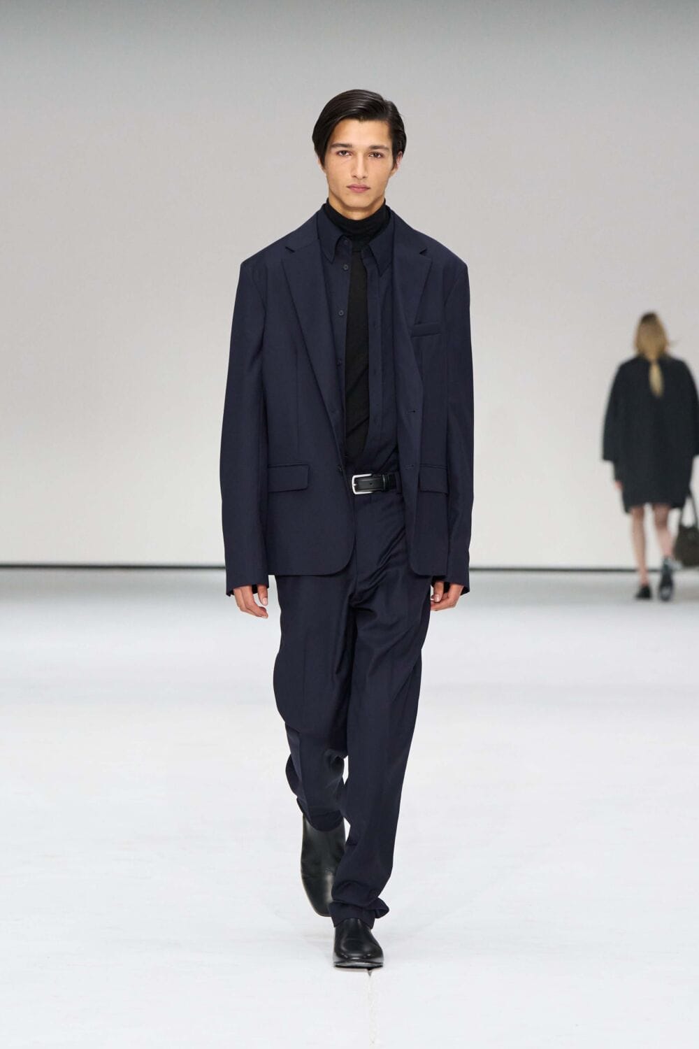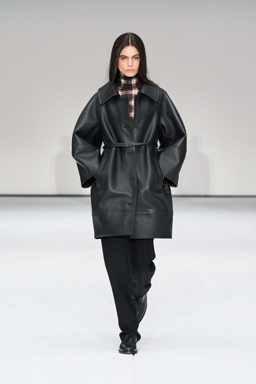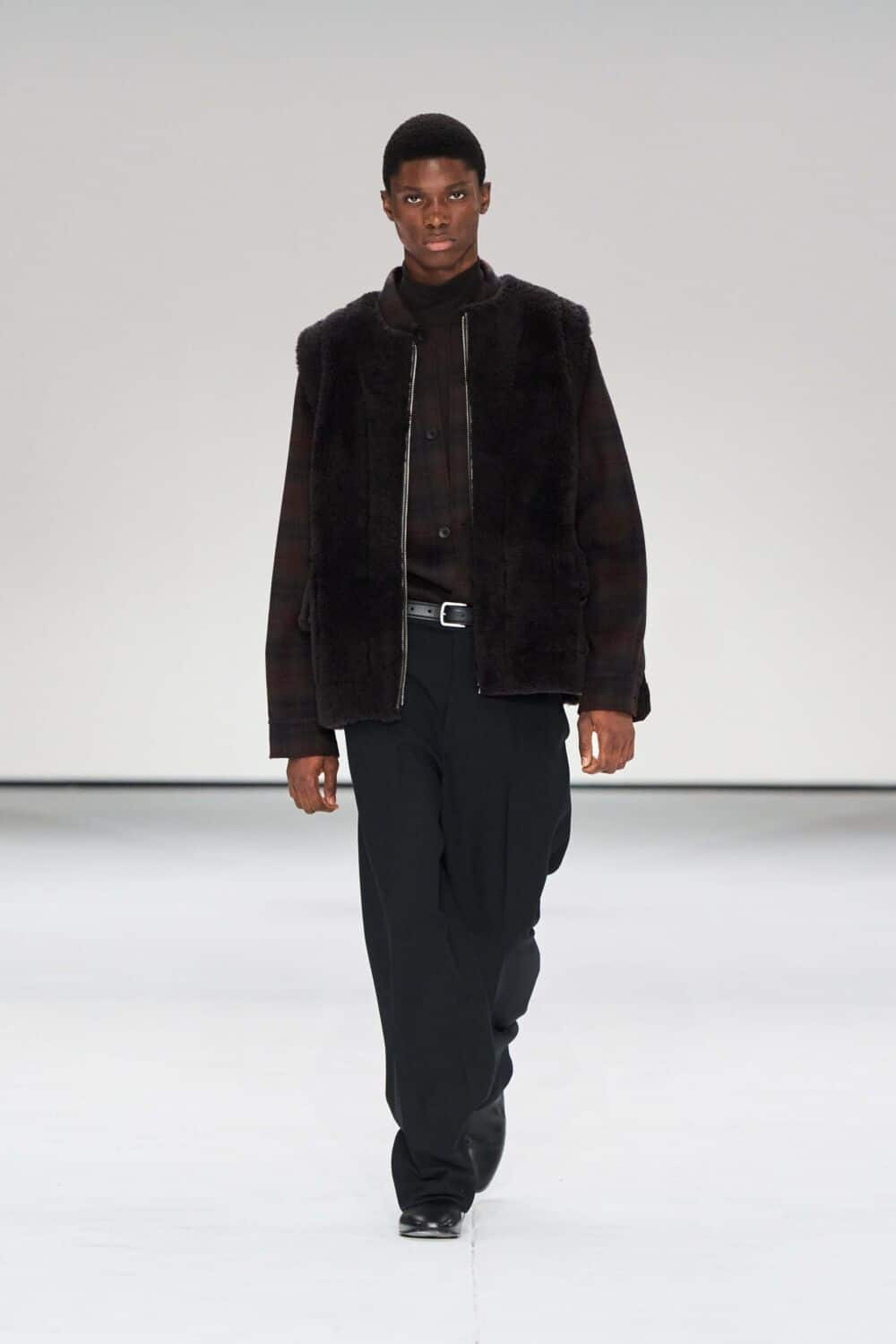 The womenswear contained a 1950s influence, with open necklines and cinched waists via belted suits, dresses, and jackets. Fabrics ranged from dynamic heritage check, supple leathers, heavy knits, slinkier numbers, and pops of sheer. Standouts included coats in a sumptuous black pony-hair and oversized cream shearling, both sure to make a statement this season. Sock boots, suede sneakers, and oversized clutches rounded out the looks.