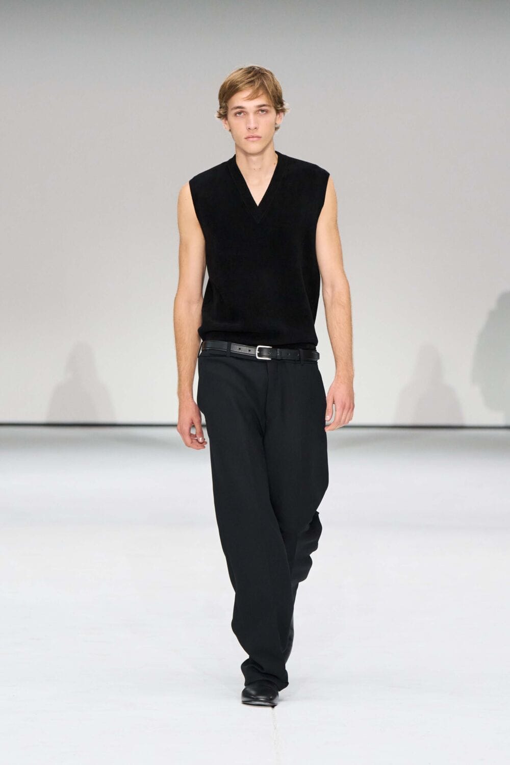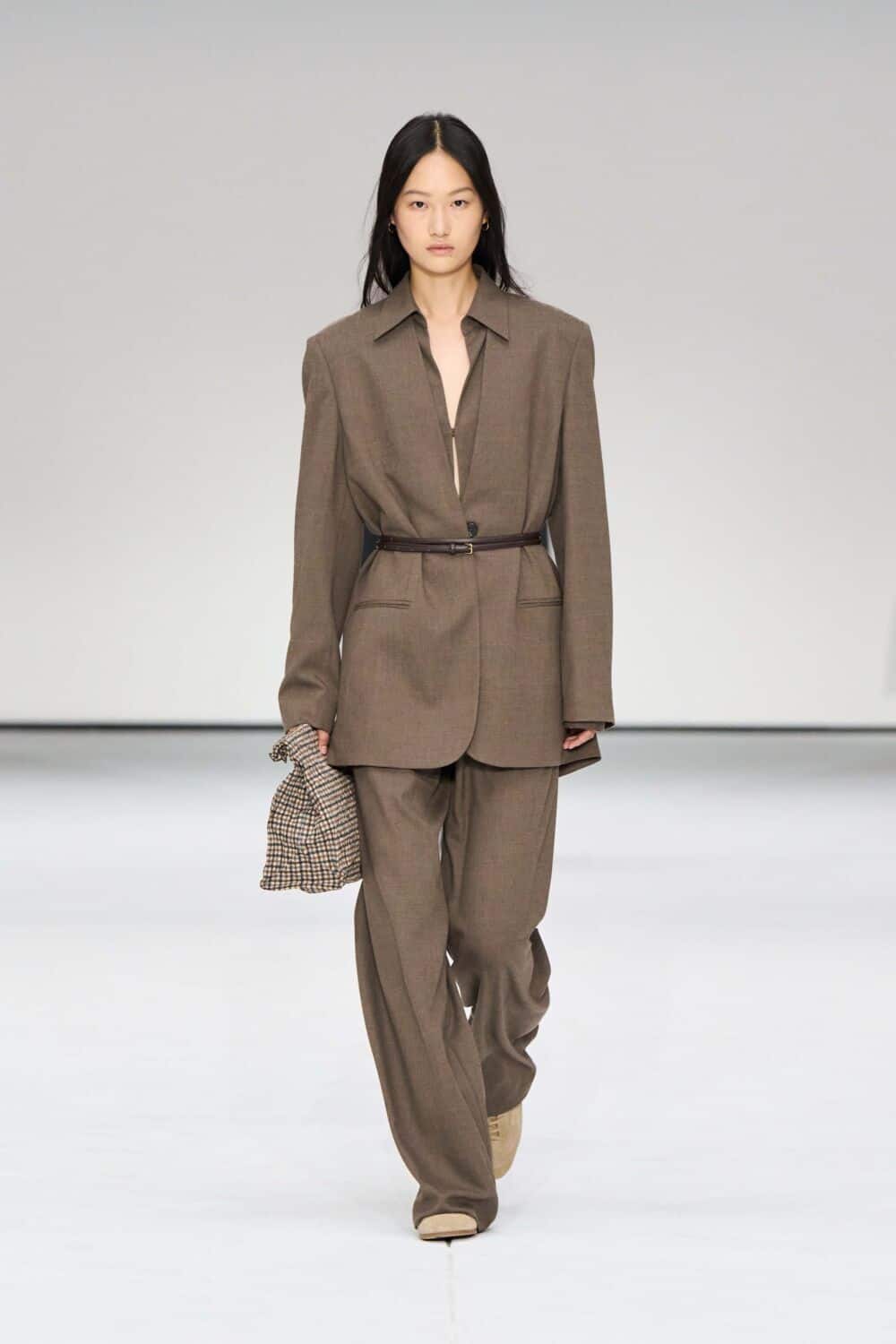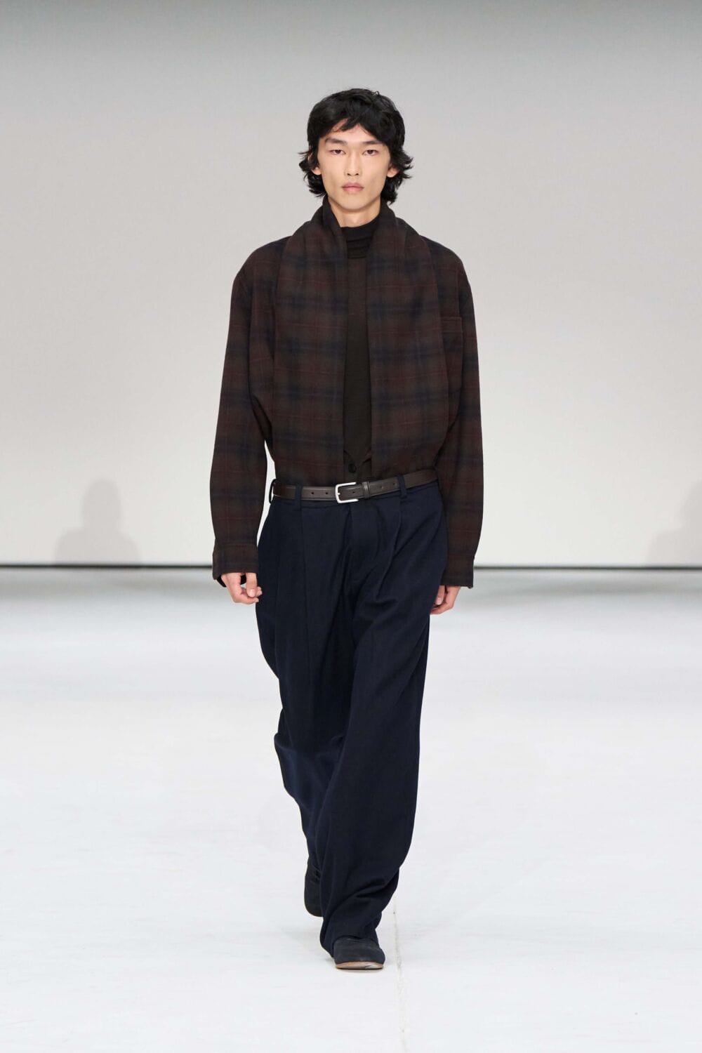 The womenswear contained a 1950s influence, with open necklines and cinched waists via belted suits, dresses, and jackets. Fabrics ranged from dynamic heritage check, supple leathers, heavy knits, slinkier numbers, and pops of sheer. Standouts included coats in a sumptuous black pony-hair and oversized cream shearling, both sure to make a statement this season. Sock boots, suede sneakers, and oversized clutches rounded out the looks.