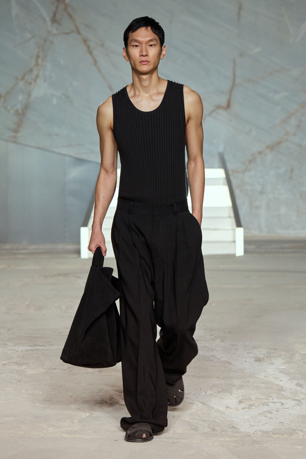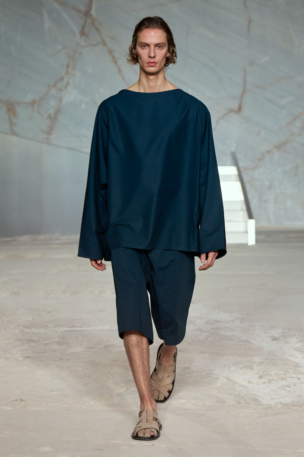 Lightweight fabrics were used to craft wardrobe staples like baggy Bermuda shorts, semi-opaque vests, crisp tunics and slouched formal wear. Throughout, Gustafsson introduced various new components to her ever-evolving COS wardrobe including sleeveless men’s blazers, sock boots and the pair of dresses that closes the show that bounced beautifully as the models walked thanks to their intricate pleating work. “Thoughtful detailing, innovative techniques, and elegant forms create a look that is both contemporary and timeless,” adds Gustafsson.