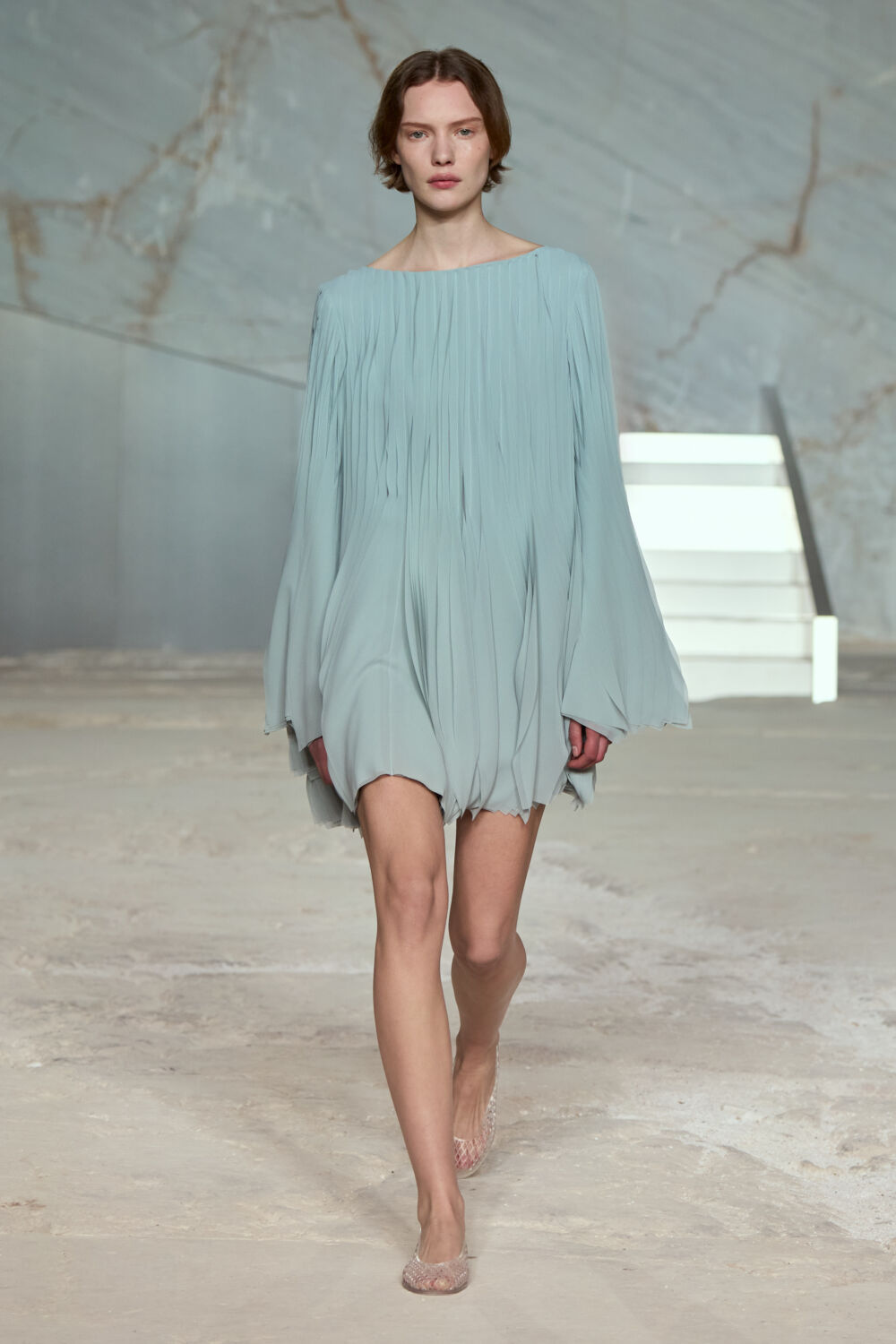 Gustafsson had been studying Renaissance paintings to guide how her draped fabrics glided around the feminine form. The paintings also provided inspiration for a hazy green-tinted marble print introduced into the brand’s arsenal for the first time, achieved via photographing flower buds squished up towards the lens.