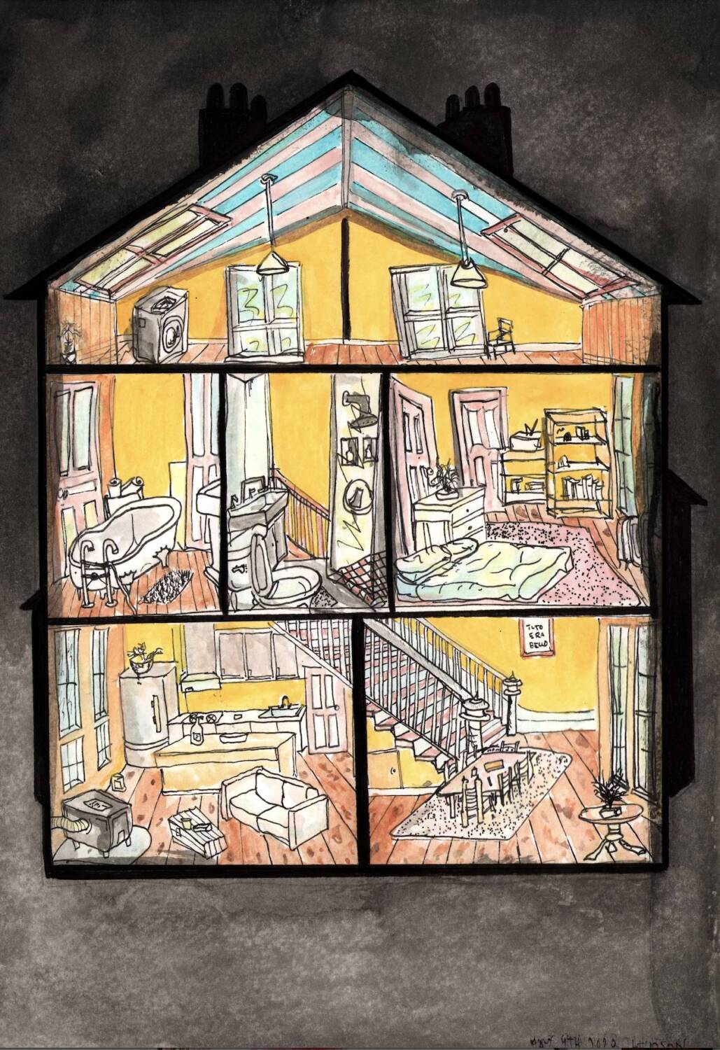Even Stateside, King’s curiosity never diminished. “Dan believed in output, even before input. Even if it’s not great, it’s always about creating,” says Hastil, who is also an artist. When the pandemic hit, the couple spent a lot of time creating, whether drawing in visual journeys (also seen on these pages), making brightly colored Memphis-style furniture and objects, or starting Locus of the Occult, a design label featuring graphic tees, incense burners, and clocks, among other items. “During lockdown, we were doing arts and crafts before leading up to launching our line. Once you realize you can just try something, trial and error, it opens you up to doing more.”