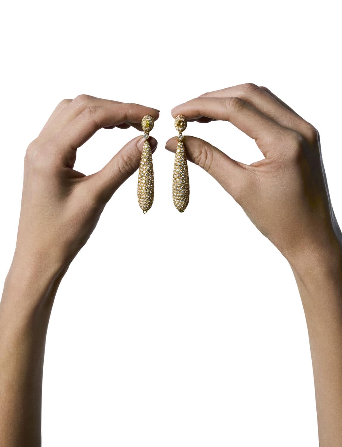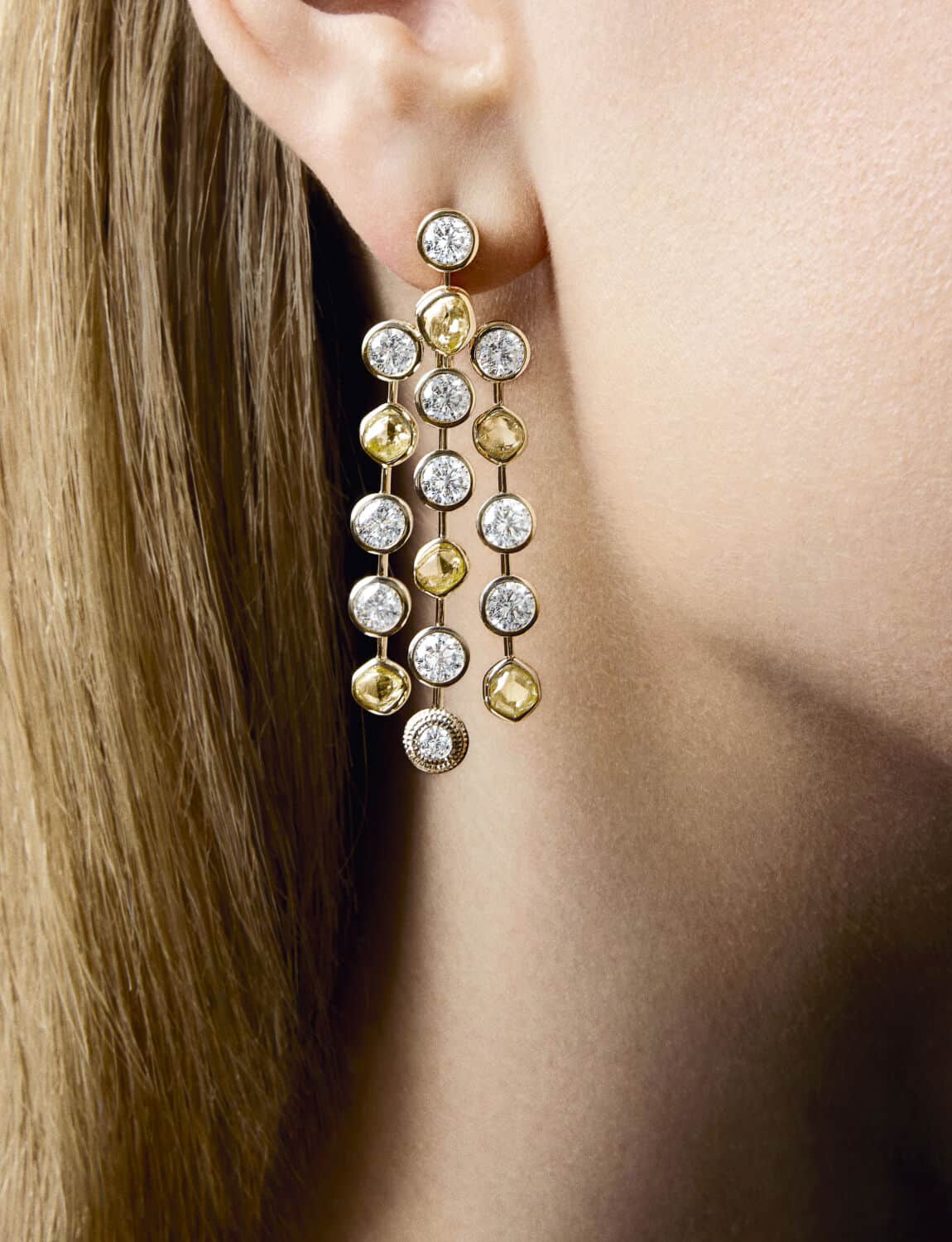 Talisman Chandelier earring in 18k yellow gold, rough yellow diamonds and polished white diamonds by DE BEERS