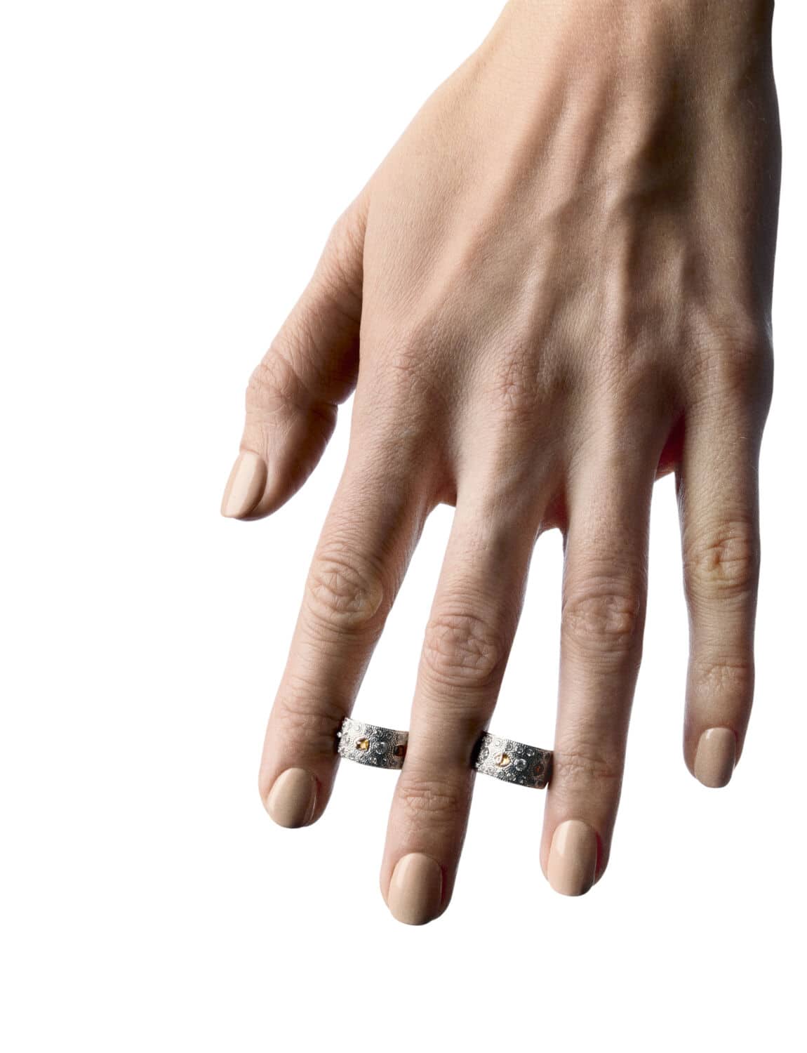 Each diamond is set using serti poinçon, a traditional goldsmithing technique revived by De Beers. The method involves hammering tiny indentations into the metal with a pyramid-shaped chisel, so the diamond becomes embedded within the surface. This eliminates the need for claws and gives the setting a distinctive, almost ancient-looking, textured finish. “It enhances the uniqueness of each piece,” the studio says, “enveloping each diamond as though it is nestled within the metal itself.”
