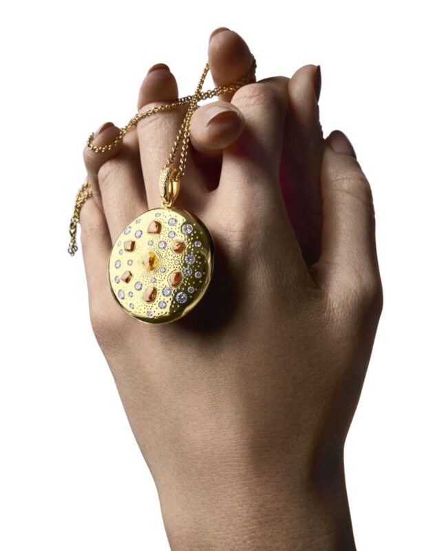 The second anniversary launch is the Talisman Locket, a limited-edition design that builds on the idea of jewellery as a deeply personal keepsake. With just 20 made, the locket is crafted in yellow gold and set with rough brown and yellow diamonds alongside polished white stones. It opens to reveal a concealed compartment and a polished gold disc, which can be engraved on both sides with names, dates or messages. Its removable frame allows for the inclusion of a small photograph or handwritten note.