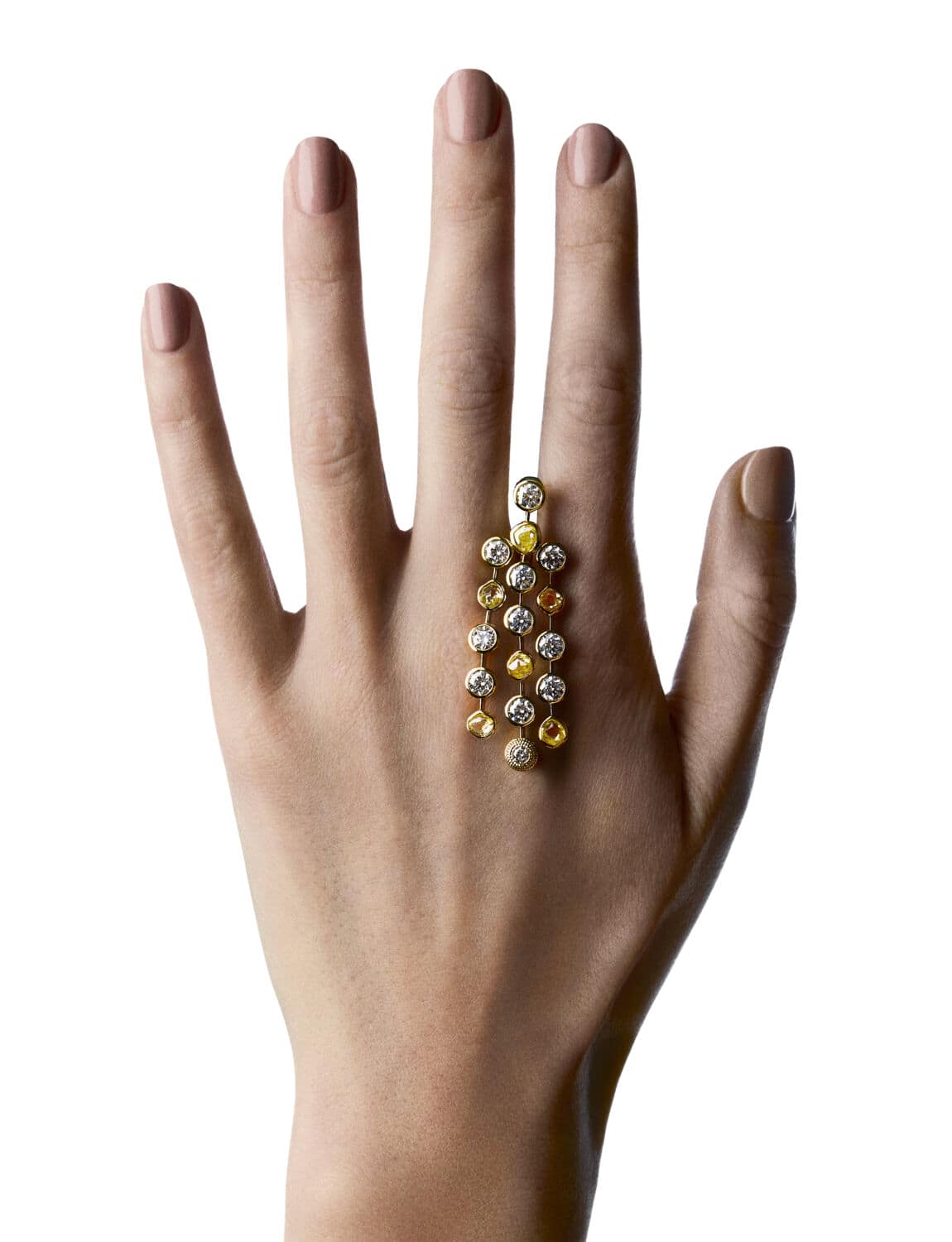 Each piece combines rough yellow diamonds with brilliant-cut white stones in minimal settings. Knife-edge links give the necklace and bracelet a fluid, floating appearance, while the chandelier earrings are engineered to catch light and move with the body. The Trio ring, meanwhile, frames a two-carat brilliant-cut diamond between two rough yellow stones, emphasising the “raw and refined” principle that underpins the collection. “Every creation is built around a central focal stone,” says the studio. “The surrounding diamonds radiate outward, placed deliberately to form a composition that feels both cohesive and expressive.”