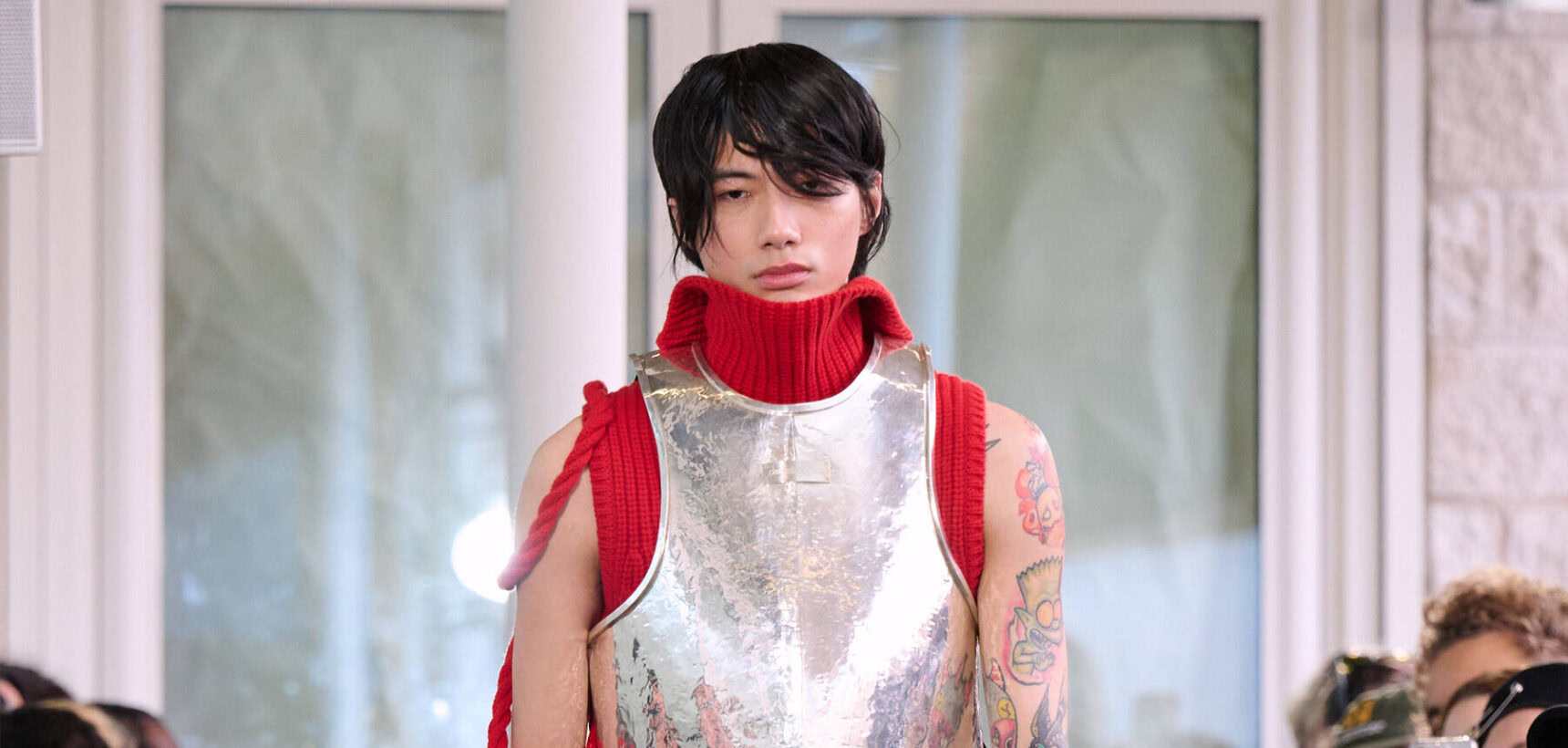 The runway became a battlefield of style, with war-ready silhouettes reimagining heraldry for the streets. Oversized racing suits sliced through the air, while cropped jackets with exaggerated shoulders reinforced a powerful stance. Mud-splashed trousers told stories of hard-fought victories, evolving into regal hues of gunmetal, brick, lilac and teal. Armour-like breastplates and bondage-style straps clashed with racetrack rawness, while slogans roared across garments like banners in a jousting arena. Feather-trimmed high-collared jackets added a rebellious, noble edge.