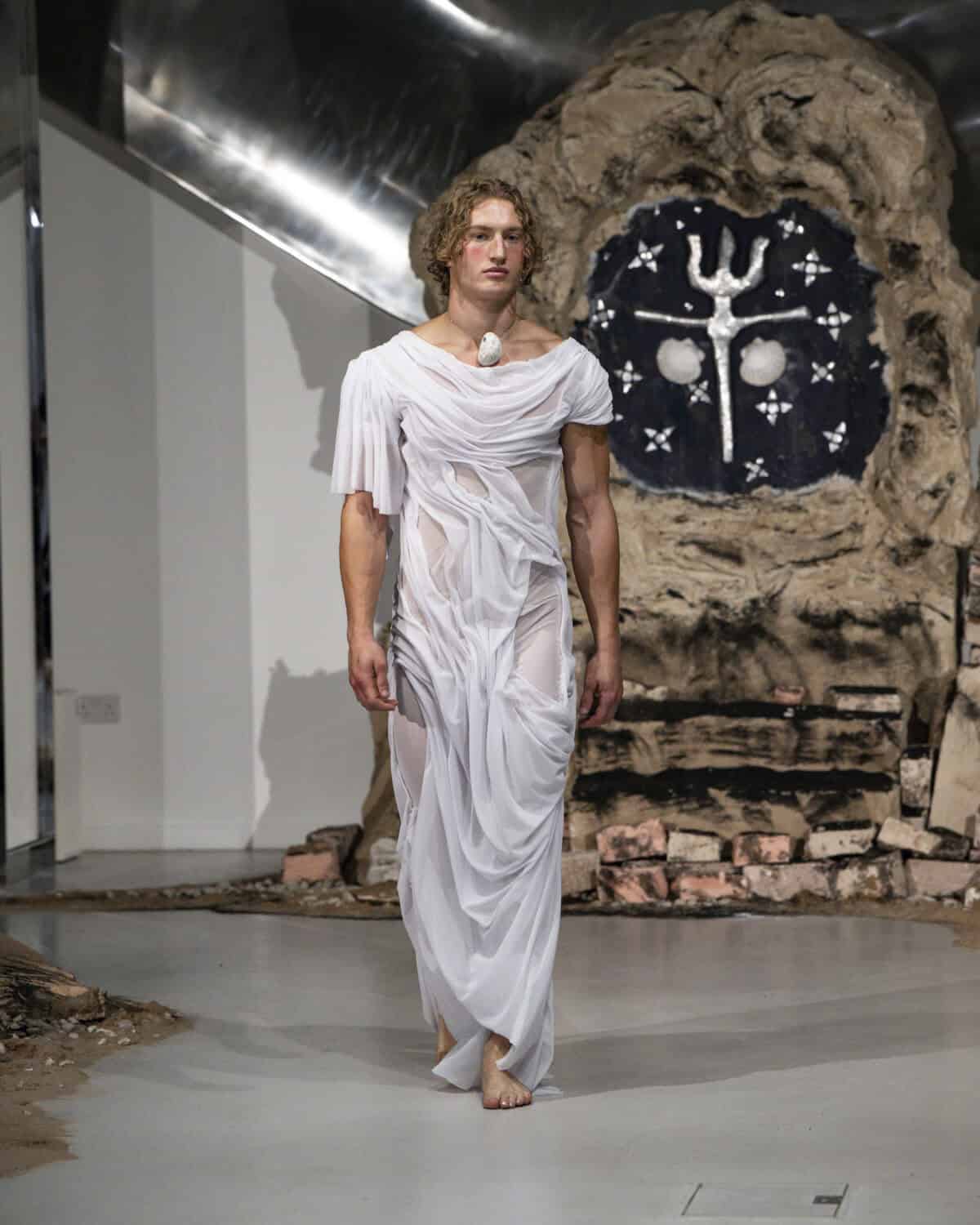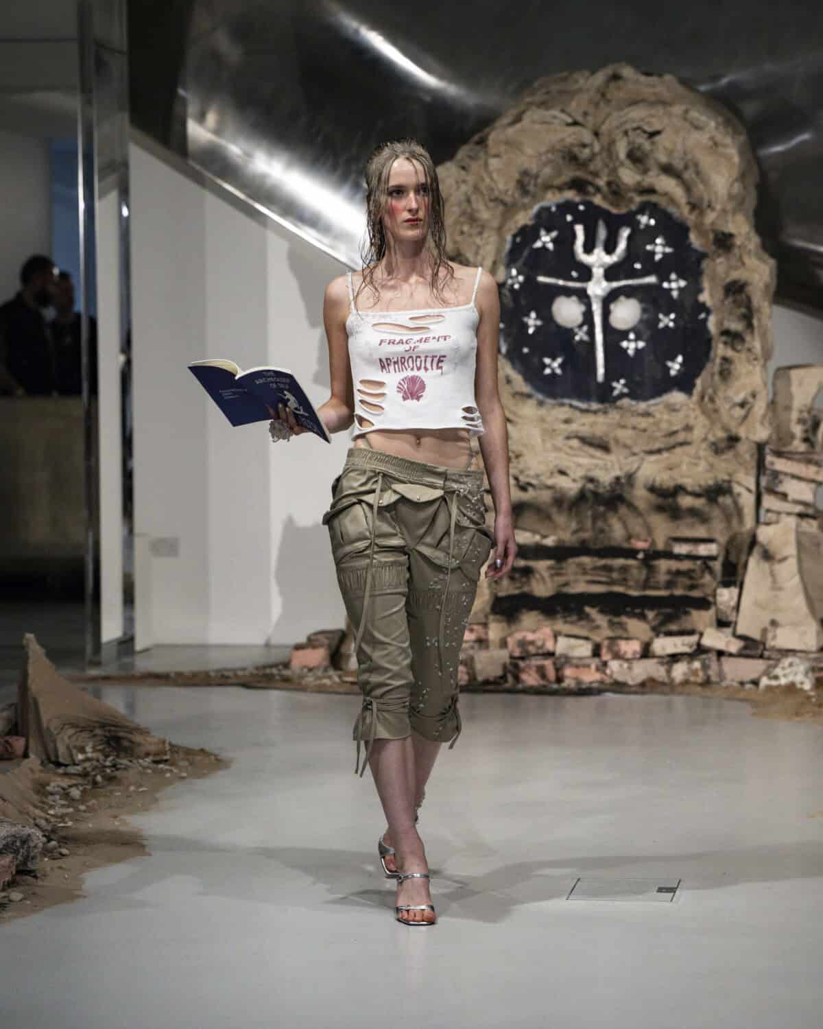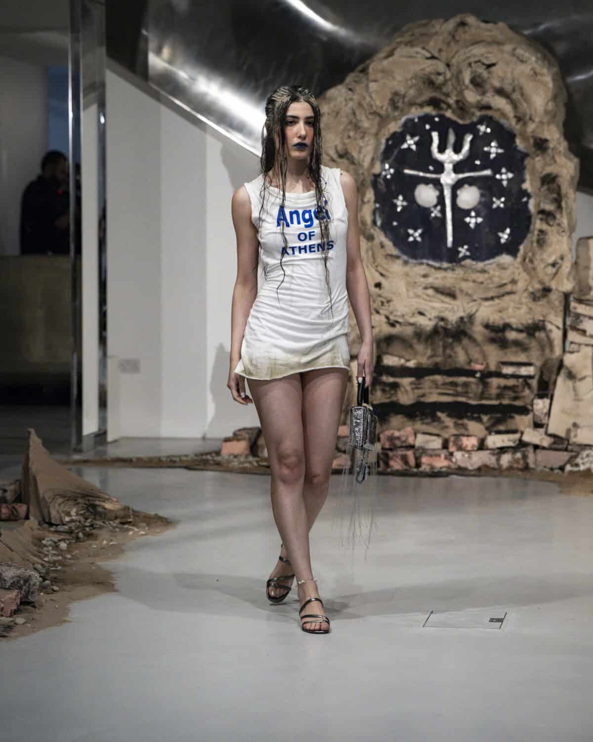 There were sheer mesh tops printed with phrases like “Angel of Athens” and “Imitation Poseidon”, paired with low-slung skirts and layered jersey ribbons that wrapped and twisted around the body. Wetlook dresses – now a house signature – appeared in pearlescent creams, soft greys and watery blues, some cut into mini lengths, others falling to the floor with open backs and gentle gathers.