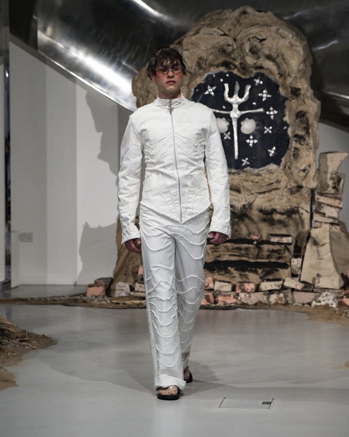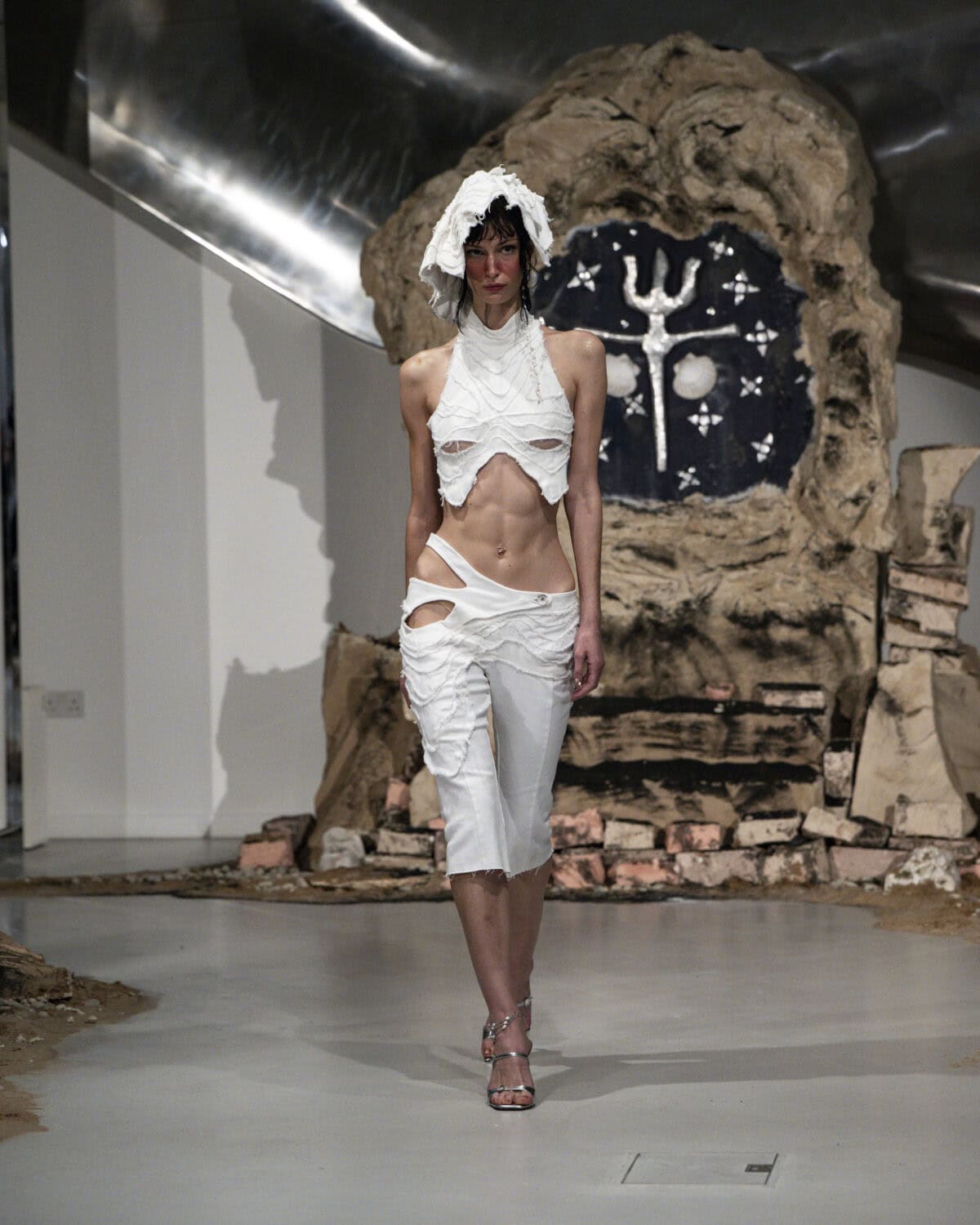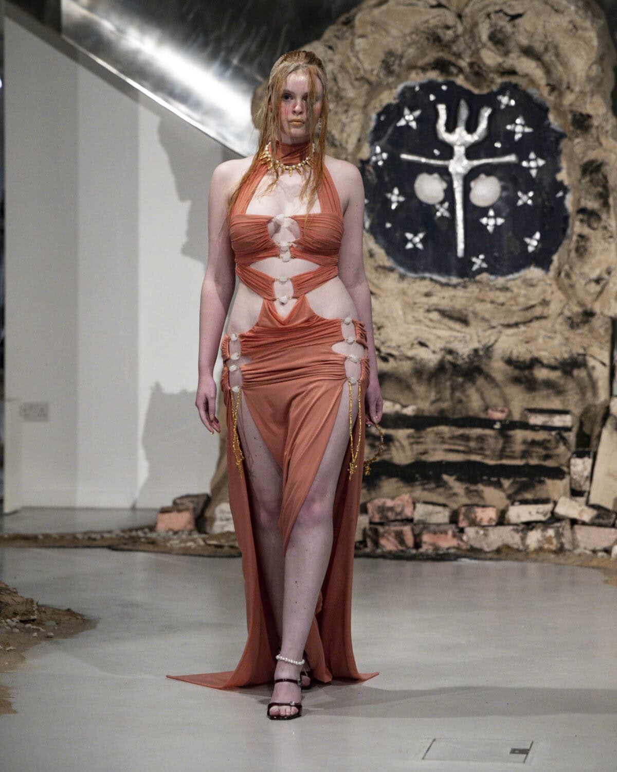 There were sheer mesh tops printed with phrases like “Angel of Athens” and “Imitation Poseidon”, paired with low-slung skirts and layered jersey ribbons that wrapped and twisted around the body. Wetlook dresses – now a house signature – appeared in pearlescent creams, soft greys and watery blues, some cut into mini lengths, others falling to the floor with open backs and gentle gathers.