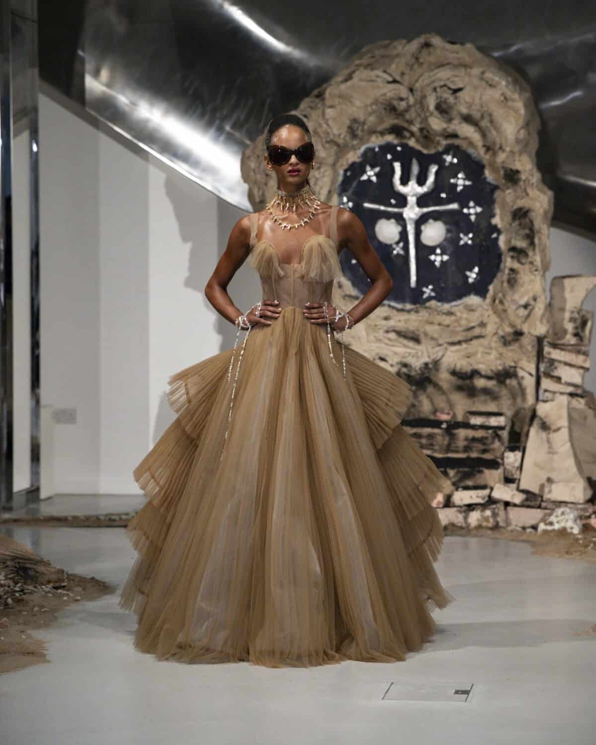 The standout new addition was the Ancient Moon bag, which came in metallic knits, shimmering organza and woven rattan. It looked equally good clutched in hand or slung across the body – ideal for beach nights or goddess-inspired errands.