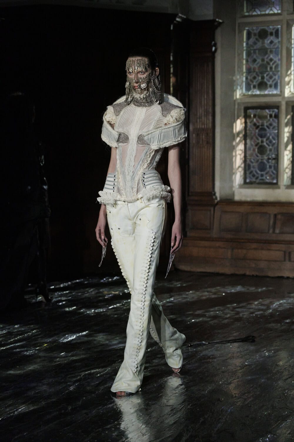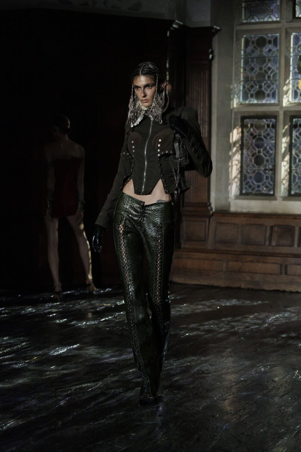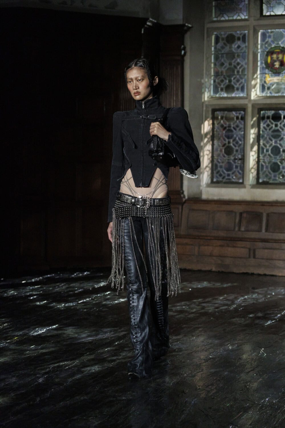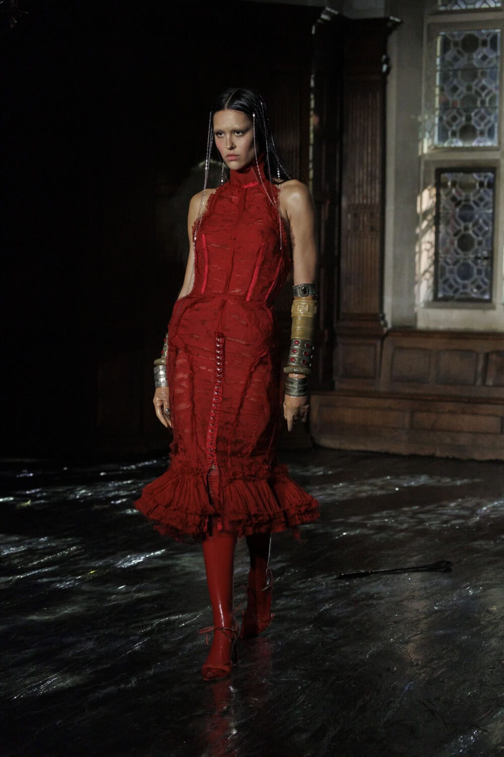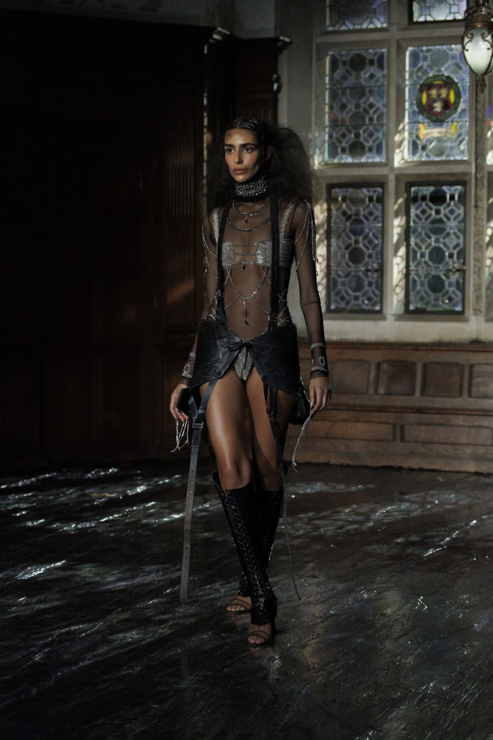 Those with long fashion memories likened the hysteria to the heyday of Alexander Mcqueen. Dilara’s dark, gothic Victoriana aesthetic also has a kinship with the late great designer as does her ability to bring complex conversations to a fashion catwalk. Dilara’s sex positive feminism is at the core of her approach. “I feel like women have been kept in cages of innocence and purity, being told they have to be clean and represent virginity, all this kind of stuff, but we come out of this cage today,” she said. It was a rallying cry for next-level vixen dressing. Following her narrative, Dilara’s muse escaped from virginity into freedom. Her models stalked and slinked through the historic rooms of Ironmongers’ Hall inside the Barbican, in looks that ranged from tiny white corseted mini dresses, their hair matted with twigs and leaves as if they’d been romping outdoors, to a buckled leather harness dress complete with a long horsey tail swishing behind. One model wore a bit between her teeth. Naomi Campbell walked in a corset based on a bridle and blinkers, whilst Amelia Gray played the ultimate scarlett woman to perfection in a tiny red lace number. That trajectory of throwing off the shackles of convention mirrors Dilara’s own story. From a conservative Turkish family, she found her freedom in the goth clubs of London but she’s acutely aware that her experience is radically different to the generations that went before her. “What appears light and virtuous in name has, in truth, weighed heavily across generations, transforming supposed ideals into invisible walls.” Dilara’s subversive sensuality took a wrecking ball to all that.
