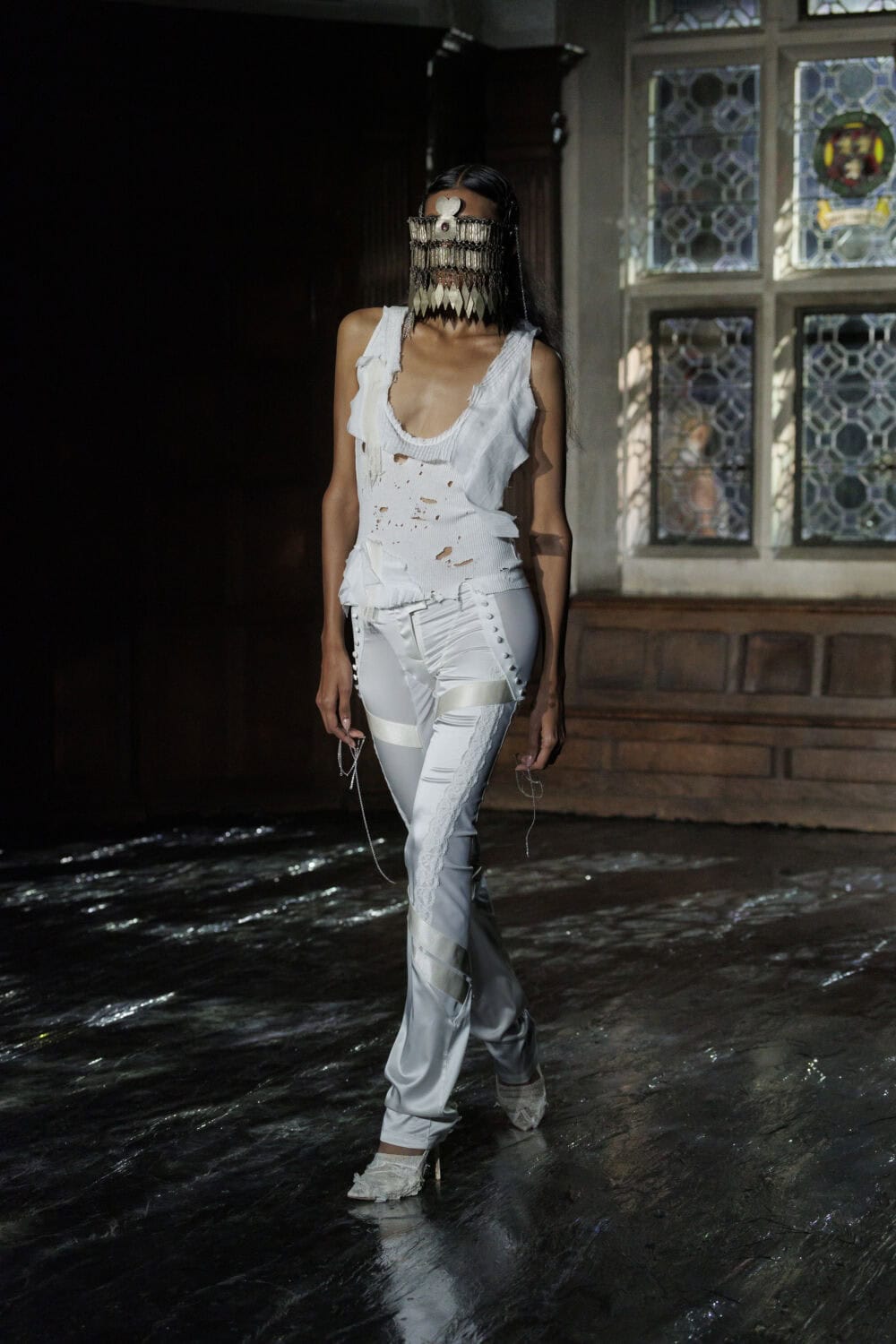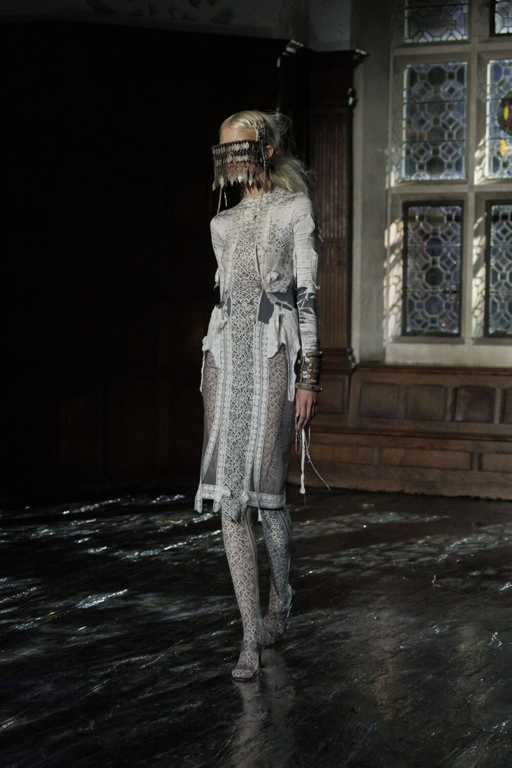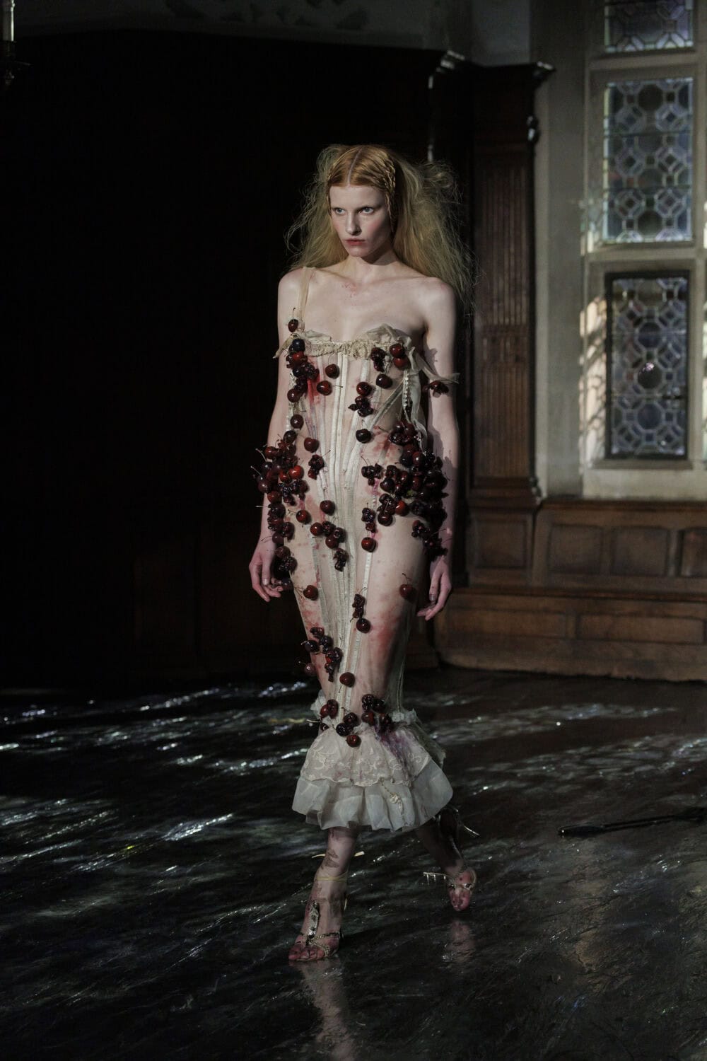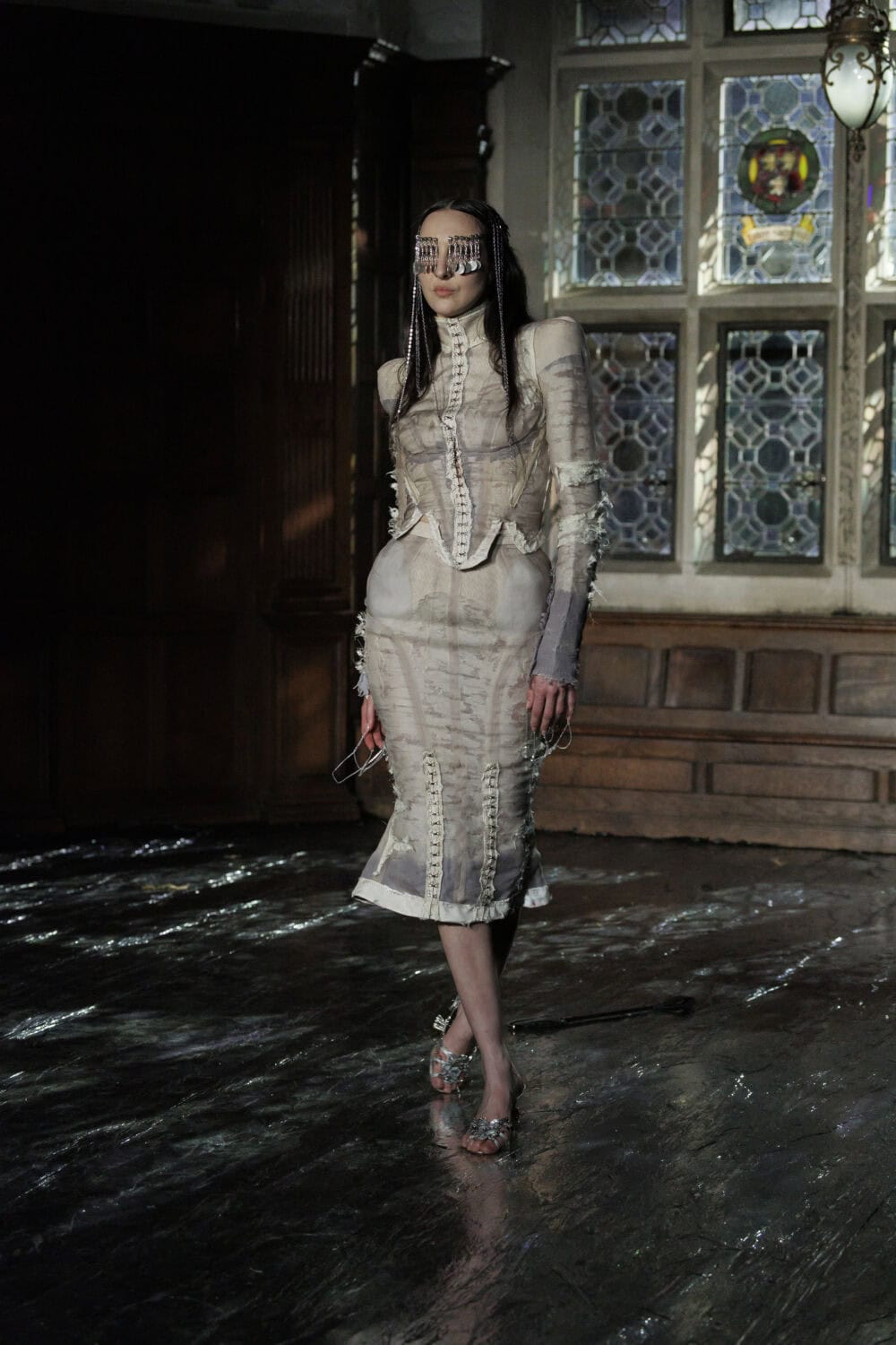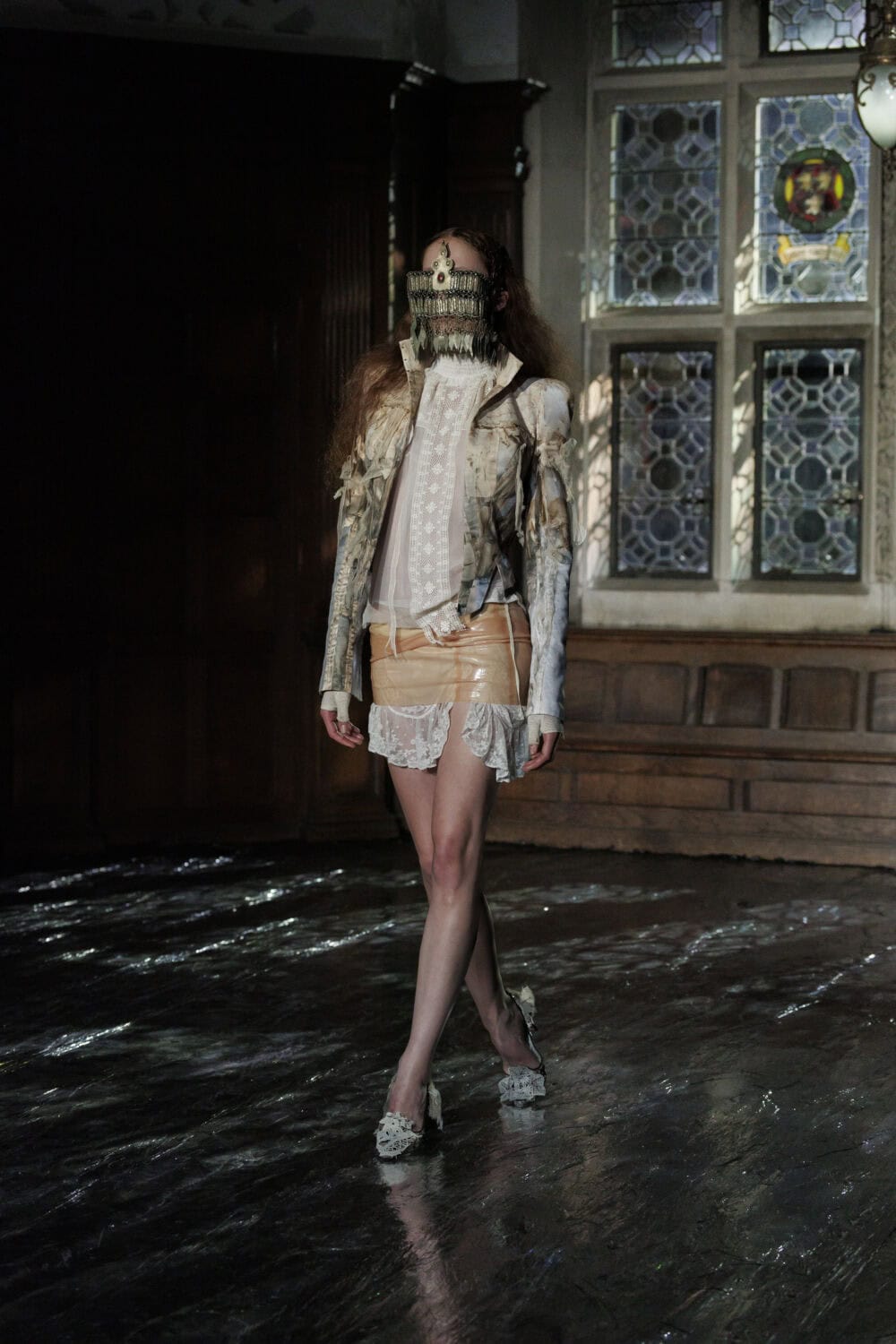 Those with long fashion memories likened the hysteria to the heyday of Alexander Mcqueen. Dilara’s dark, gothic Victoriana aesthetic also has a kinship with the late great designer as does her ability to bring complex conversations to a fashion catwalk. Dilara’s sex positive feminism is at the core of her approach. “I feel like women have been kept in cages of innocence and purity, being told they have to be clean and represent virginity, all this kind of stuff, but we come out of this cage today,” she said. It was a rallying cry for next-level vixen dressing. Following her narrative, Dilara’s muse escaped from virginity into freedom. Her models stalked and slinked through the historic rooms of Ironmongers’ Hall inside the Barbican, in looks that ranged from tiny white corseted mini dresses, their hair matted with twigs and leaves as if they’d been romping outdoors, to a buckled leather harness dress complete with a long horsey tail swishing behind. One model wore a bit between her teeth. Naomi Campbell walked in a corset based on a bridle and blinkers, whilst Amelia Gray played the ultimate scarlett woman to perfection in a tiny red lace number. That trajectory of throwing off the shackles of convention mirrors Dilara’s own story. From a conservative Turkish family, she found her freedom in the goth clubs of London but she’s acutely aware that her experience is radically different to the generations that went before her. “What appears light and virtuous in name has, in truth, weighed heavily across generations, transforming supposed ideals into invisible walls.” Dilara’s subversive sensuality took a wrecking ball to all that.