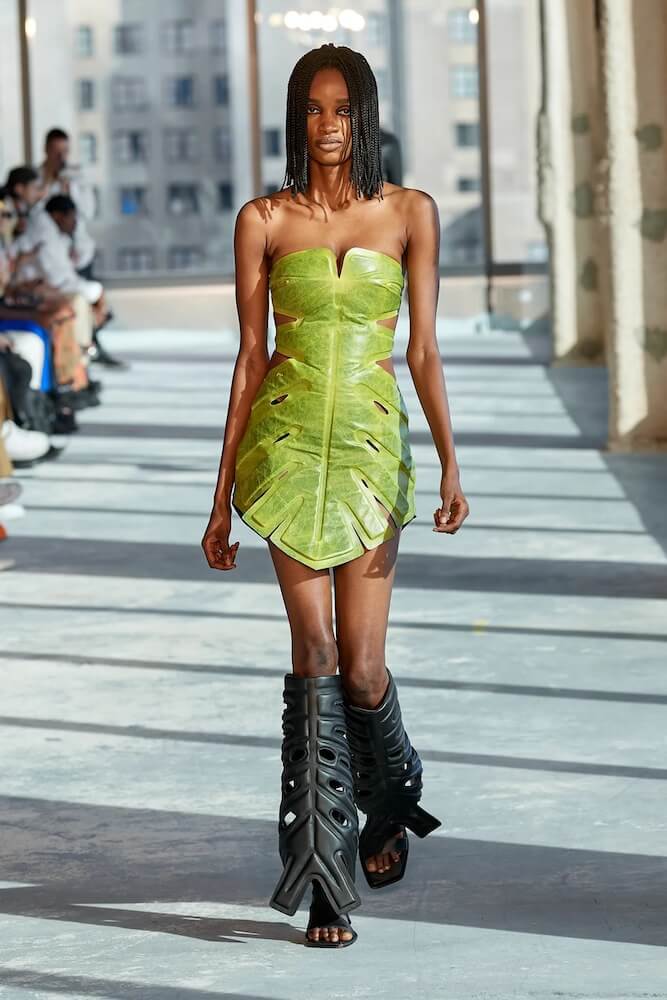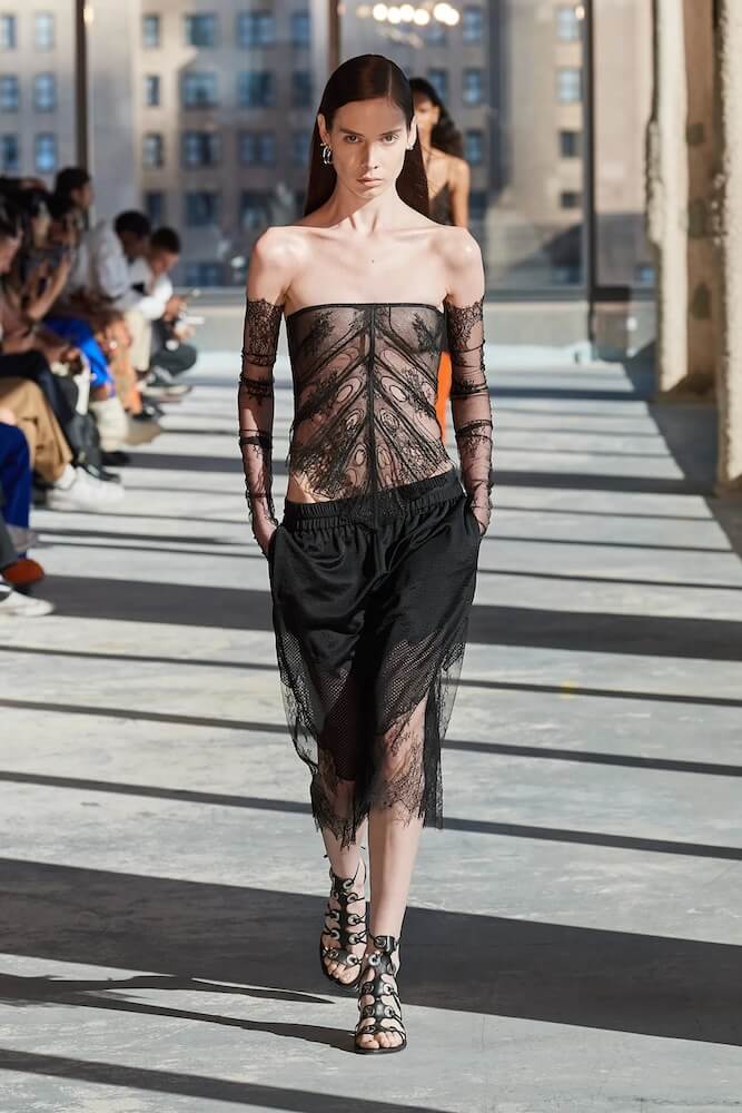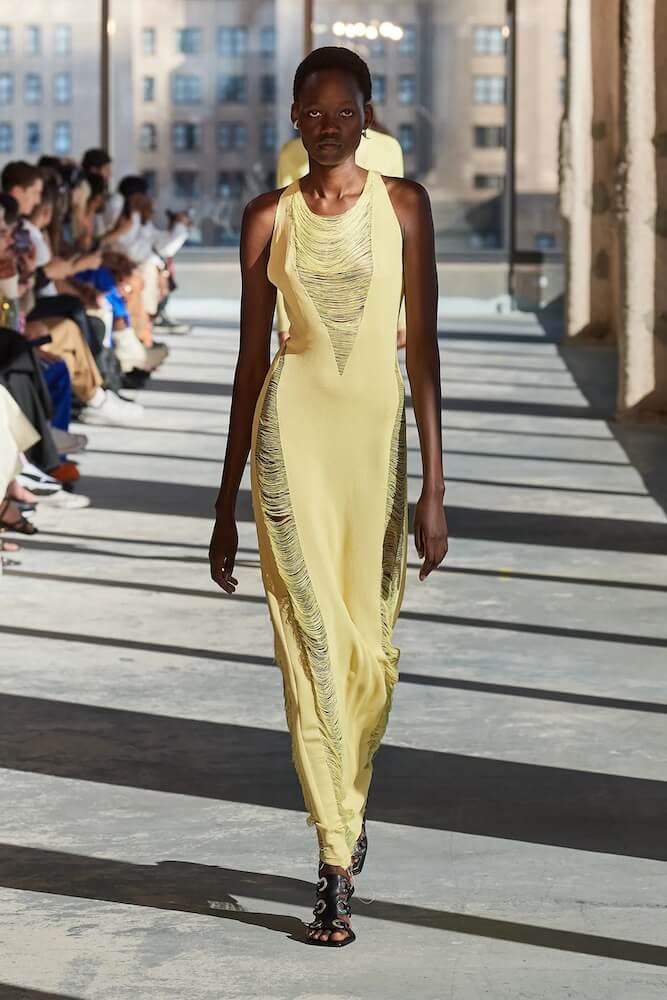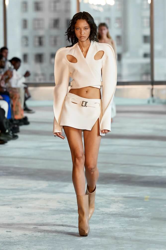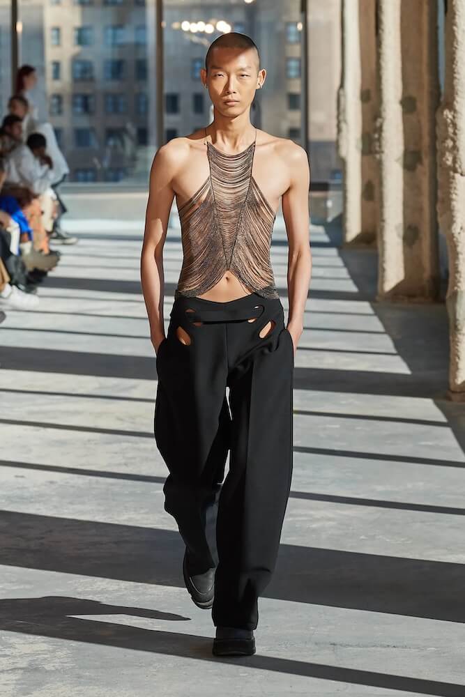A vacant office in Hudson Yards, void of workers, served as the set at Dion Lee’s SS23 catwalk yesterday. The stark industrial space boasted a phenomenal city skyline view, only adding to the metropolitan mood of the collection. Following peculiar patterns found within anatomy, the New York-based Australian designer’s signature cutouts and structured corsetry were rife. Threaded into beguiling knit bodycon dresses adorned with metallic fringe, the models’ figures were enhanced, expertly tailored cropped blazers and low-slung baggy trousers created the opposite effect, appearing oversized, slouchy and modernly modest. Slinky dresses also dragged along the floor giving Lee’s ladies and lads an alluring air as they promenaded across the highrise, concrete floor.
