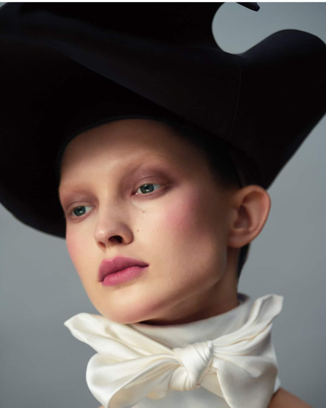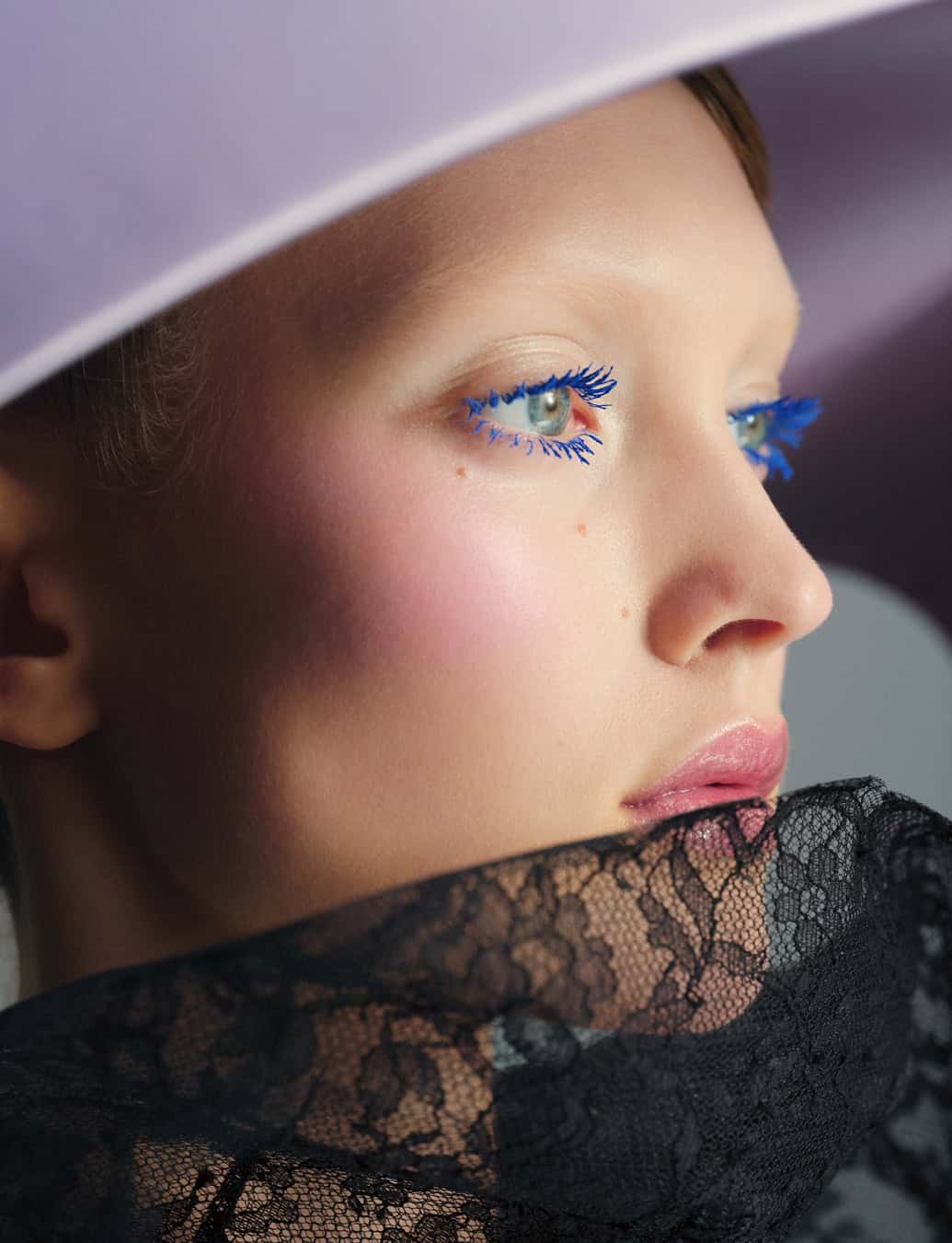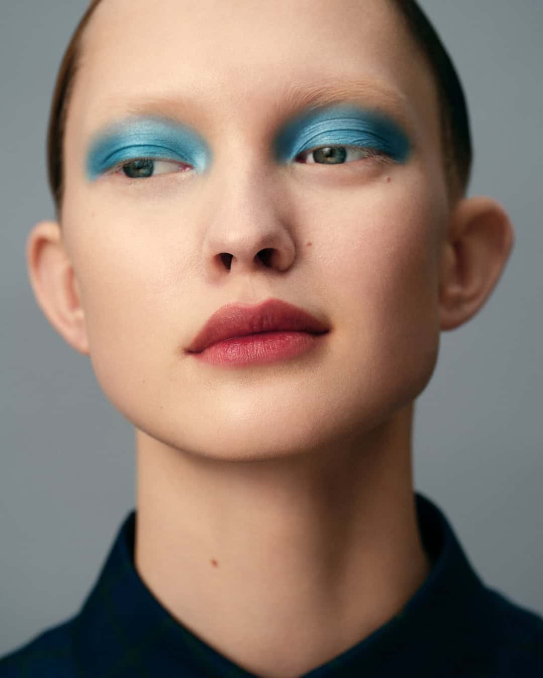 Mere products alone, no matter how good, can’t make a shoot look like this, though. It does take the hand of a master, no matter how modest that master may be, to make colour look so modern. Even an emphatic blush that Philips manages to make look natural and beautiful, somehow both strong and bold and also as light as air. For that particular effect he says he likes to play with the Backstage Glow Stick blushes “and I blend them into the foundation, so they become like part of the skin texture. In a way, the girls look very nude. It’s not a nude make-up but there’s a nudeness, a pureness, to them, even though they’re wearing blood-red lipstick and eyeshadow.” As for the rest of the face, what brings all those hues up to date is a lack of any kind of harsh lines to the look. With the mascara he avoided black, so it doesn’t become too severe, and went for blue or pink. “There’s no eyeliner and, with the lips, though they’re drawn and some of them are blended, there’s no liner. There’s no sculpting or highlighting with the blush or the highlighters, it’s all bleeding into each other, all soft shadows. Even the blue eyeshadow is not like a colour block, it fuses into the shadows and blends into the side of the face, almost like a soft, cloudy, blue eyeshadow that blends into those non-existent eyebrows.” The collective effect “creates something painterly”, he says, “almost like a medieval portrait”.