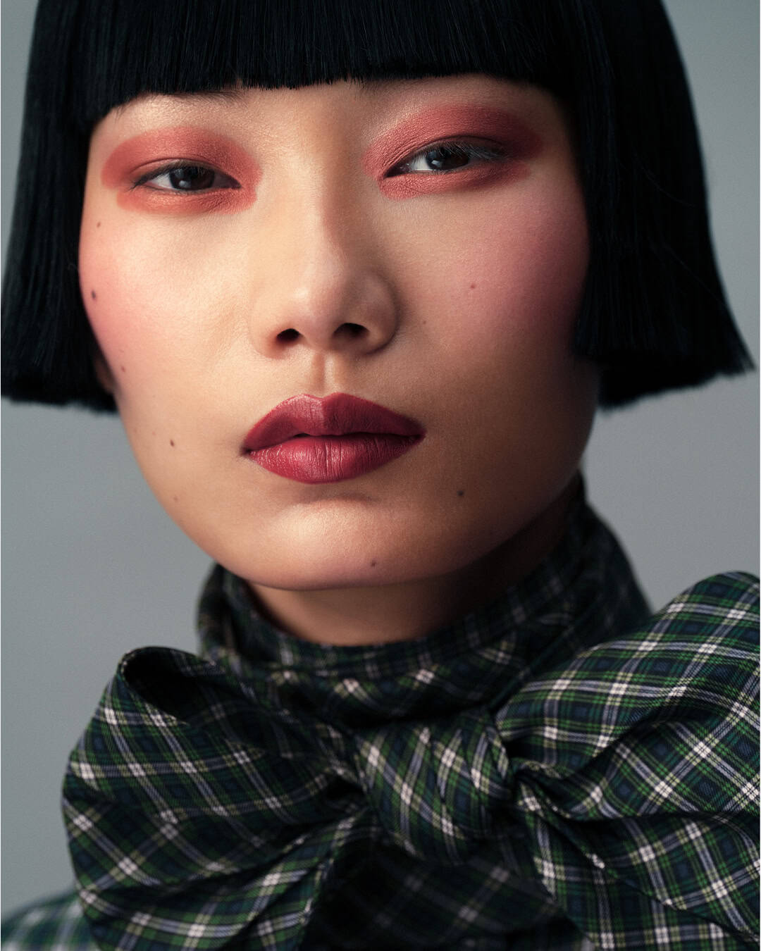 Ruyu wears on skin Dior Forever Skin Wear in 2N and Dior Forever Skin Correct in 0.5N; on cheeks Dior Backstage Rosy Glow Stick in 015 Cherry and 063 Pink Lilac and Dior Forever Glow Luminizer in 03 Pink Halo; on eyes Dior Backstage Glow Maximizer Palette in 001 Universal Glow and Diorshow 5 Couleurs in 670 Sunset Bronze; on lips Rouge Dior lipstick in 802 Red Passion Velvet; on nails Dior Vernis in 582 Azur. All by DIOR MAKEUP