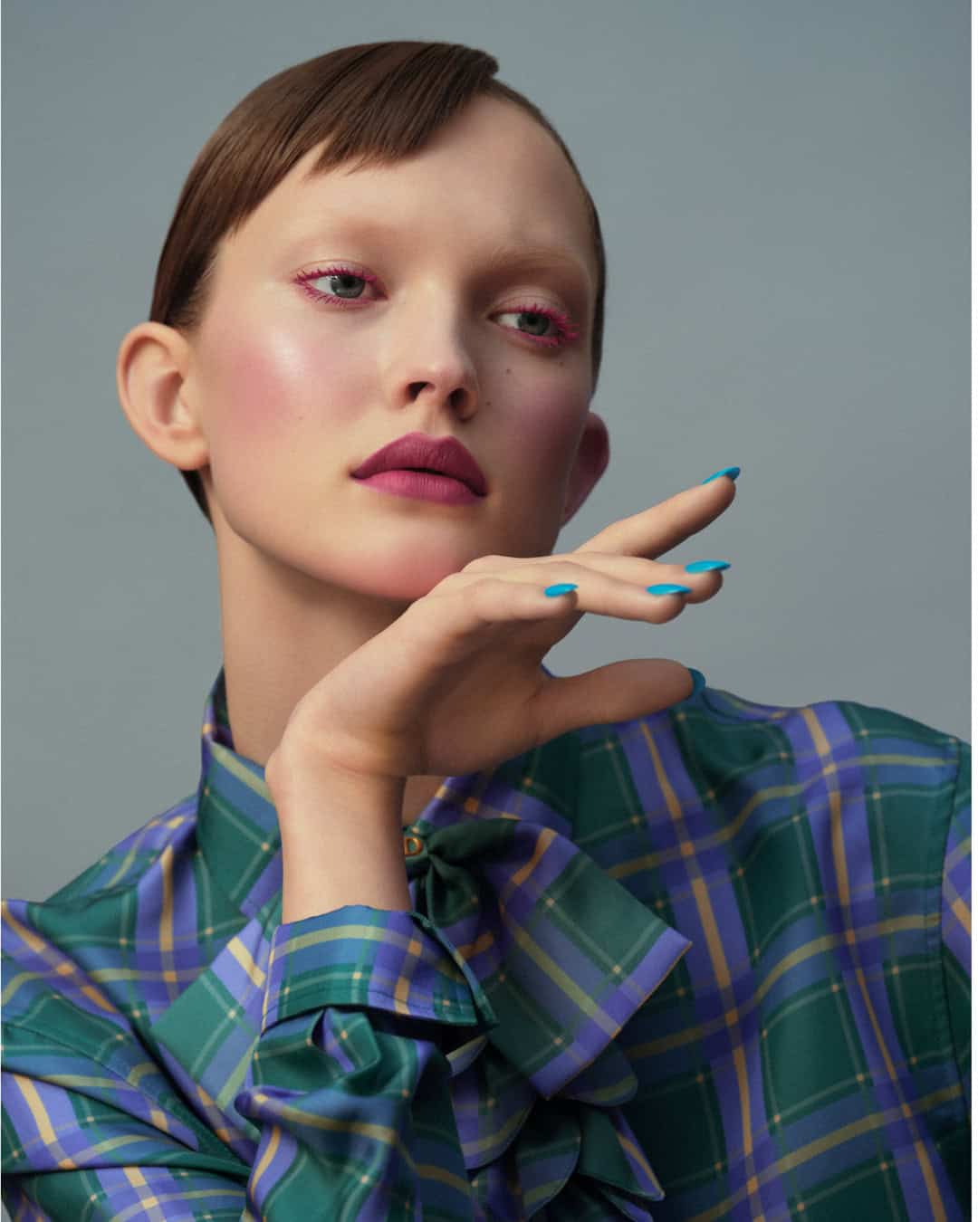 Viktoria wears on skin Dior Forever Skin Wear in 0N and Dior Forever Skin Correct in 00N; on cheeks Dior Backstage Rosy Glow Stick in 006 Berry and Dior Backstage Glow Maximizer Palette in 001 Universal Glow; on eyes Diorshow Overvolume mascara in 840 Overpink and Diorshow 5 Couleurs in 855 Rose Moiré; on lips Rouge Dior in 581 Virevolte Velvet; on nails Dior Vernis in 582 Azur. All by DIOR MAKEUP