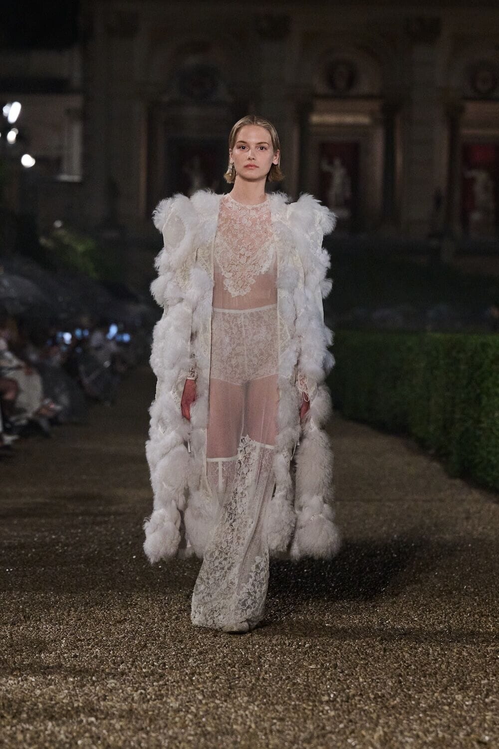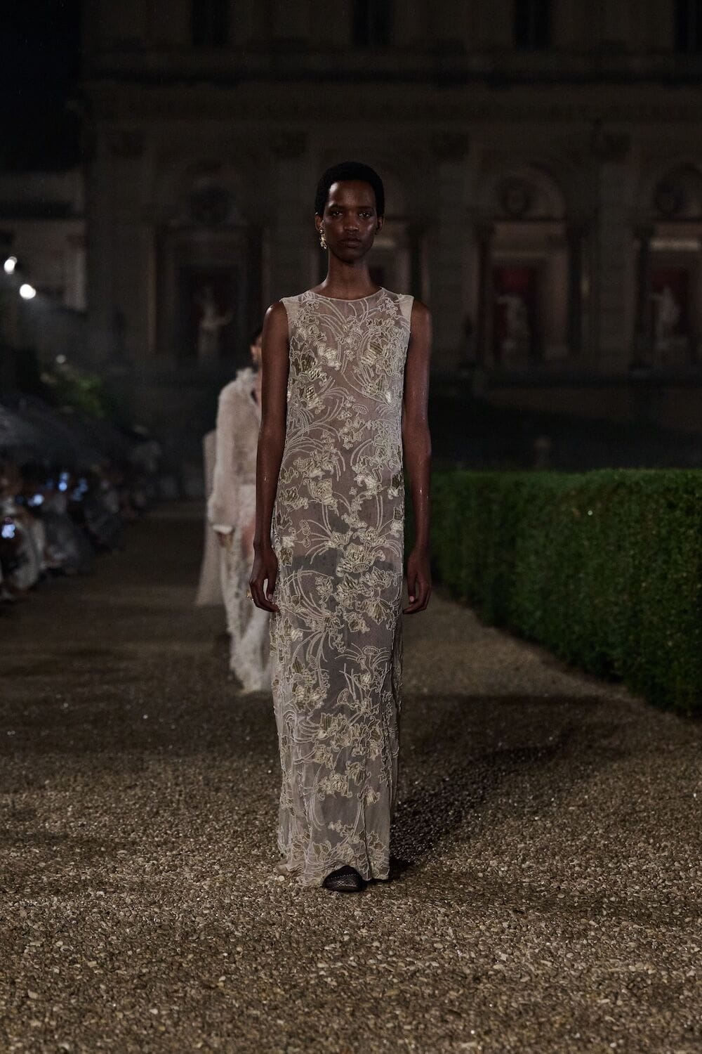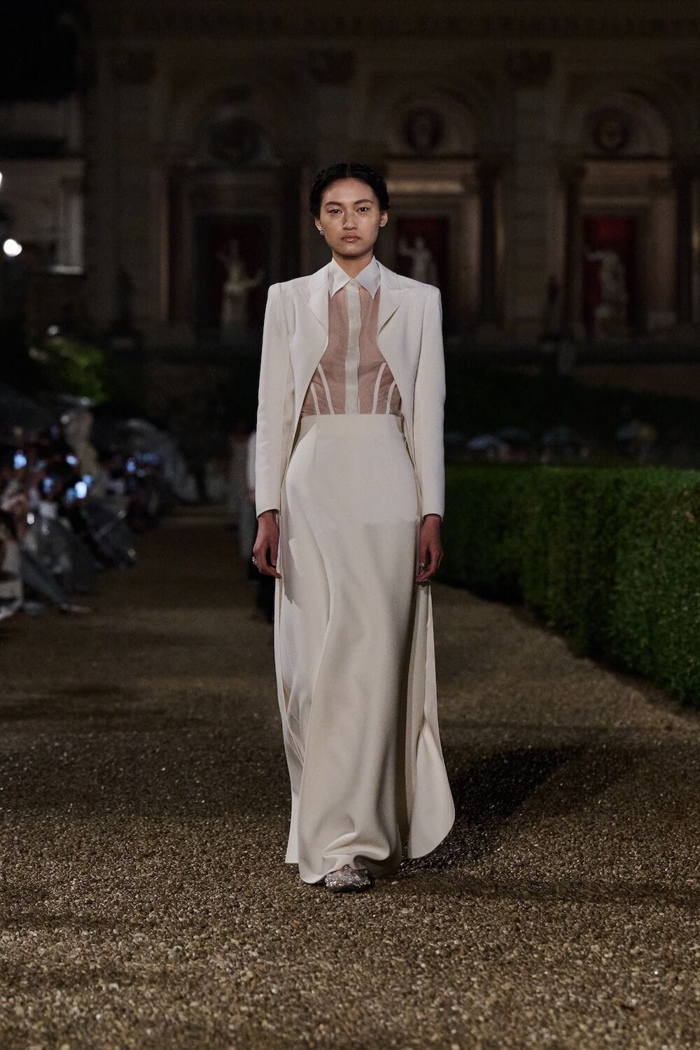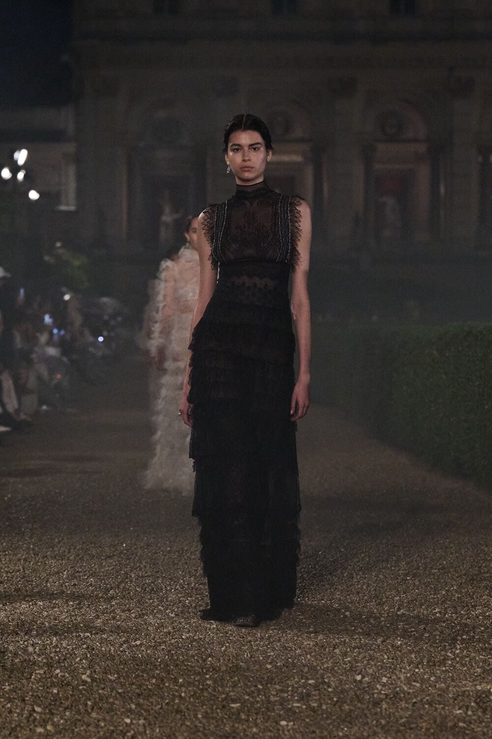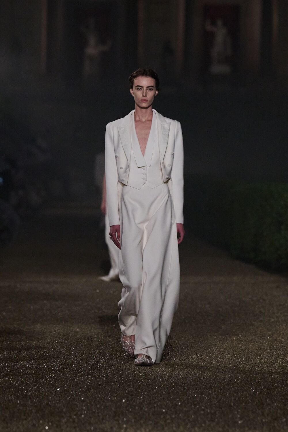 As the sun set, a mist rolled over the Villa’s famous gardens, offering a suitably cinematic backdrop for the models, who crunched along its gravel pathways. Chiuri mixed haute couture pieces in with her cruise collection, which married ethereal delicacy with androgynous tailoring. “You see the craft,” said Chiuri of her black and white color palette (which also extended to the guests). It was inspired by a Man Ray photograph of a Bal Blanc, thrown in 1930 by art patron Mimì Pecci Blunt, who also founded the Rome’s Teatro Della Cometa, the 1950’s theater that Chiuri and her daughter, Rachele Regini, have painstakingly restored over the past four years.