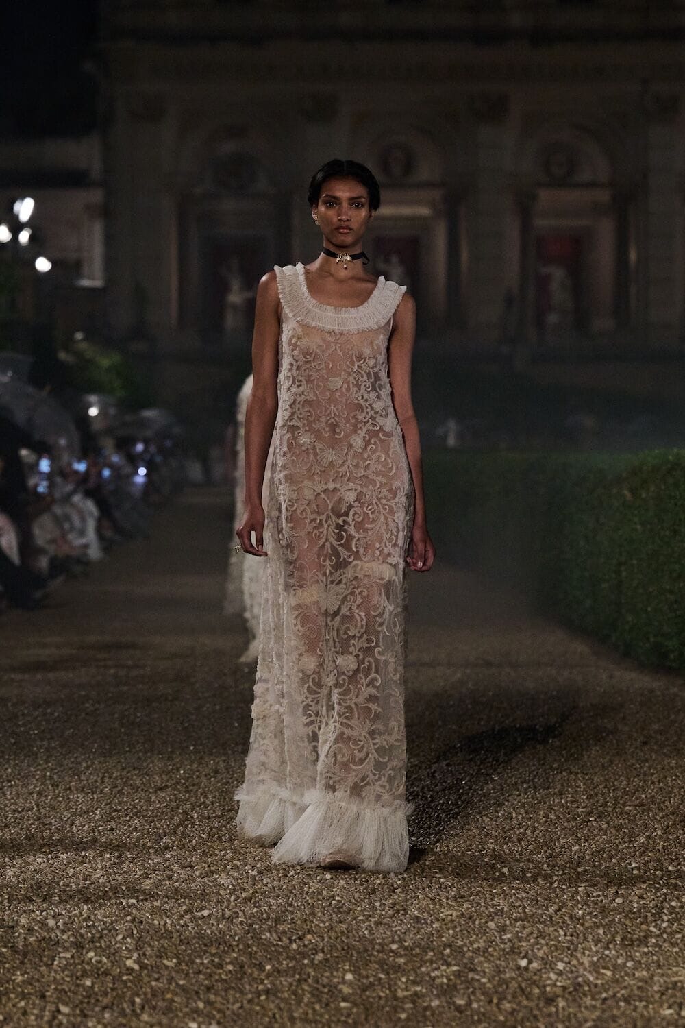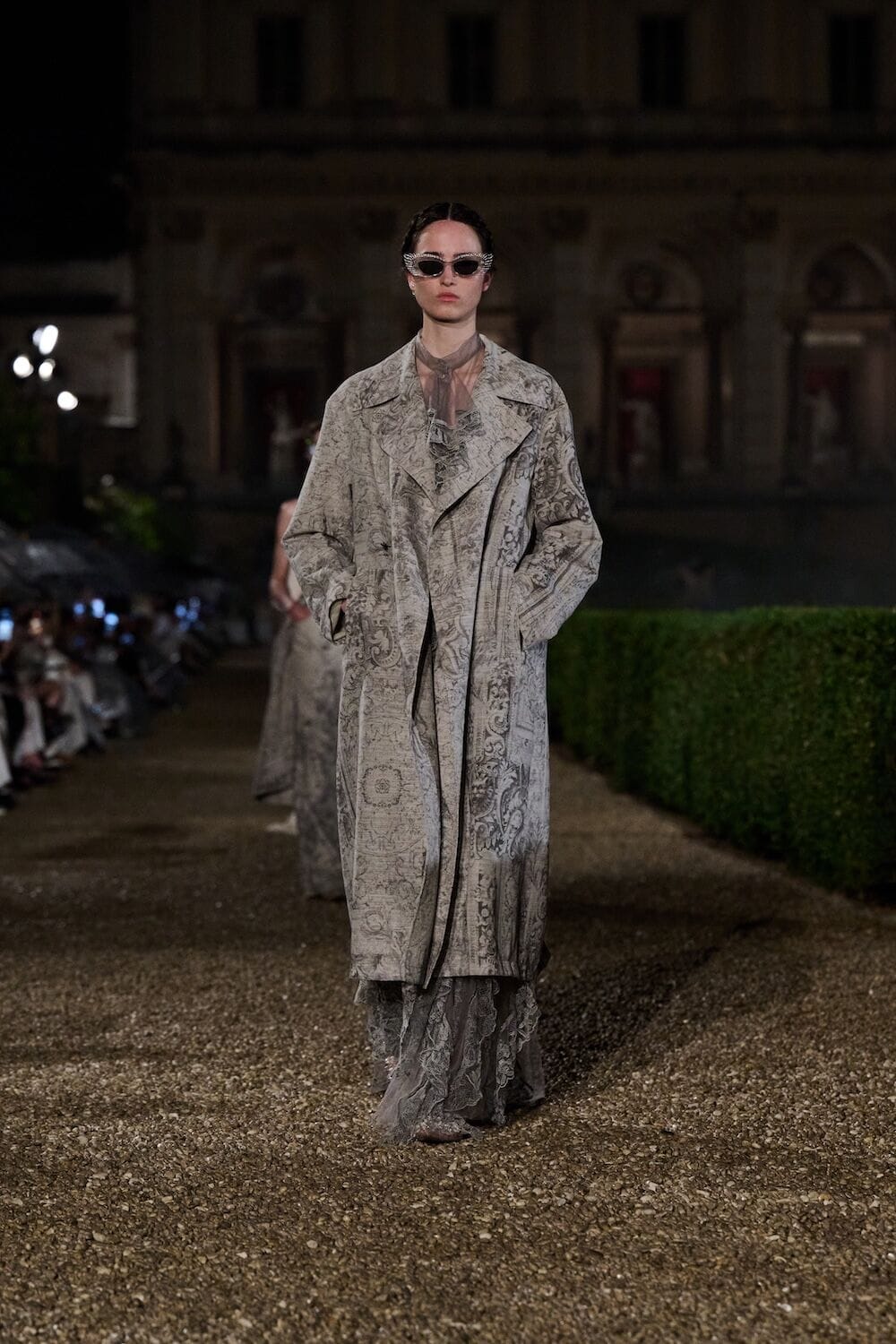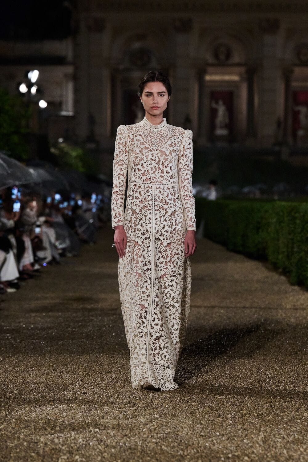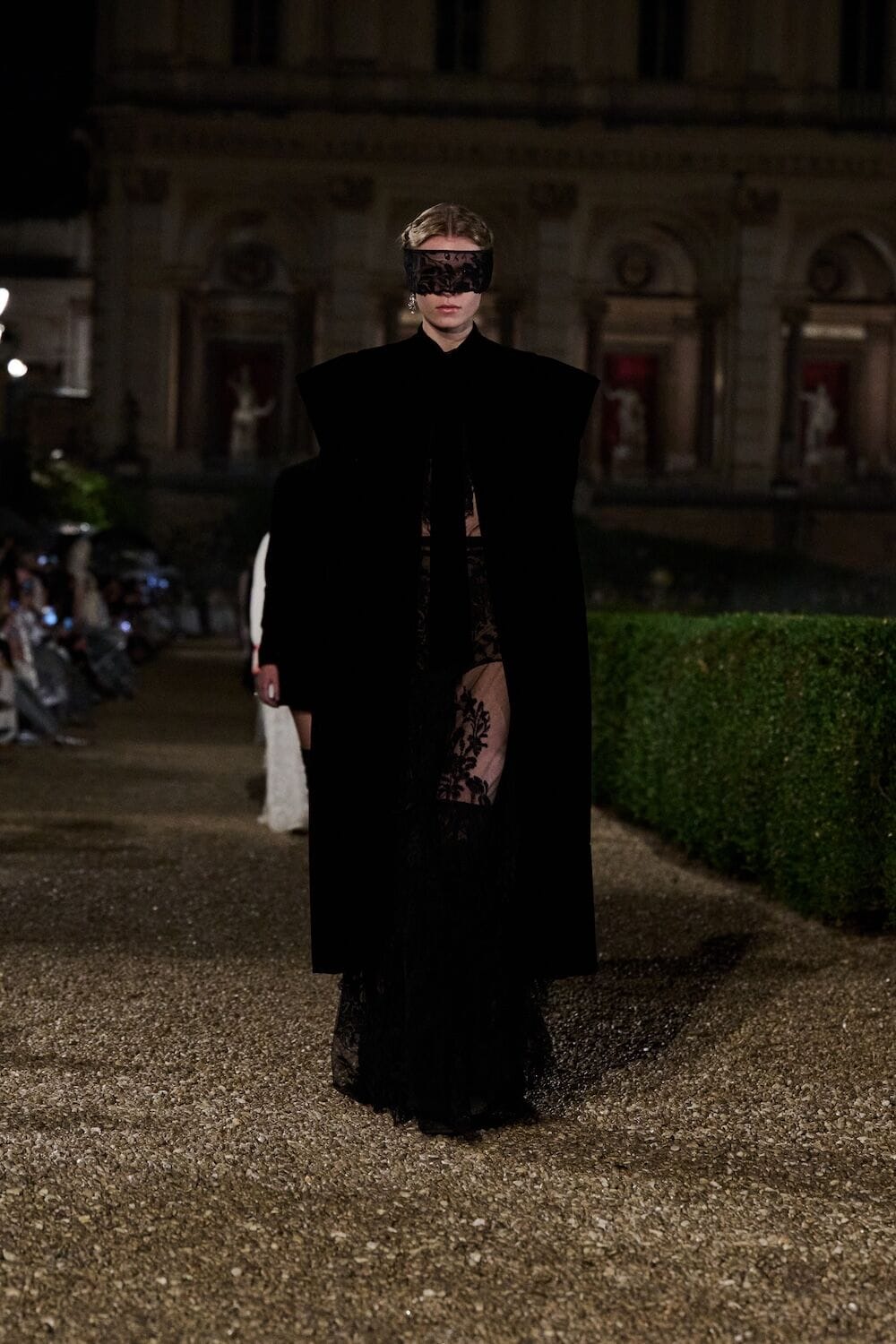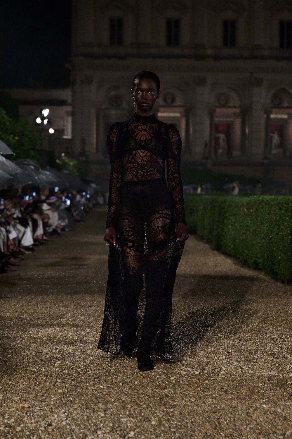 As the sun set, a mist rolled over the Villa’s famous gardens, offering a suitably cinematic backdrop for the models, who crunched along its gravel pathways. Chiuri mixed haute couture pieces in with her cruise collection, which married ethereal delicacy with androgynous tailoring. “You see the craft,” said Chiuri of her black and white color palette (which also extended to the guests). It was inspired by a Man Ray photograph of a Bal Blanc, thrown in 1930 by art patron Mimì Pecci Blunt, who also founded the Rome’s Teatro Della Cometa, the 1950’s theater that Chiuri and her daughter, Rachele Regini, have painstakingly restored over the past four years.