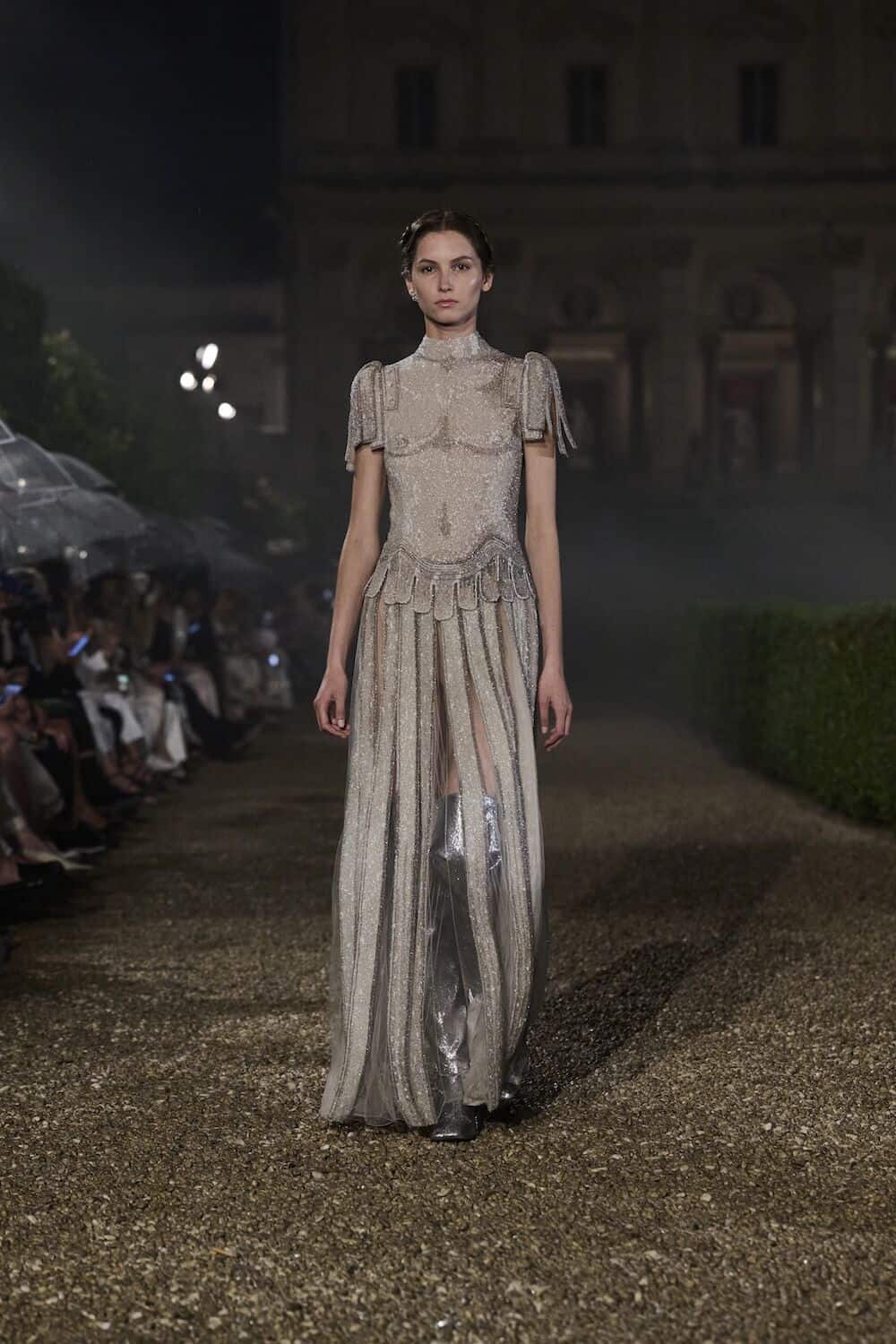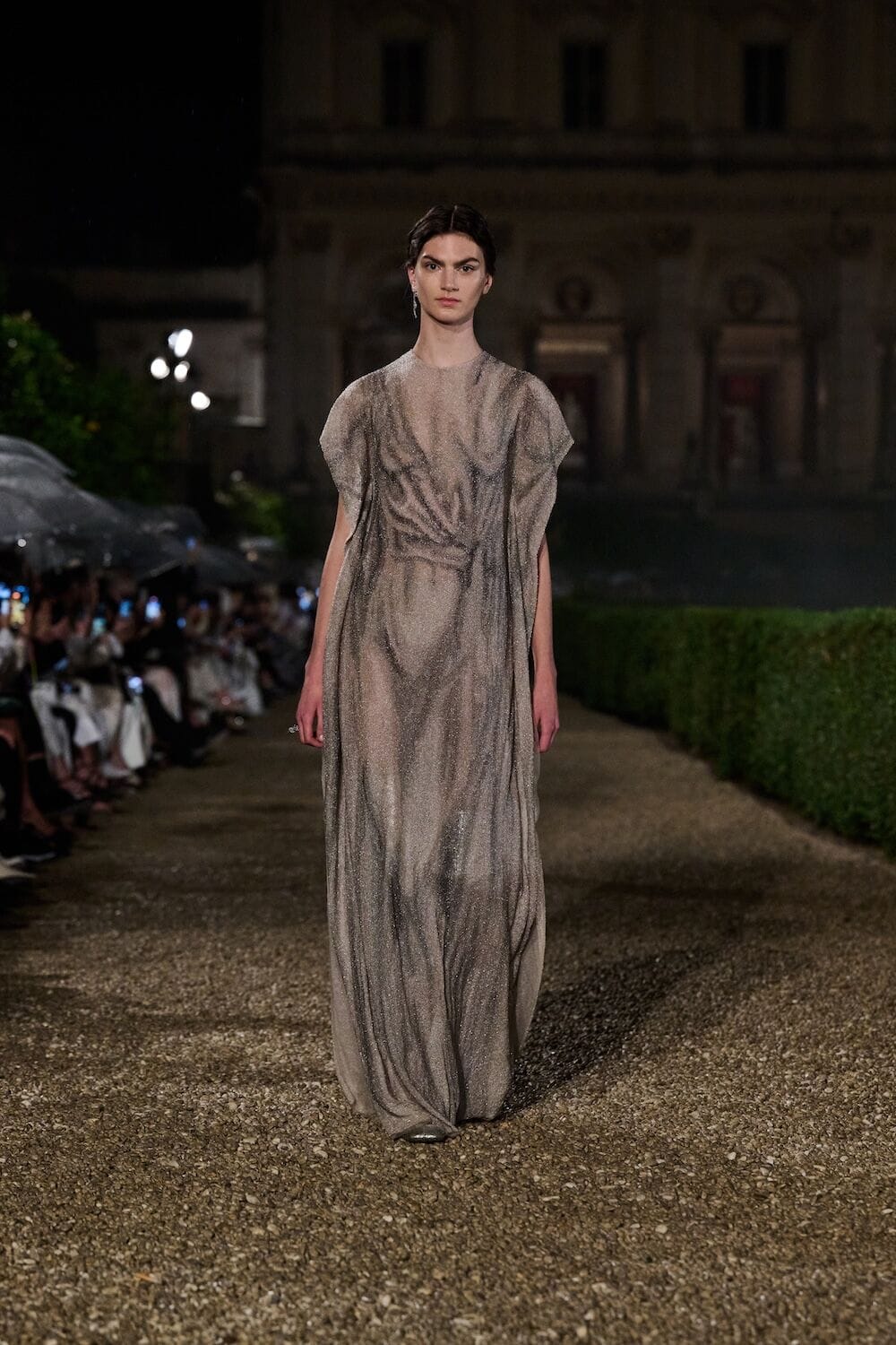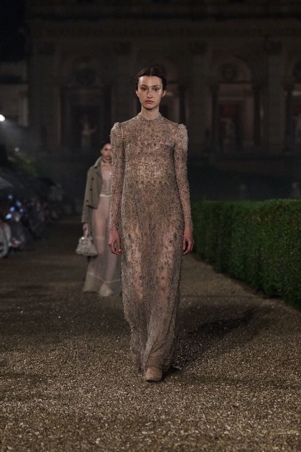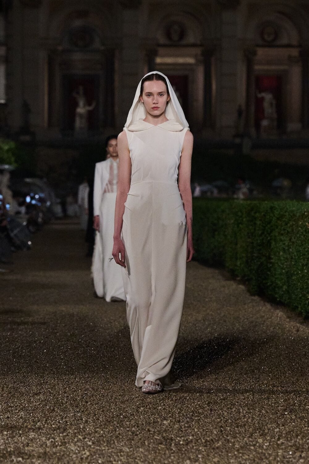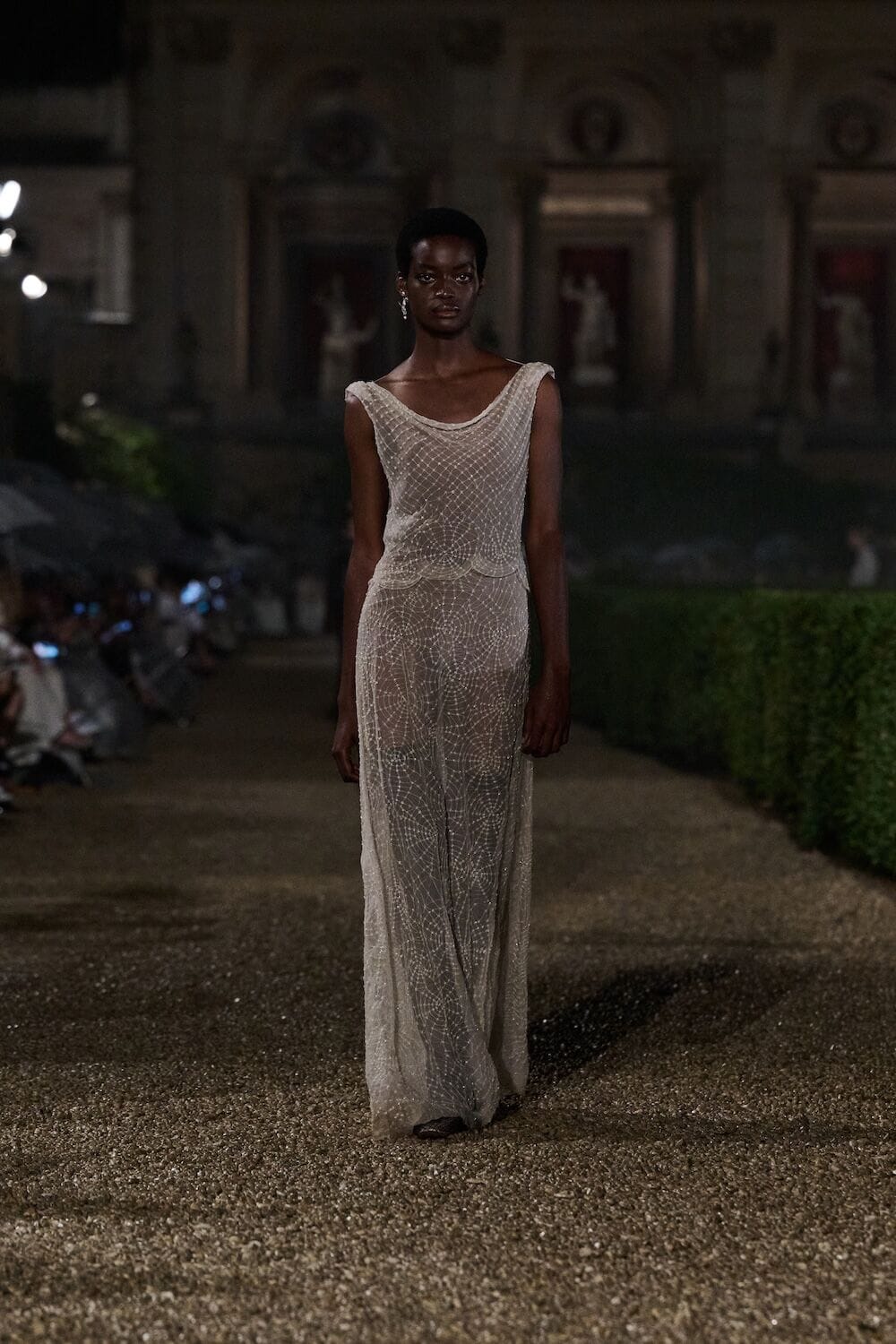 As the sun set, a mist rolled over the Villa’s famous gardens, offering a suitably cinematic backdrop for the models, who crunched along its gravel pathways. Chiuri mixed haute couture pieces in with her cruise collection, which married ethereal delicacy with androgynous tailoring. “You see the craft,” said Chiuri of her black and white color palette (which also extended to the guests). It was inspired by a Man Ray photograph of a Bal Blanc, thrown in 1930 by art patron Mimì Pecci Blunt, who also founded the Rome’s Teatro Della Cometa, the 1950’s theater that Chiuri and her daughter, Rachele Regini, have painstakingly restored over the past four years.