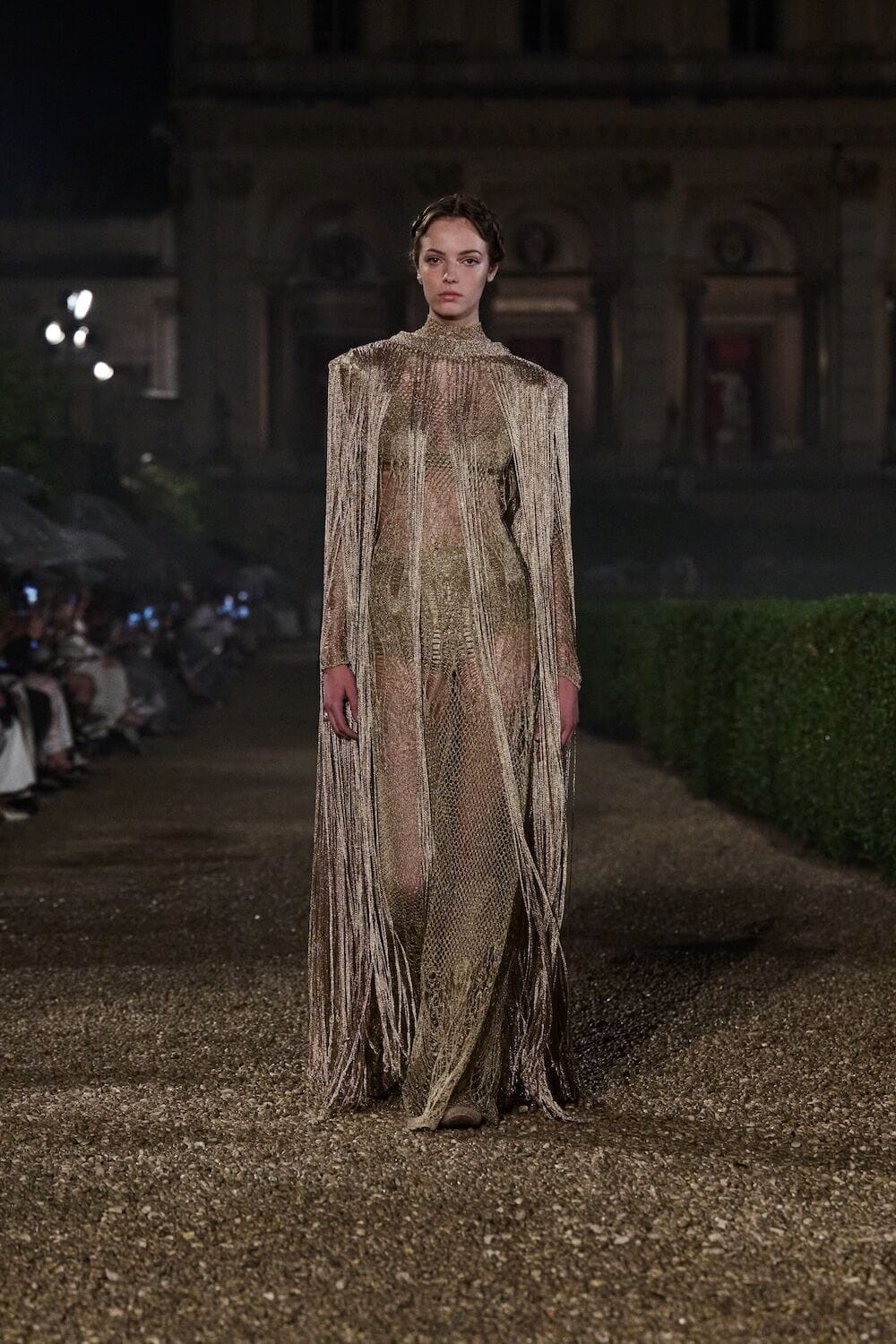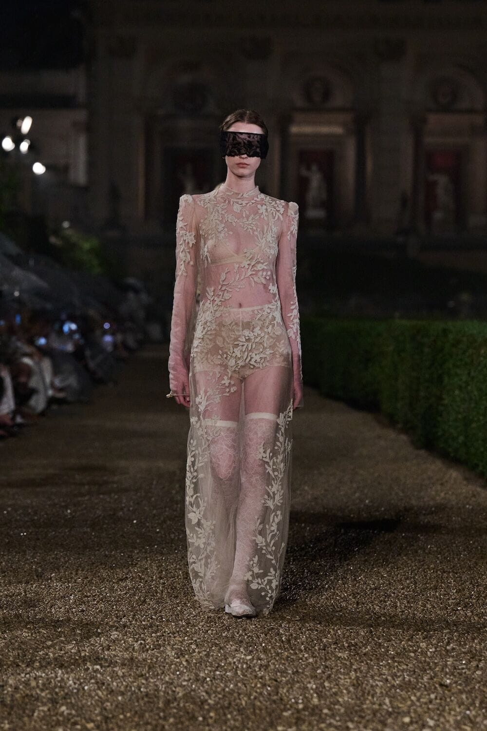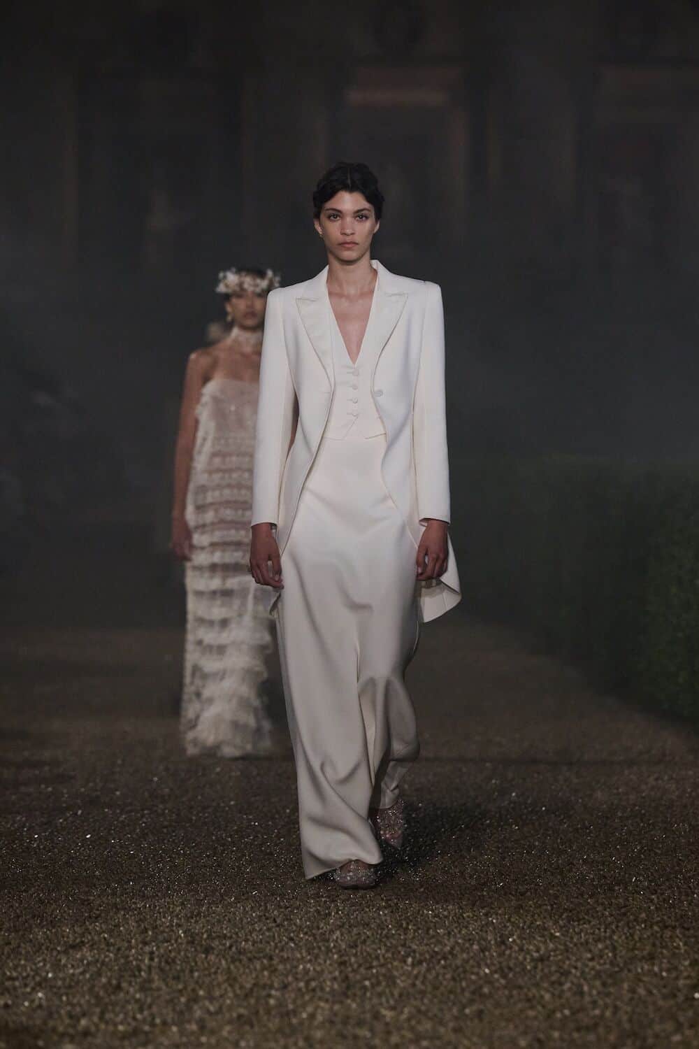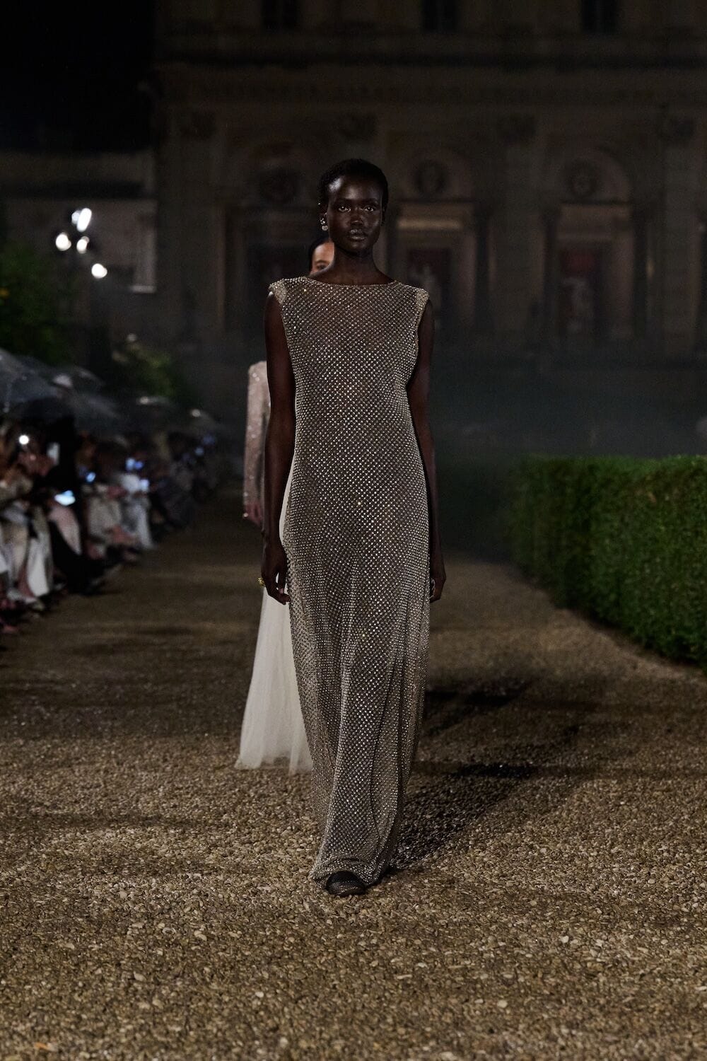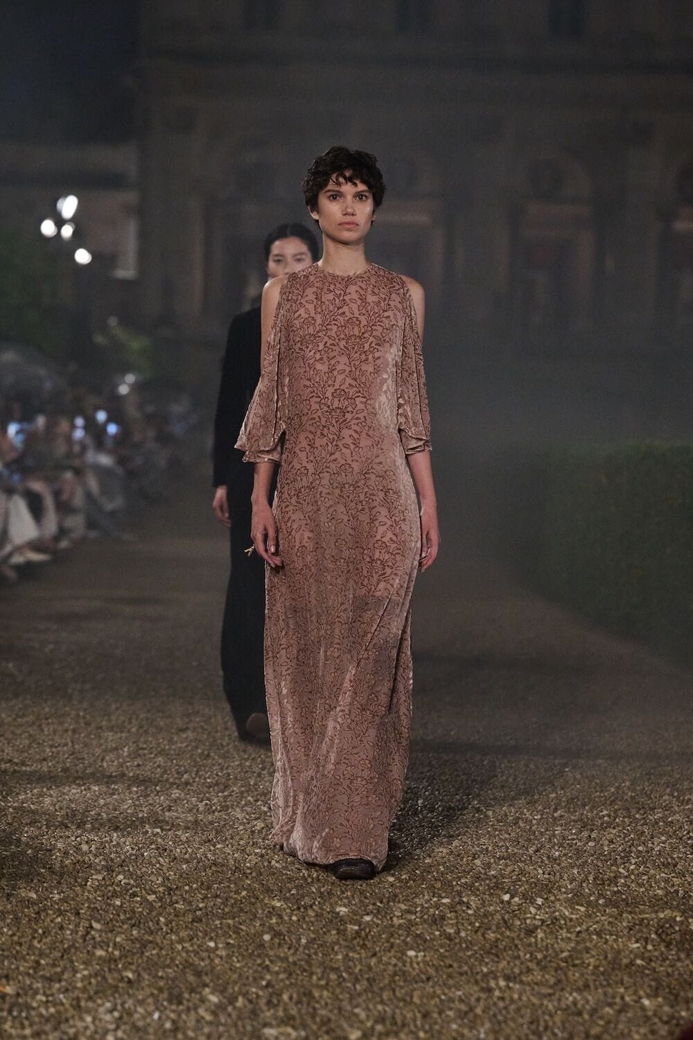 As the sun set, a mist rolled over the Villa’s famous gardens, offering a suitably cinematic backdrop for the models, who crunched along its gravel pathways. Chiuri mixed haute couture pieces in with her cruise collection, which married ethereal delicacy with androgynous tailoring. “You see the craft,” said Chiuri of her black and white color palette (which also extended to the guests). It was inspired by a Man Ray photograph of a Bal Blanc, thrown in 1930 by art patron Mimì Pecci Blunt, who also founded the Rome’s Teatro Della Cometa, the 1950’s theater that Chiuri and her daughter, Rachele Regini, have painstakingly restored over the past four years.