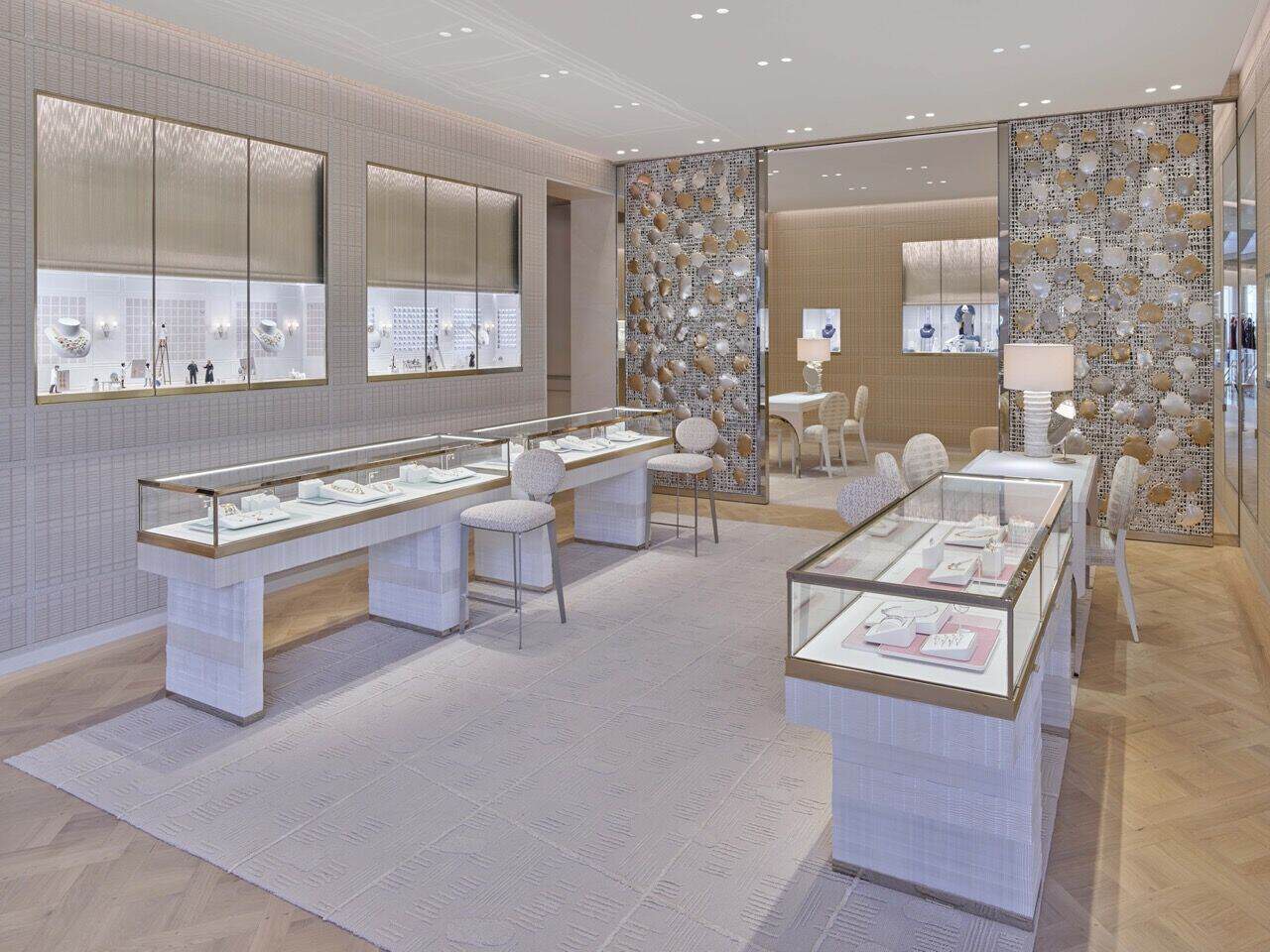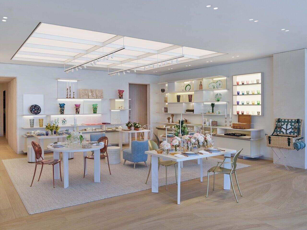 It wouldn’t be a true Dior space if Monsieur Dior’s love for the artists of his time wasn’t honored. A curated selection of remarkable works is displayed throughout the boutique, including pieces by Karine Laval, Adam McEwen, Florian & Michael Quistrebert, Jorge Galindo, Adam Fuss, and a vibrant commissioned painting by John McAllister. Furniture by Franck Evennou, Ado Chale, and Vladimir Kagan, along with custom panels of gilded and lacquered metal by Nancy Lorenz, further enrich the atmosphere.