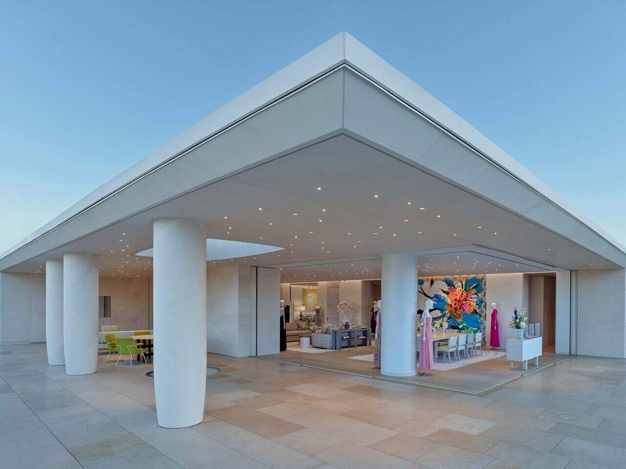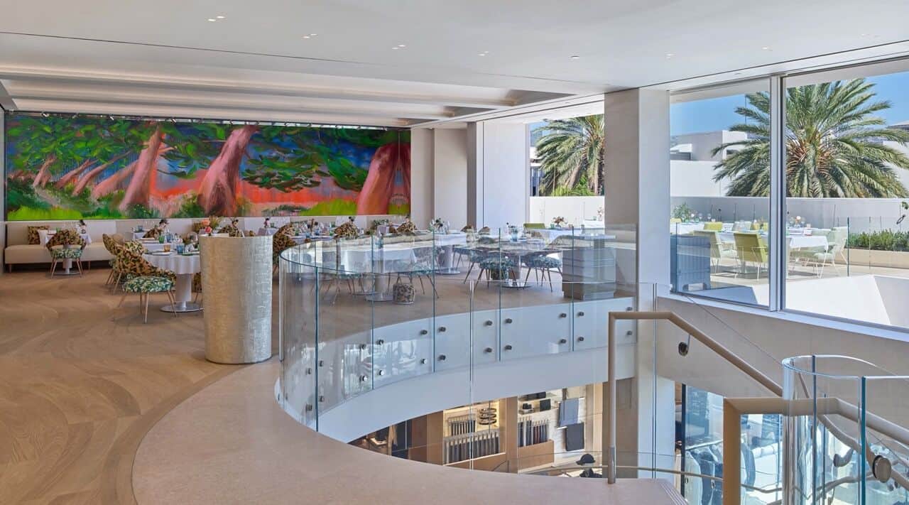 Like its New York City sister, every design detail is planned to reflect the city it calls home. You’ll notice that immediately upon arrival: framed by the palm trees lining the drive, you approach a pared-back yet impressive white mansion. The window displays are filled with miniature vignettes, showcasing film sequences, red carpet moments, and behind-the-scenes glimpses of Monsieur Dior’s great odyssey in the United States. Designed by architect Peter Marino, the space is meant to be a “realm of dreams.” As such, you’ll find four floors of fashion, art, botanicals, and gastronomy. With an interior bathed in golden light and subtly adorned with the House’s signature codes, it’s the perfect blend of Parisian heritage with Californian modernity.