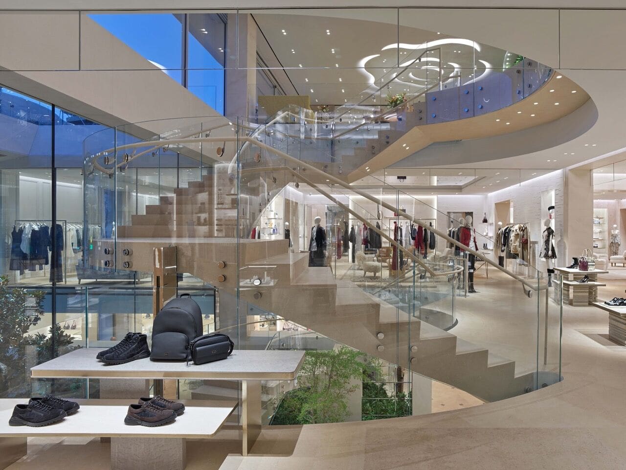 In the center of the boutique you’ll notice a magnificent undulating staircase that winds through a three-story garden. Created to exude a lightness, it makes you feel as though you’re floating from floor to floor. And speaking of the floors, the first two feature women’s and men’s ready-to-wear collections, along with leather goods, jewelry, fragrances, and Dior Maison. Several limited-edition pieces have been specially produced to mark the opening of the West Coast boutique.
