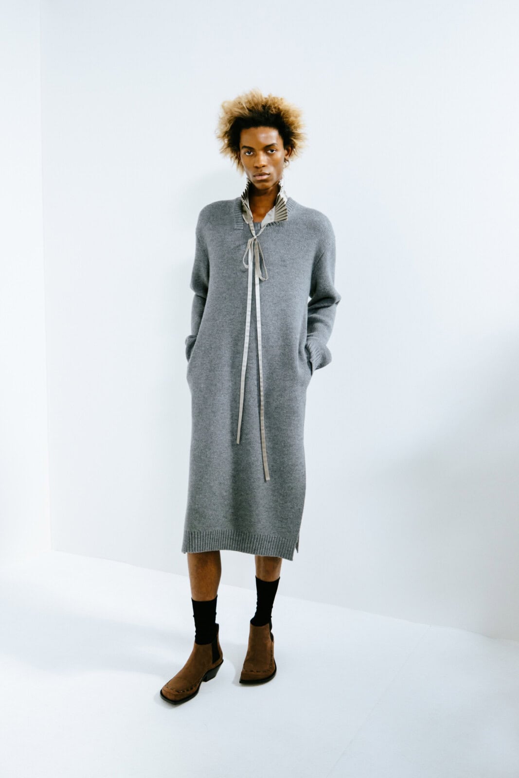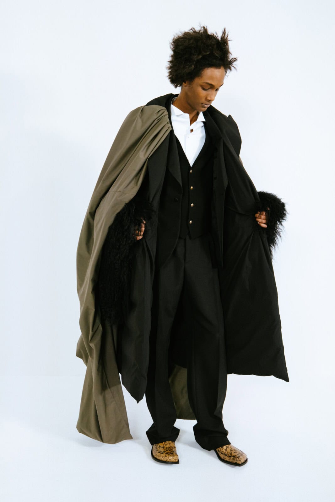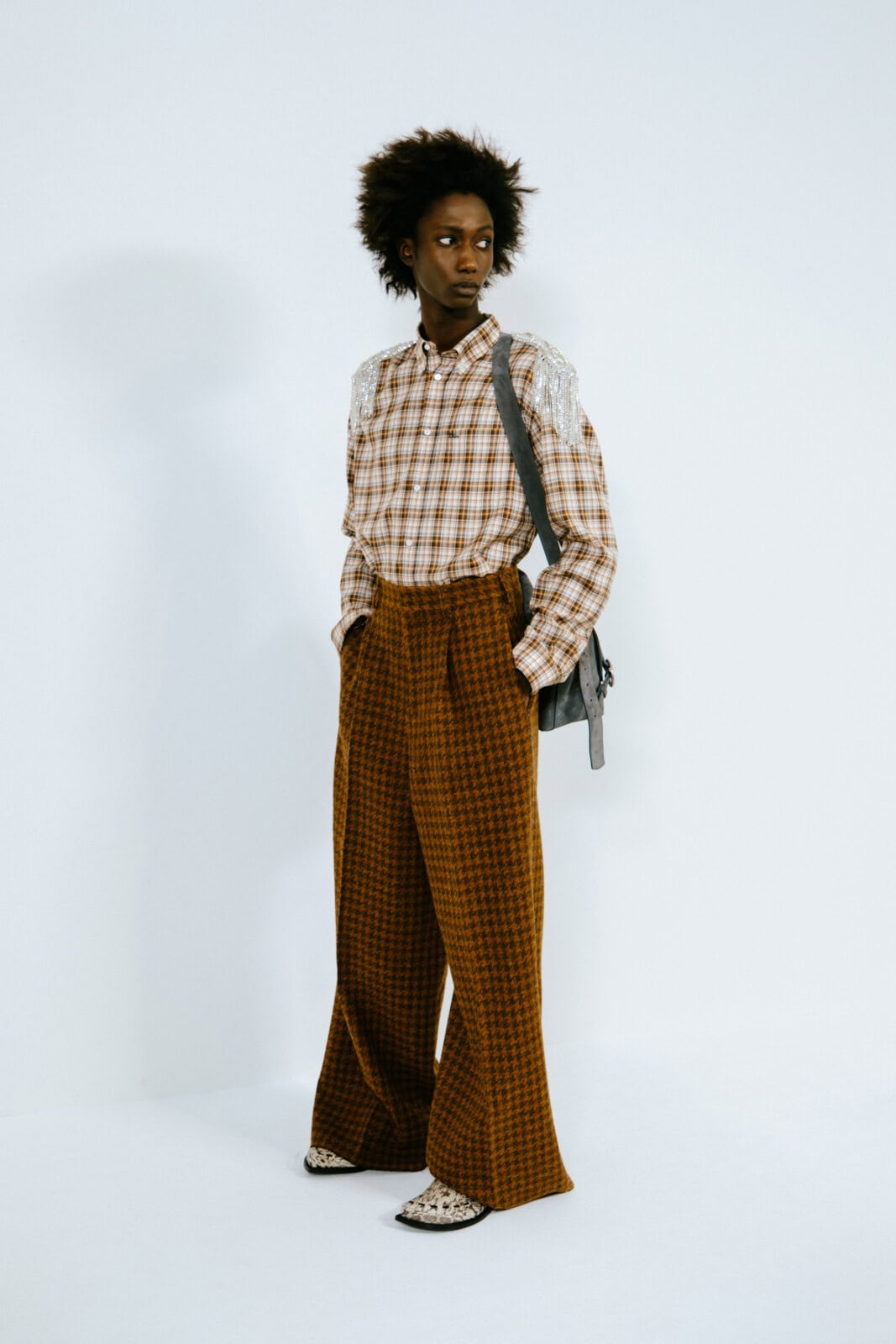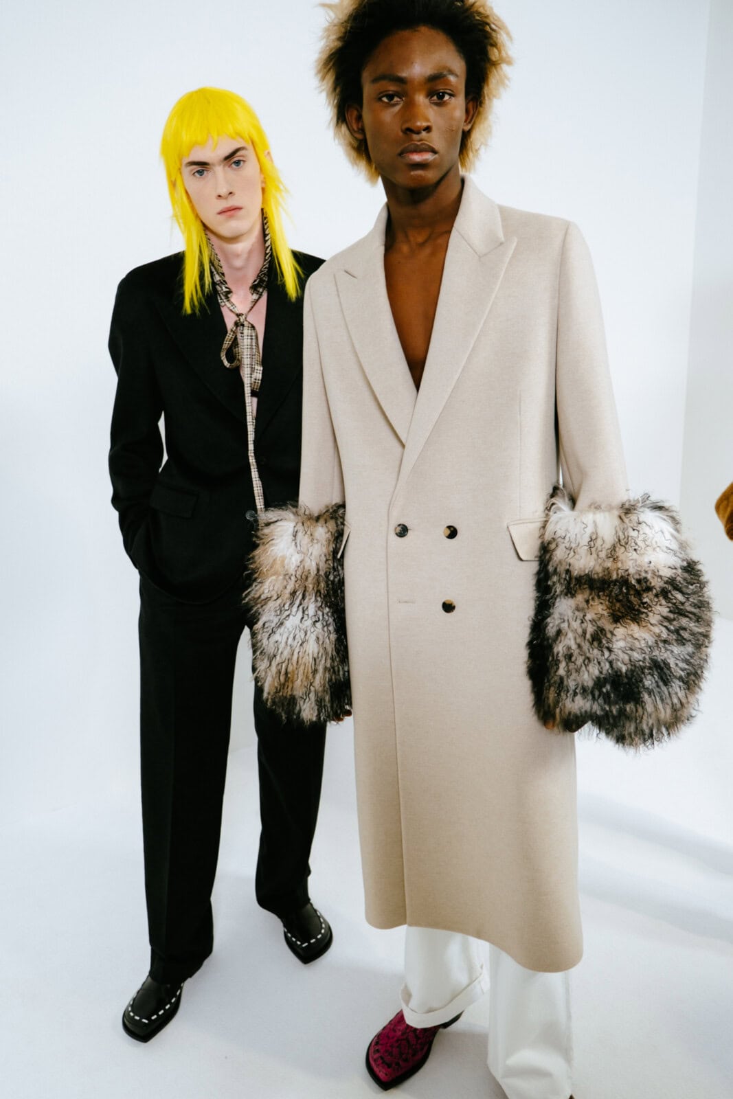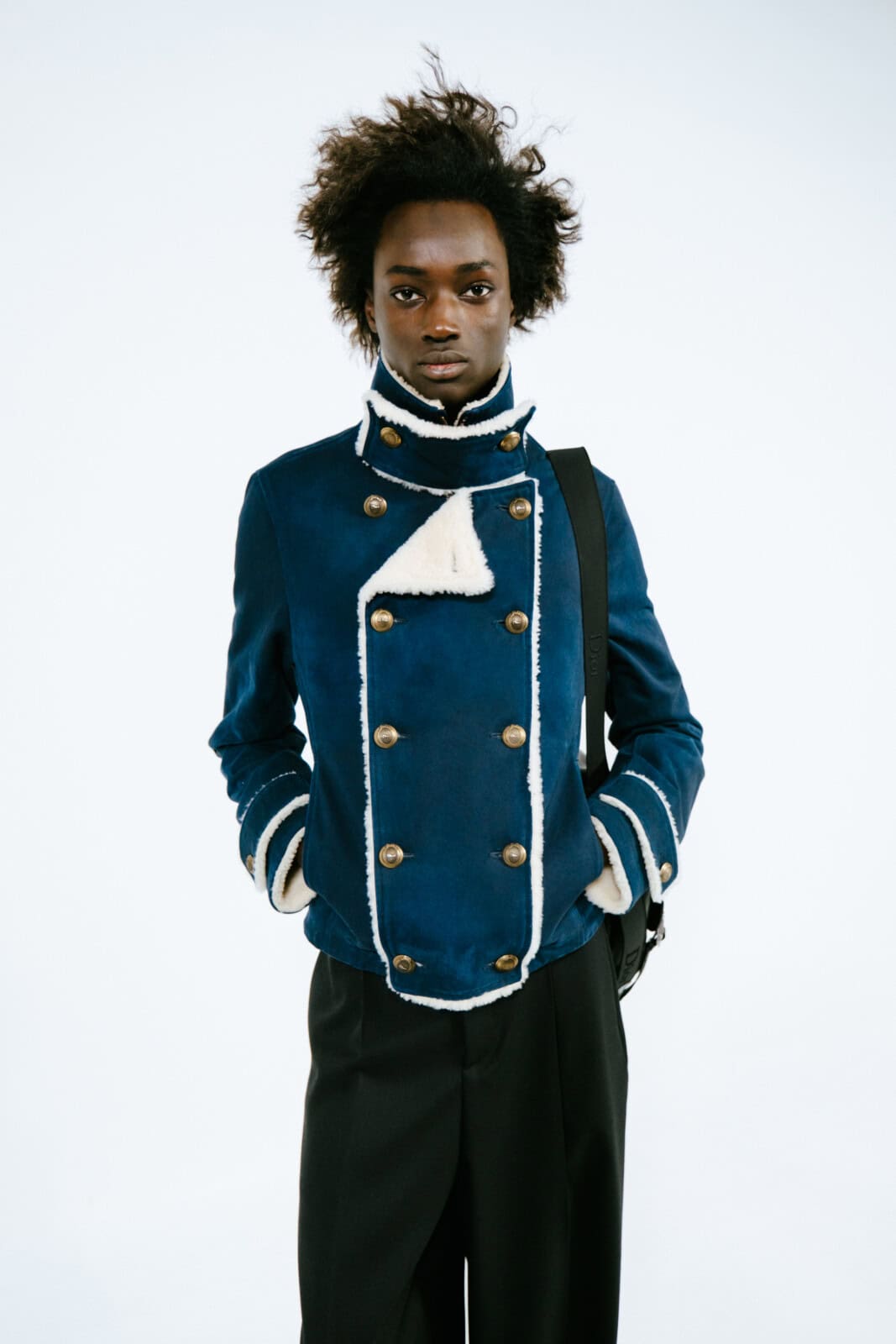 Throughout, Anderson pushed hallmarks of the man’s wardrobe with a wink and a nudge. Shirts came with shiny, embroidered epaulettes. Overcoats had monstrous furry cuffs. Messenger bags looked as if they were crafted from torn-up carpets. The designer’s exploration of dressing up saw him play with proportions. Many of the coats were bulbous and cocooning, including swollen bomber jackets that migrated into swirling, brocade capes. In contrast, tailoring was shrunken tight to the body and cut from Donegal tweeds.