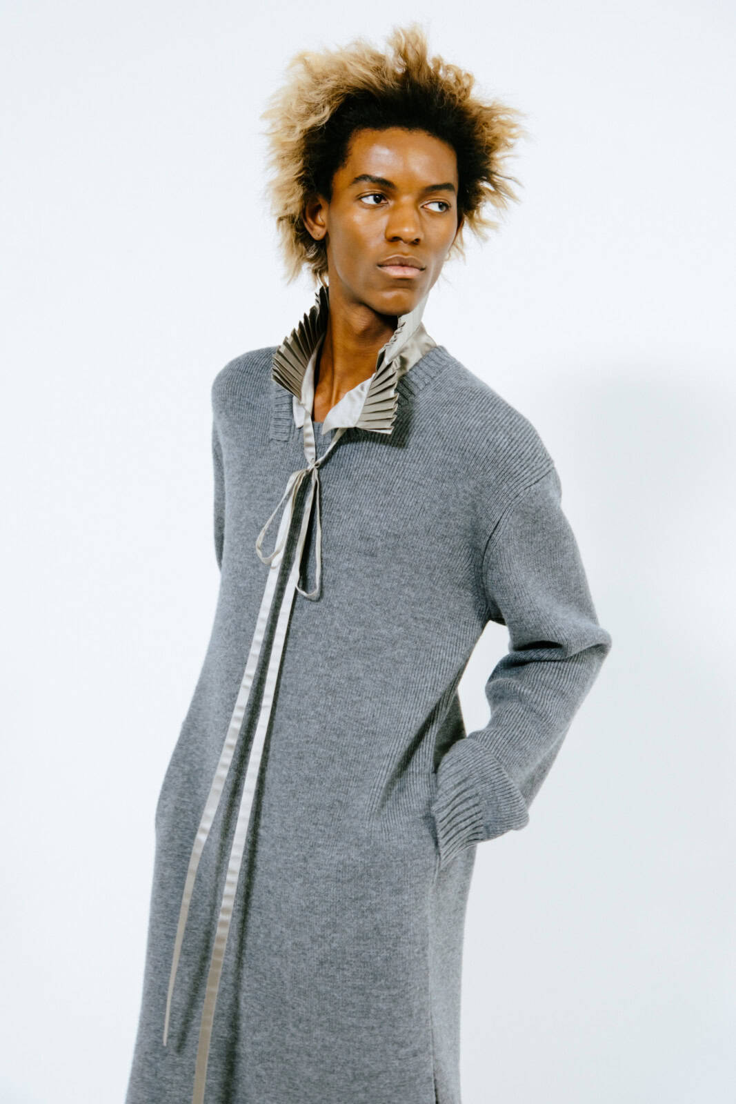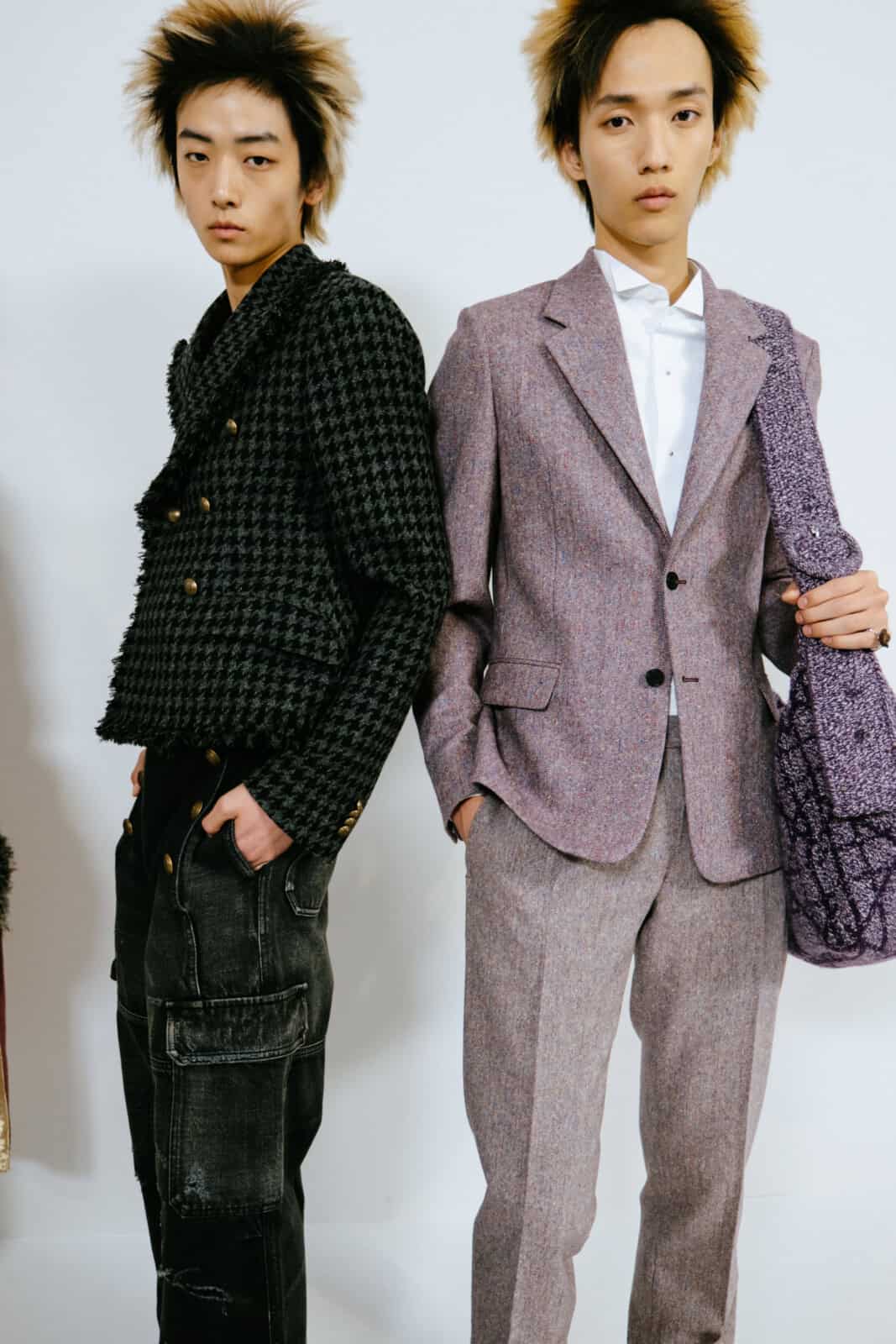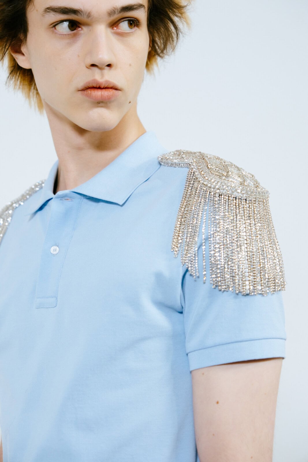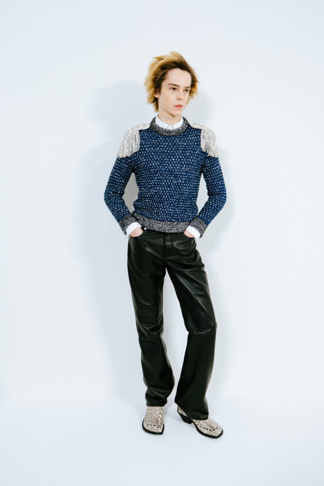 Punkish in attitude (and we’re not just talking about the hair, spiked like it’d been zapped by electricity), the first models out wore drainpipe jeans, rocker boots and camisole-style vests frosted in purple and green sequins. They looked like if Ziggy Stardust and His Spiders From Mars had been teleported to today and were out causing mayhem on the streets of Paris.