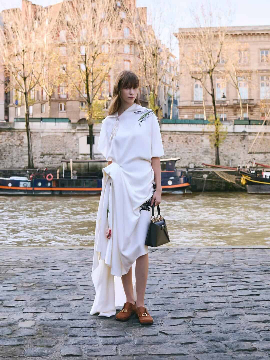 Cascading swathes of silk printed with delicate flora form dresses that have been pinned and gathered to create effortlessly graceful silhouettes. Rich with Dior references, much like his debut, the Bar jacket has inspired long-line, minimalist coats as well as shrunken versions that are threaded with loose bow-tied ribbons. A connoisseur of playing with proportions, oversized slacks and jeans, with triple the amount of fabric required, are paired with simple suede jackets and bouclé cardigans.