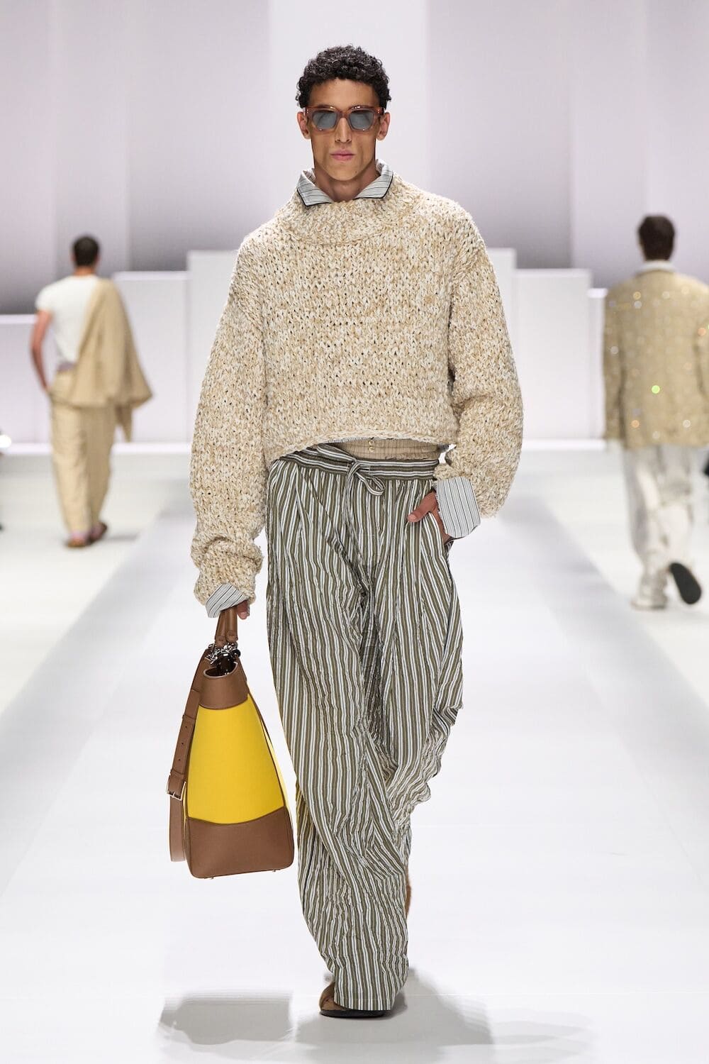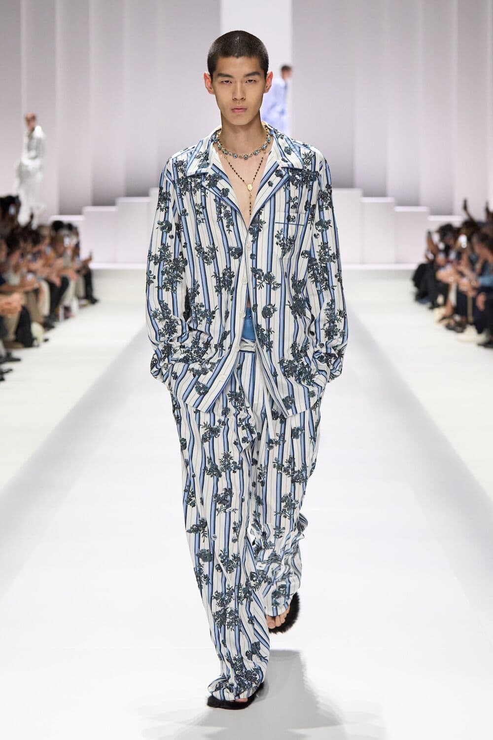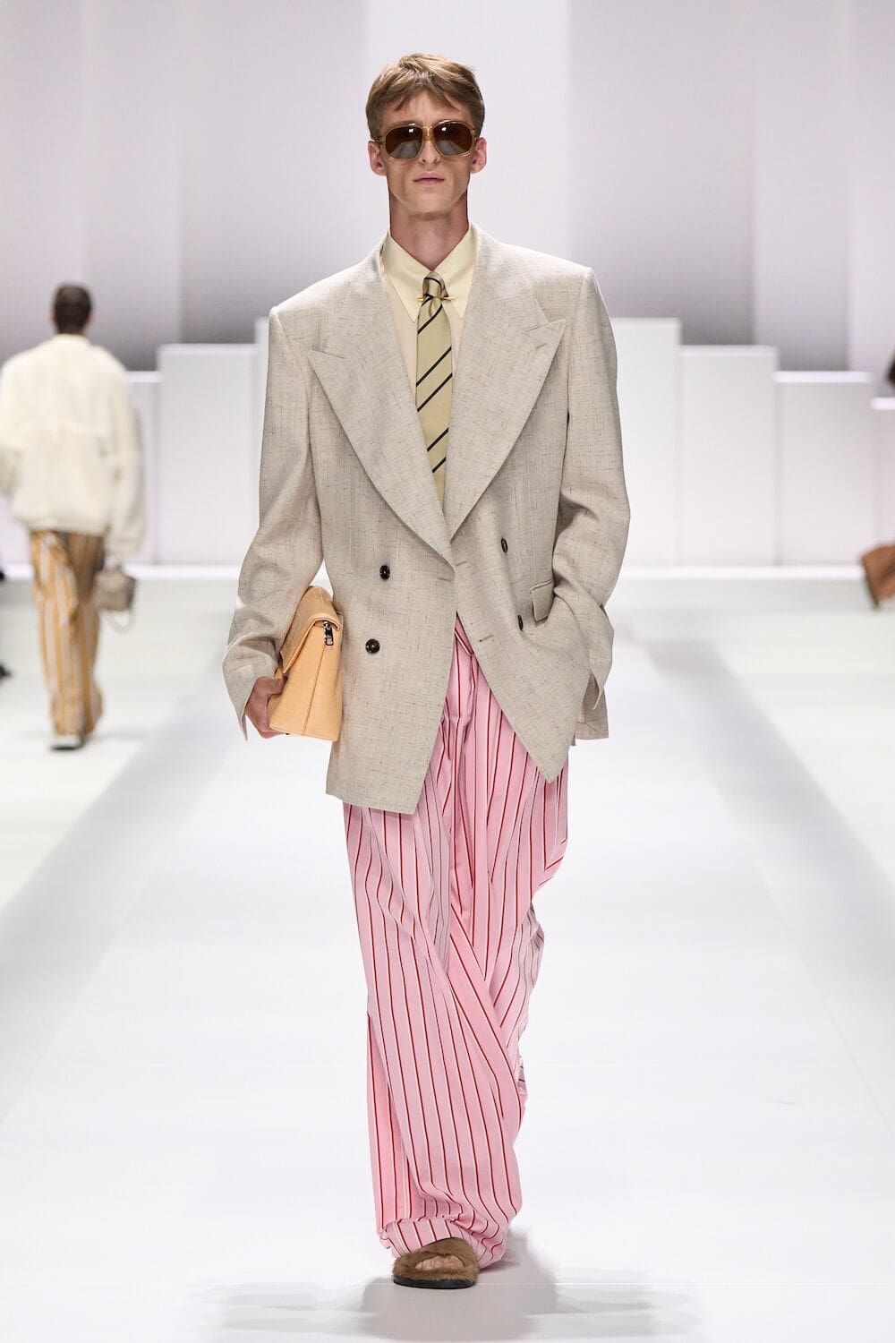 Their building block was your classic pinstriped pyjama, elevated here into an elegant addition to your everyday wardrobe. On the menu was PJ twinsets, cut baggy and left crinkled, in a series of delightful colourways including muddy browns, dusty pinks, pistachios and classic blues. When paired with slouched fisherman jumpers and oversized tux jackets, your beloved home comforts suddenly became as suave as a classic suit trouser.