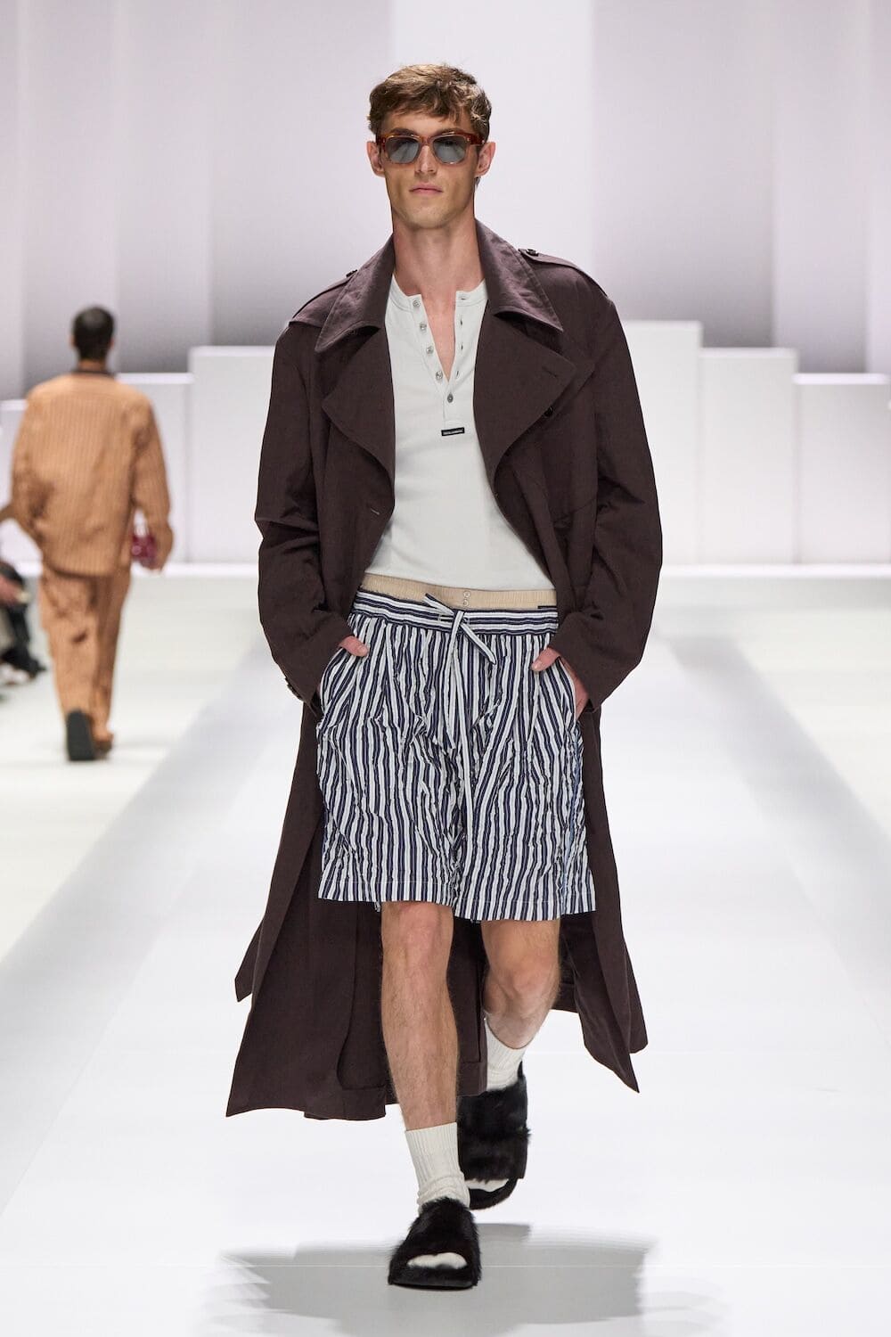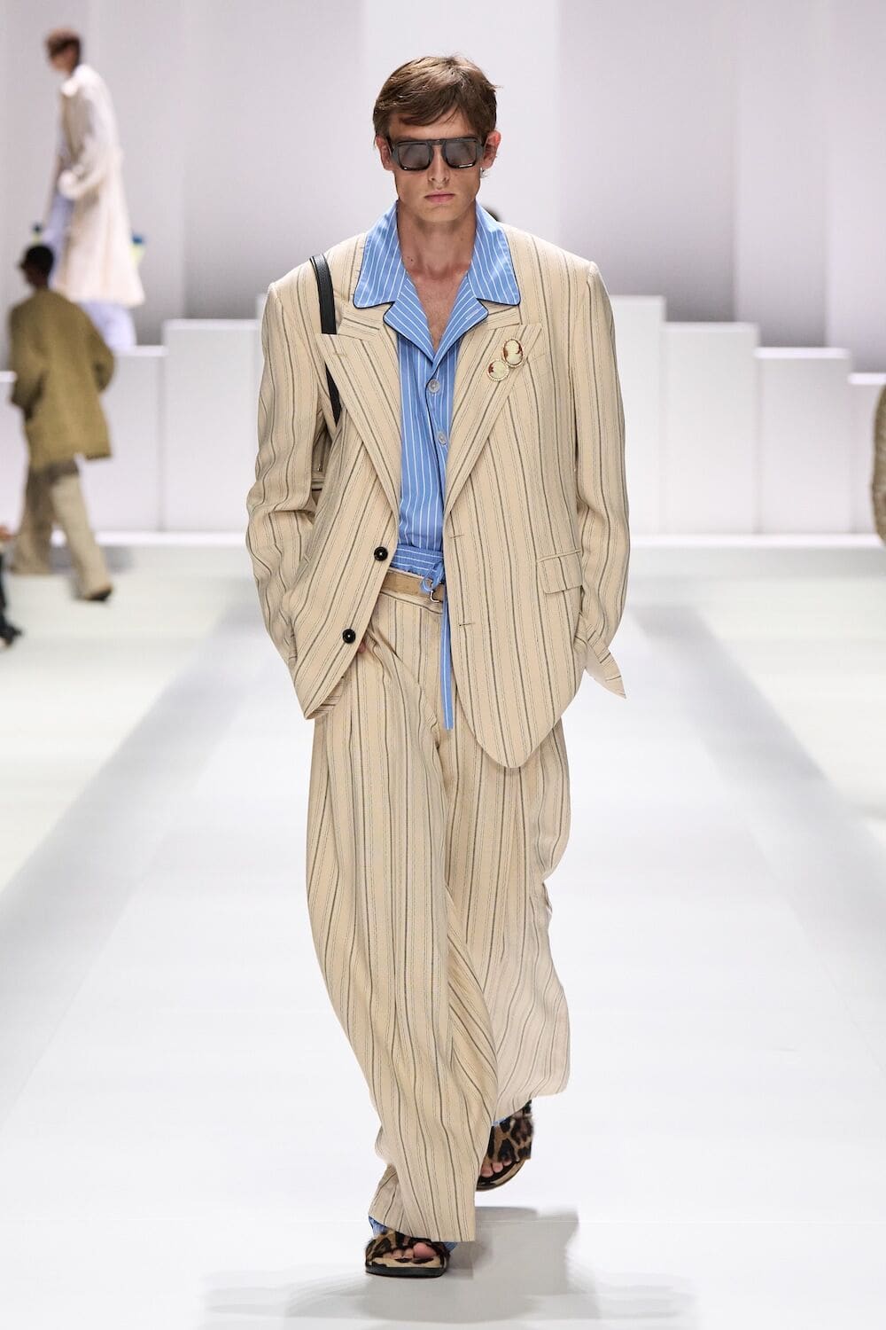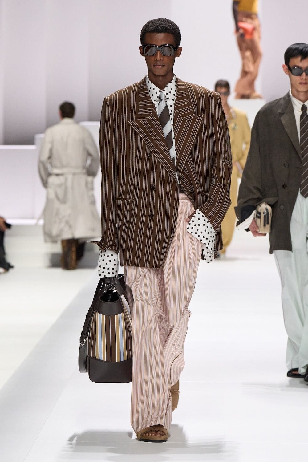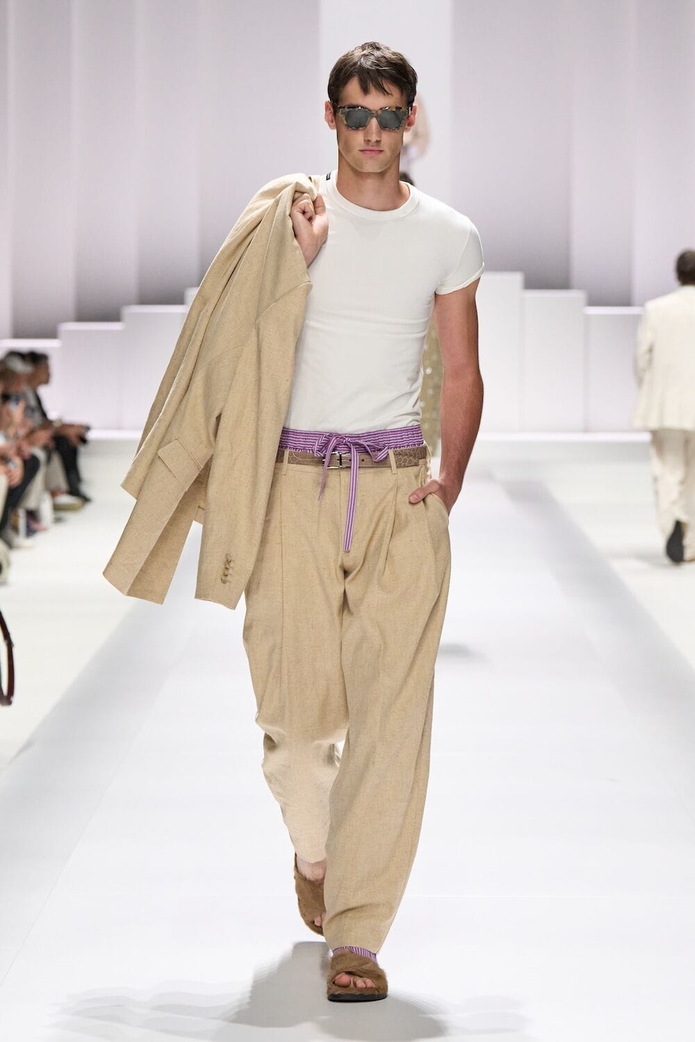 Their building block was your classic pinstriped pyjama, elevated here into an elegant addition to your everyday wardrobe. On the menu was PJ twinsets, cut baggy and left crinkled, in a series of delightful colourways including muddy browns, dusty pinks, pistachios and classic blues. When paired with slouched fisherman jumpers and oversized tux jackets, your beloved home comforts suddenly became as suave as a classic suit trouser.