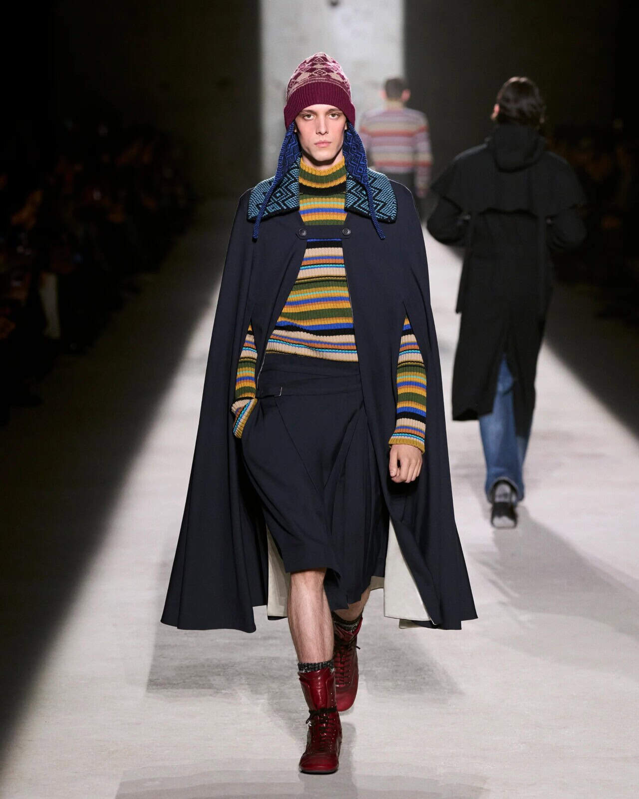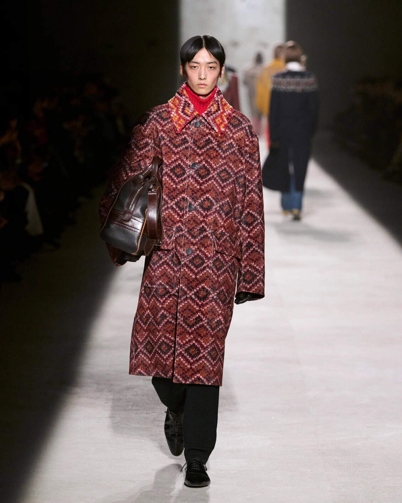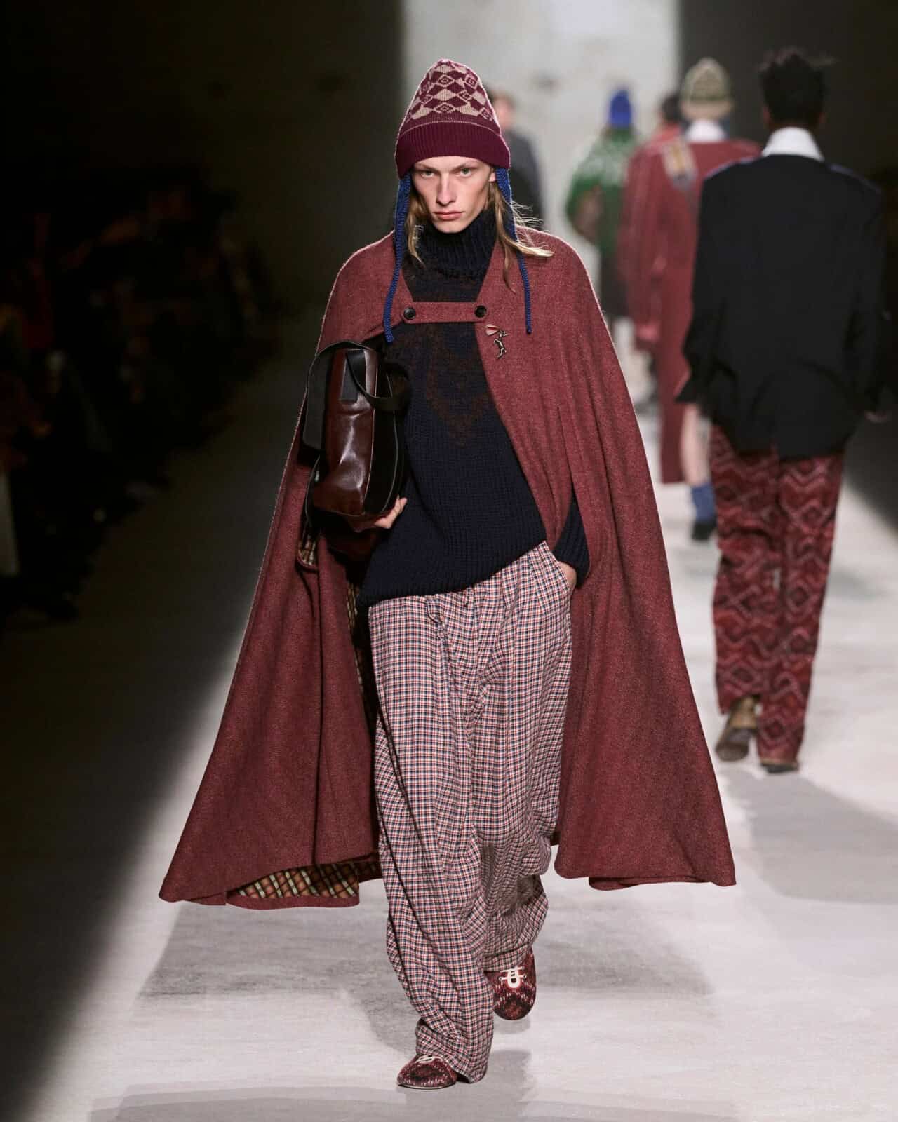 In the words of Klausner, knitwear was “pervasively present”. Desirable knitwear made up the show’s most memorable looks, from chunky Fair Isle and argyle pullovers and adorning accessories such as the collars peeking out of single-breasted coats, elongated woollen scarves and knitted earflaps gently grazing models’ shoulders as they strode down the runway.