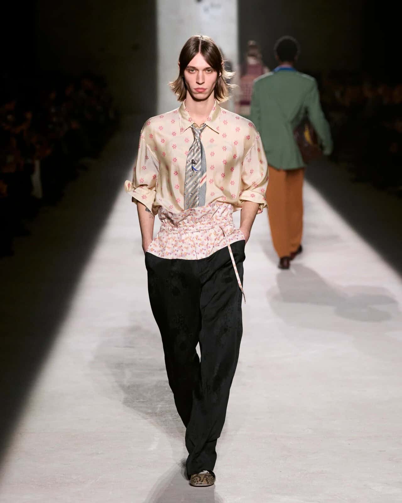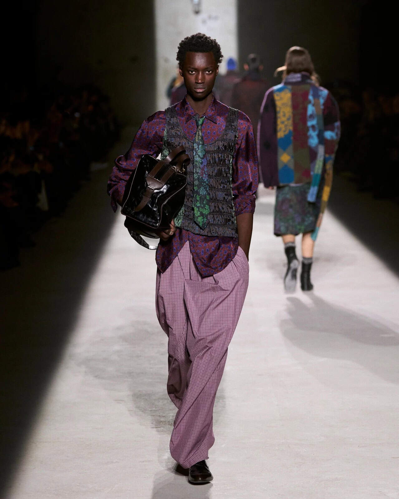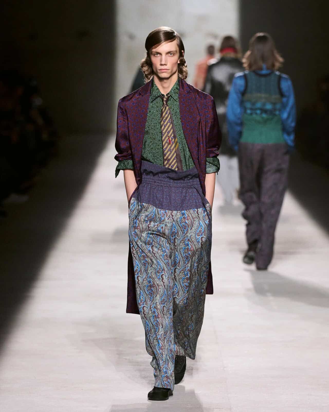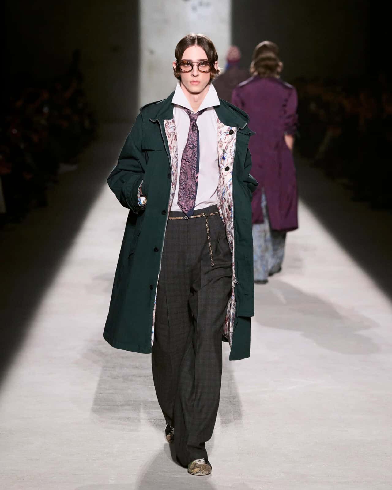 “I wanted to explore the idea of coming of age,” says the Belgian designer of the label’s latest outing. And indeed, the show’s out-of-comfort-zone narrative mirrored that of a city-bound adolescent leaving home for the first time, juxtaposing the comforting familiarity of inherited “friendly clothes” with contemporary, eclectic layering. The finished product shouldn’t work, but it just does. Each and every look is heavily layered and styled in an experimental manner that is interesting but is still distinctively Dries.