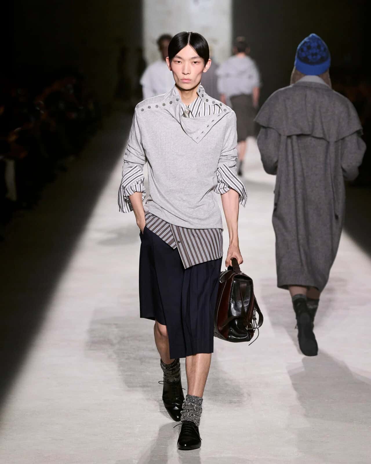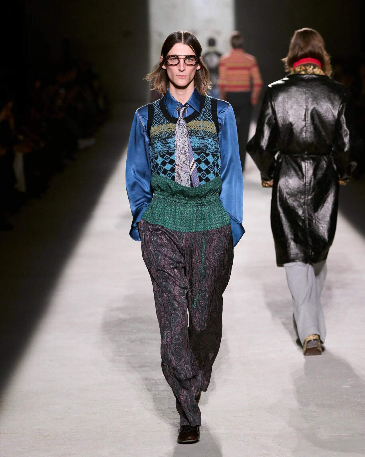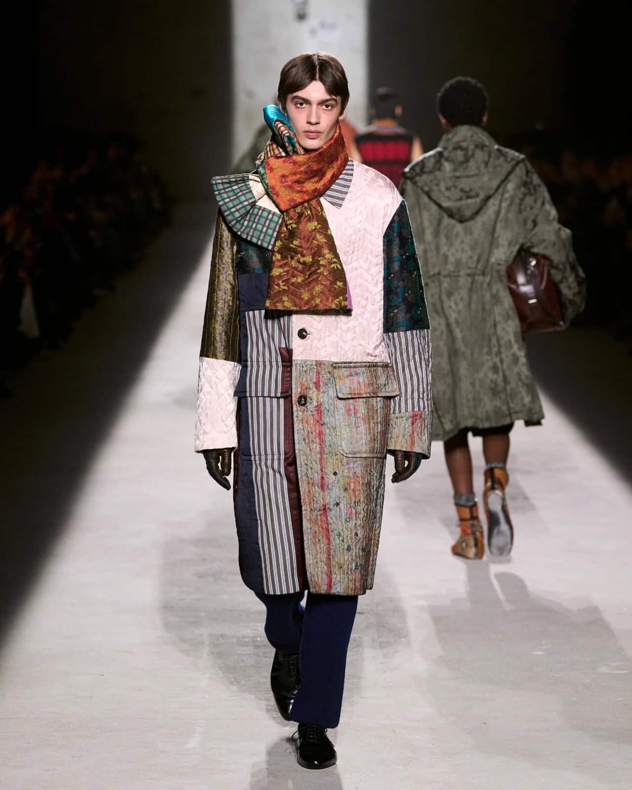 “I wanted to explore the idea of coming of age,” says the Belgian designer of the label’s latest outing. And indeed, the show’s out-of-comfort-zone narrative mirrored that of a city-bound adolescent leaving home for the first time, juxtaposing the comforting familiarity of inherited “friendly clothes” with contemporary, eclectic layering. The finished product shouldn’t work, but it just does. Each and every look is heavily layered and styled in an experimental manner that is interesting but is still distinctively Dries.