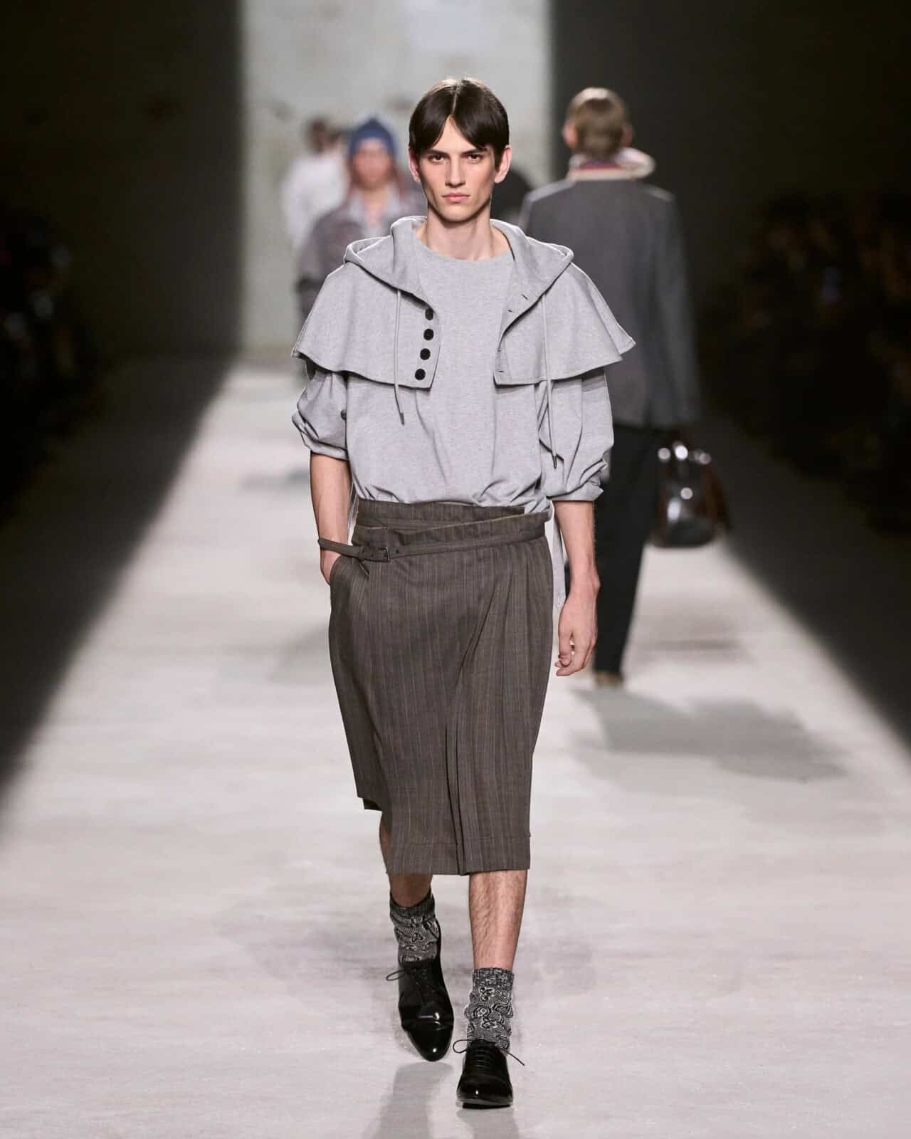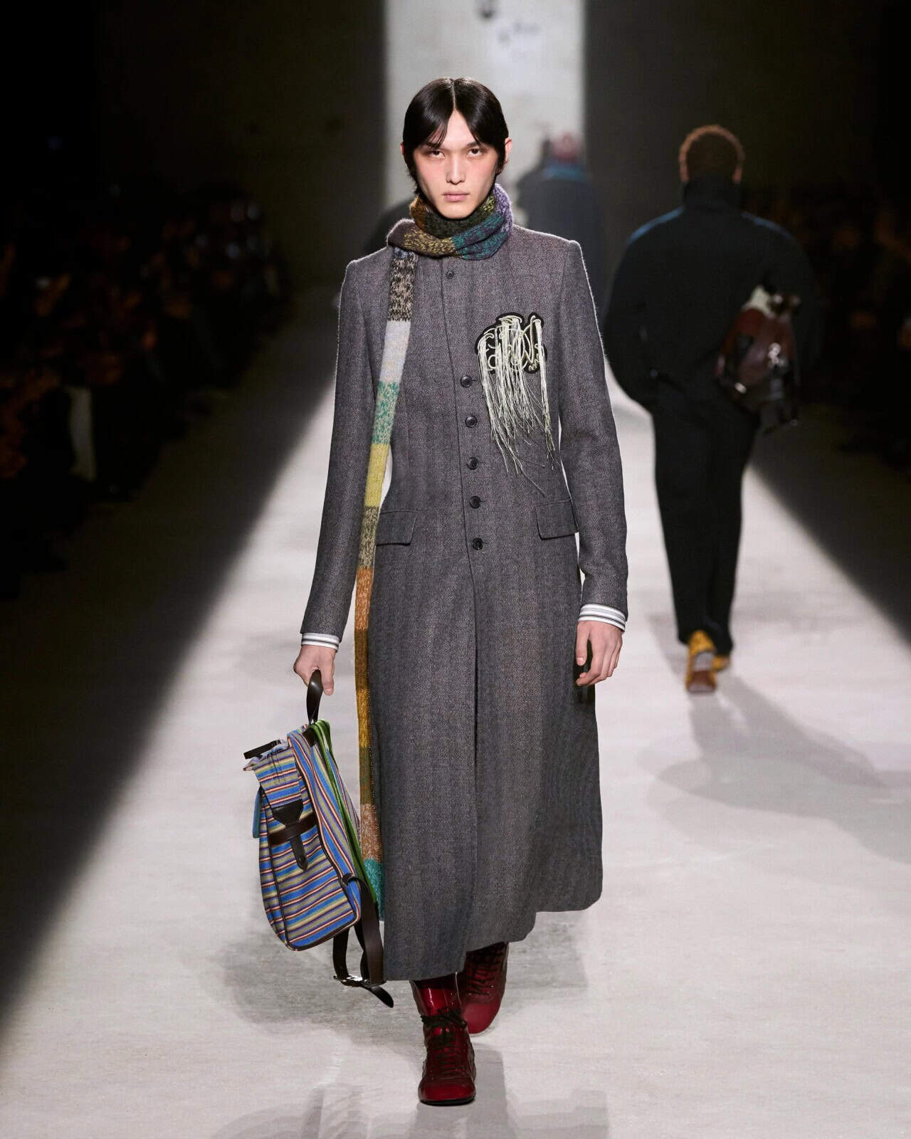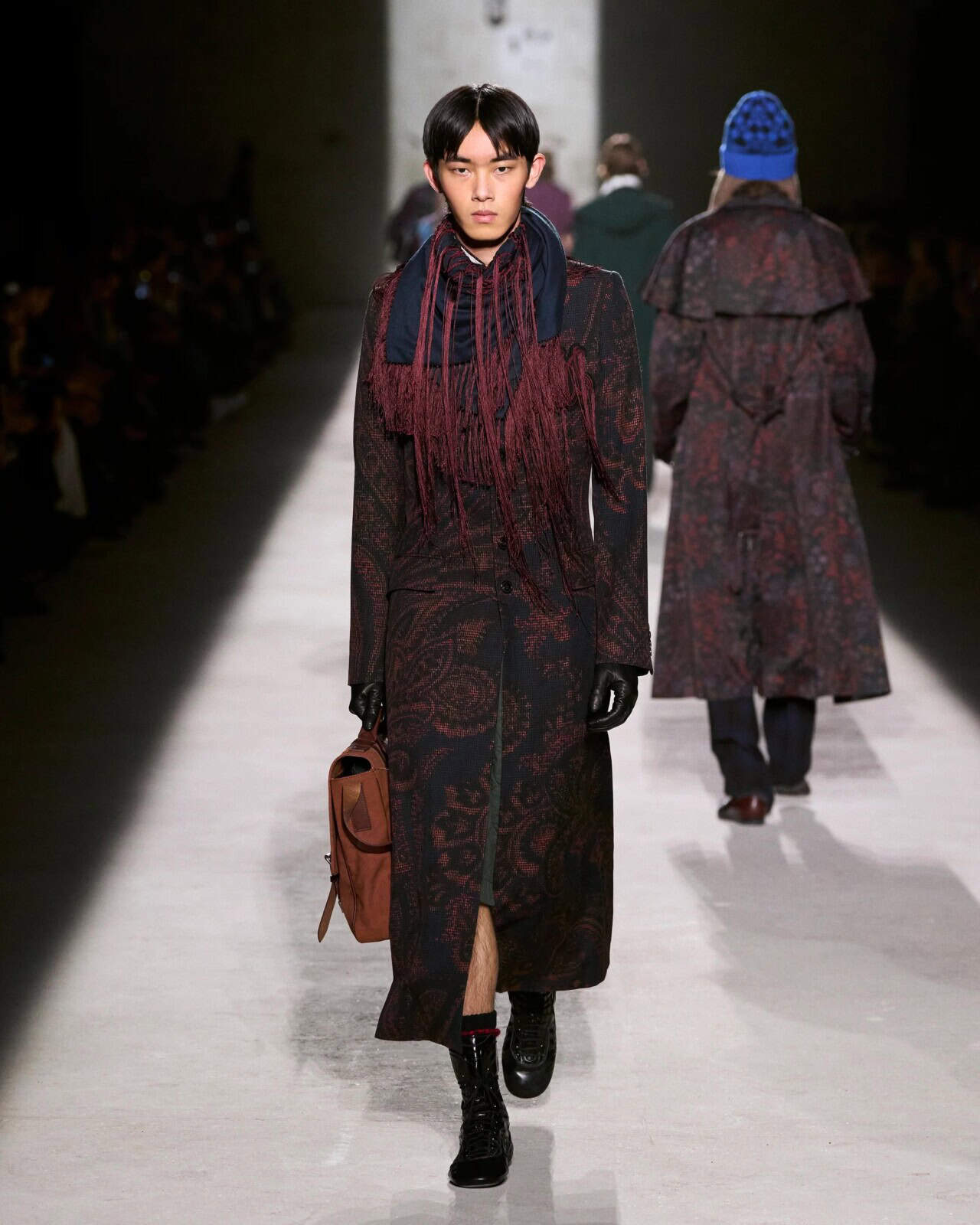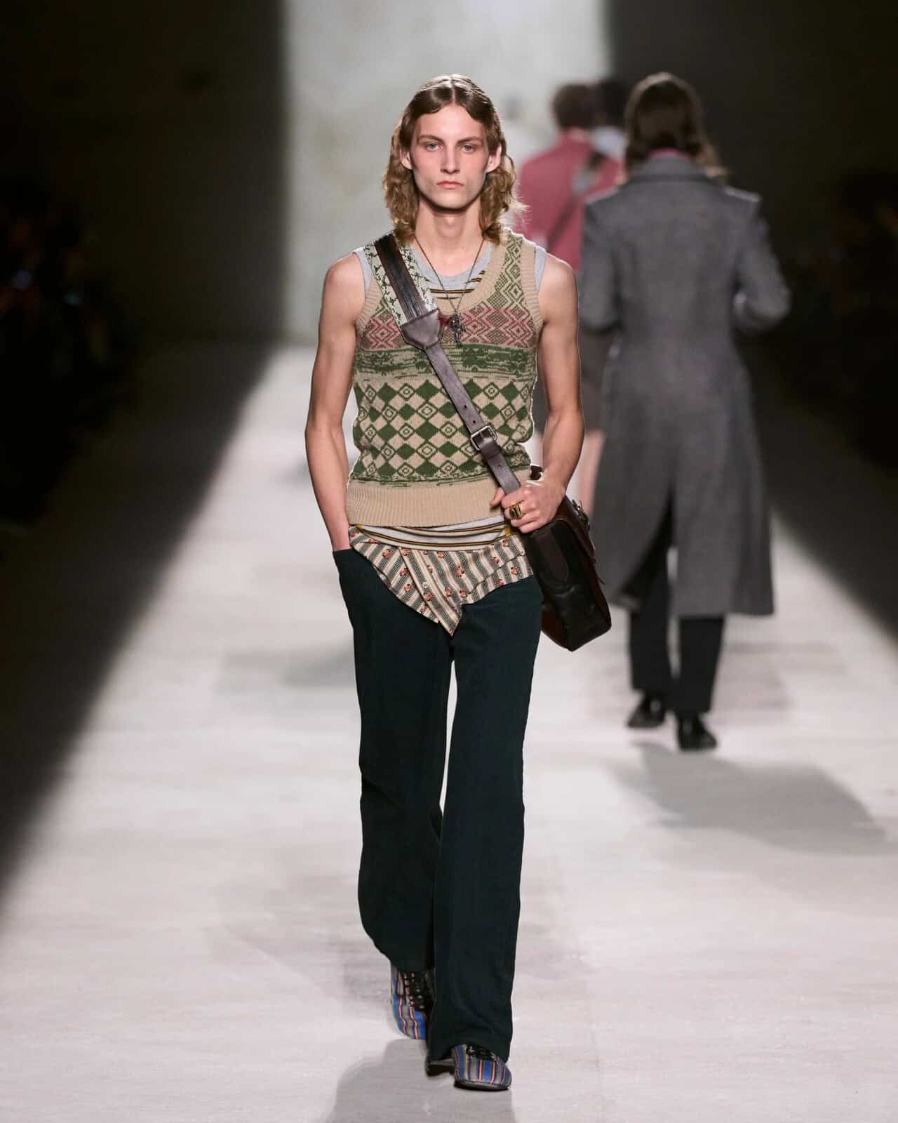 “I wanted to explore the idea of coming of age,” says the Belgian designer of the label’s latest outing. And indeed, the show’s out-of-comfort-zone narrative mirrored that of a city-bound adolescent leaving home for the first time, juxtaposing the comforting familiarity of inherited “friendly clothes” with contemporary, eclectic layering. The finished product shouldn’t work, but it just does. Each and every look is heavily layered and styled in an experimental manner that is interesting but is still distinctively Dries.