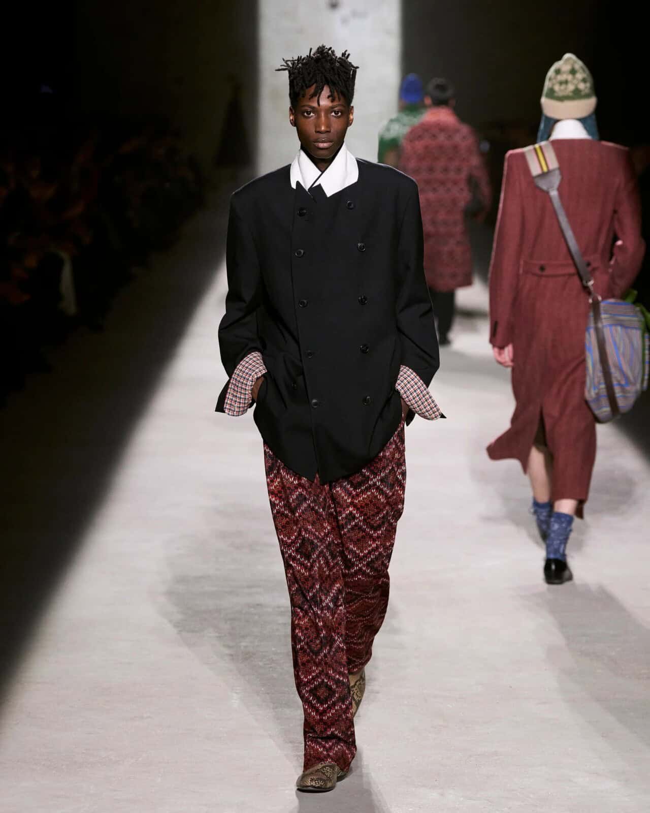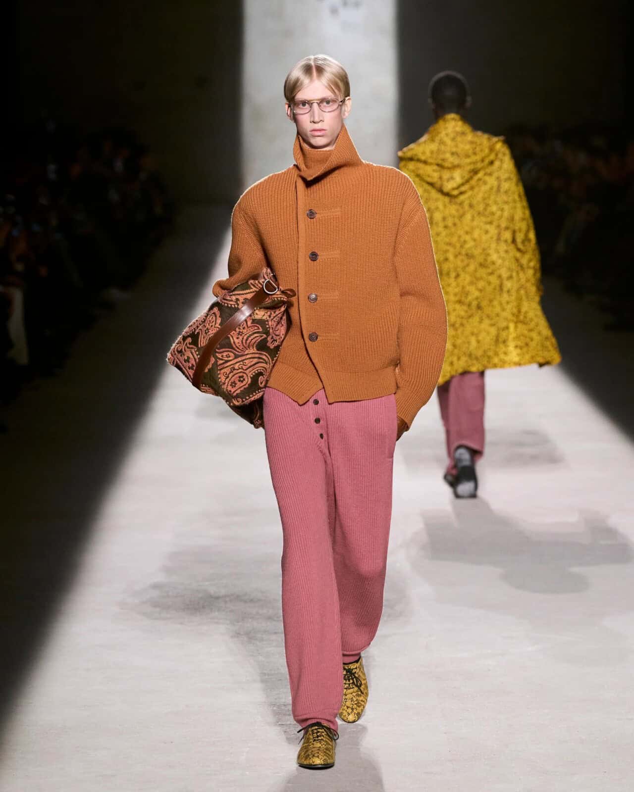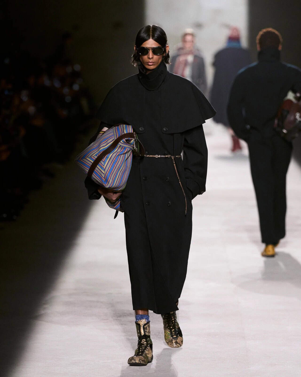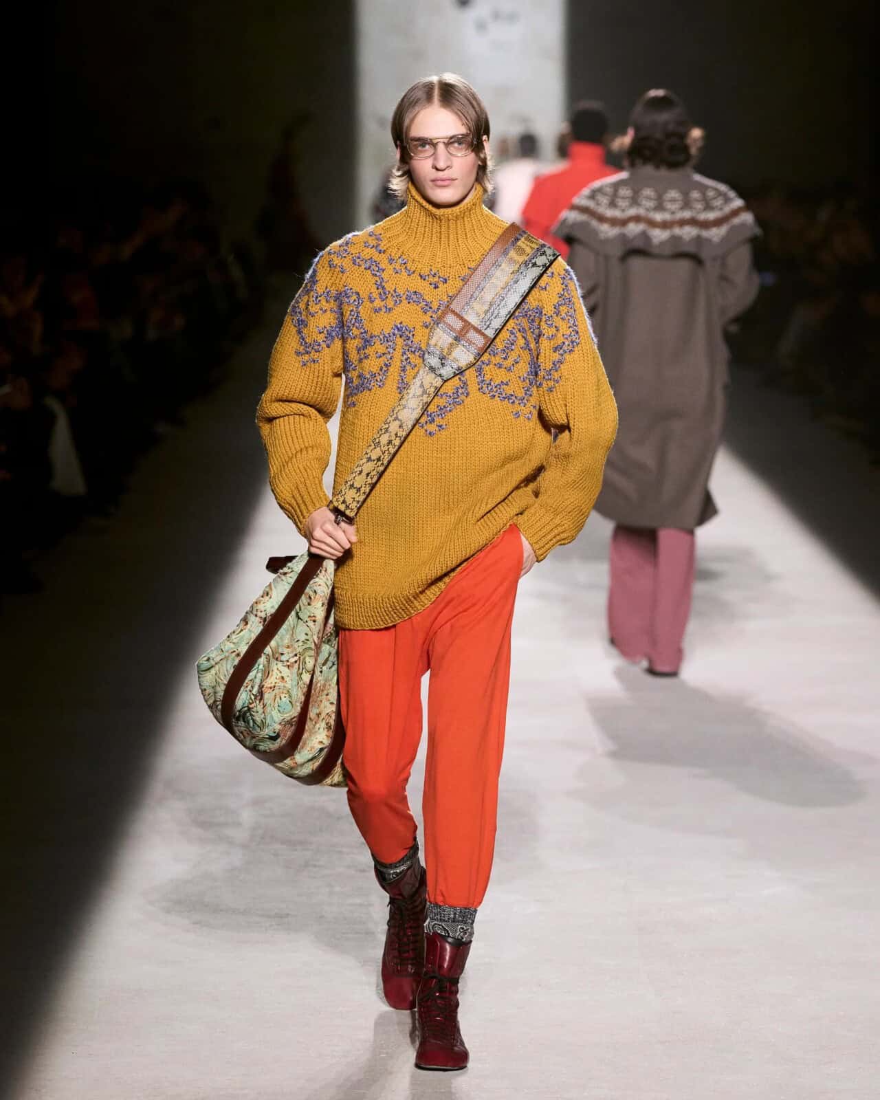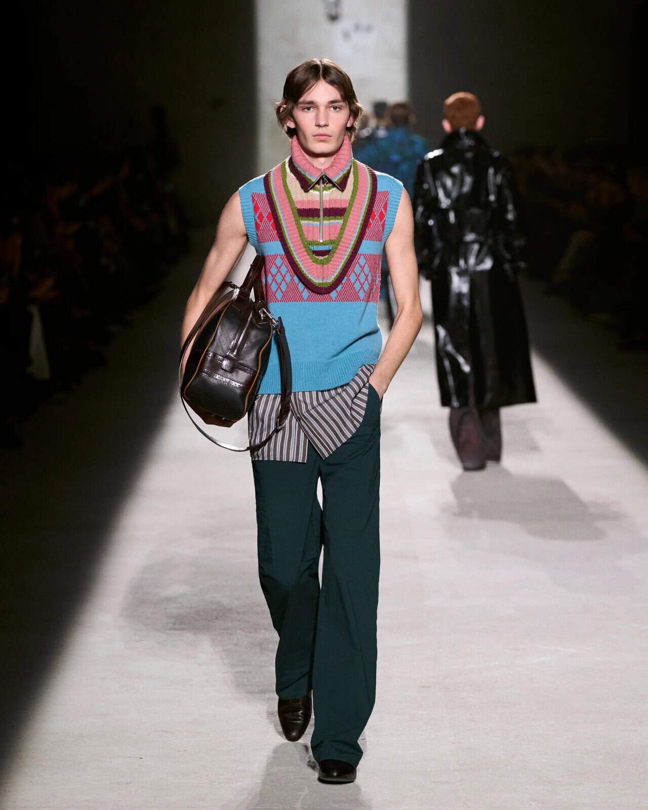 Wide-rimmed, bug-eye glasses, roomy weekend bags and printed shoes added a further dimension of interest to each ensemble, the latter rendered in stripe and snakeskin prints. They were styled with interspliced patterns and unexpectedly bright colour combinations. Such as a striated ribbed turtleneck, the eccentric kind you would expect to see your peculiar yet cool uncle wearing out to dinner… or Harry Styles.