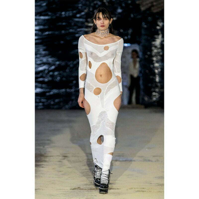 Models, towering high in embellished, upcycled leather platforms made in collaboration with Roker, emerged on the catwalk as if they were stalking the dance floor of legendary north London goth club Slimelight, clad in crushed-velvet prom dresses and bomber jackets with ’80s shoulders, as well as moth-eaten bodycon frocks and ass-flashing, barely-there leotards.