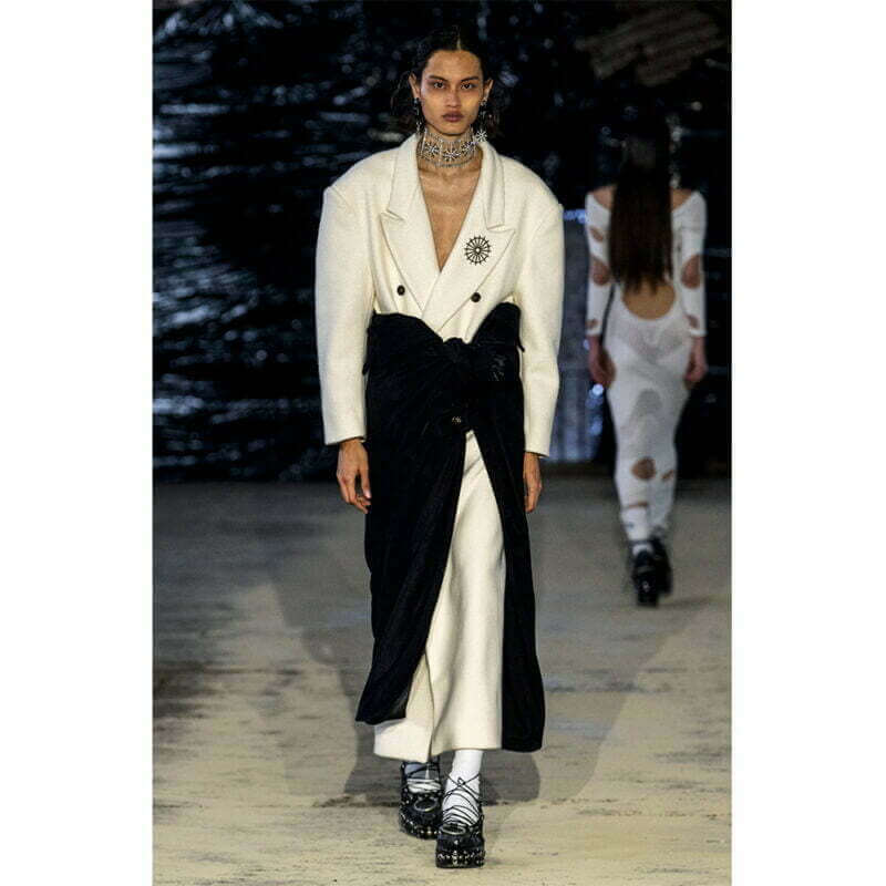 “It was a very conscious decision to have a lot less print and pattern this season,” adds Crutchley. “I think it’s very easy for people when they’re writing reviews to pigeonhole what you do. Yes, there are the prints and the textiles, but there is more going on here. I do think about shapes, I do think about what I’m saying through the silhouette. So, yes, it was very deliberate to do these much starker, plainer pieces.”